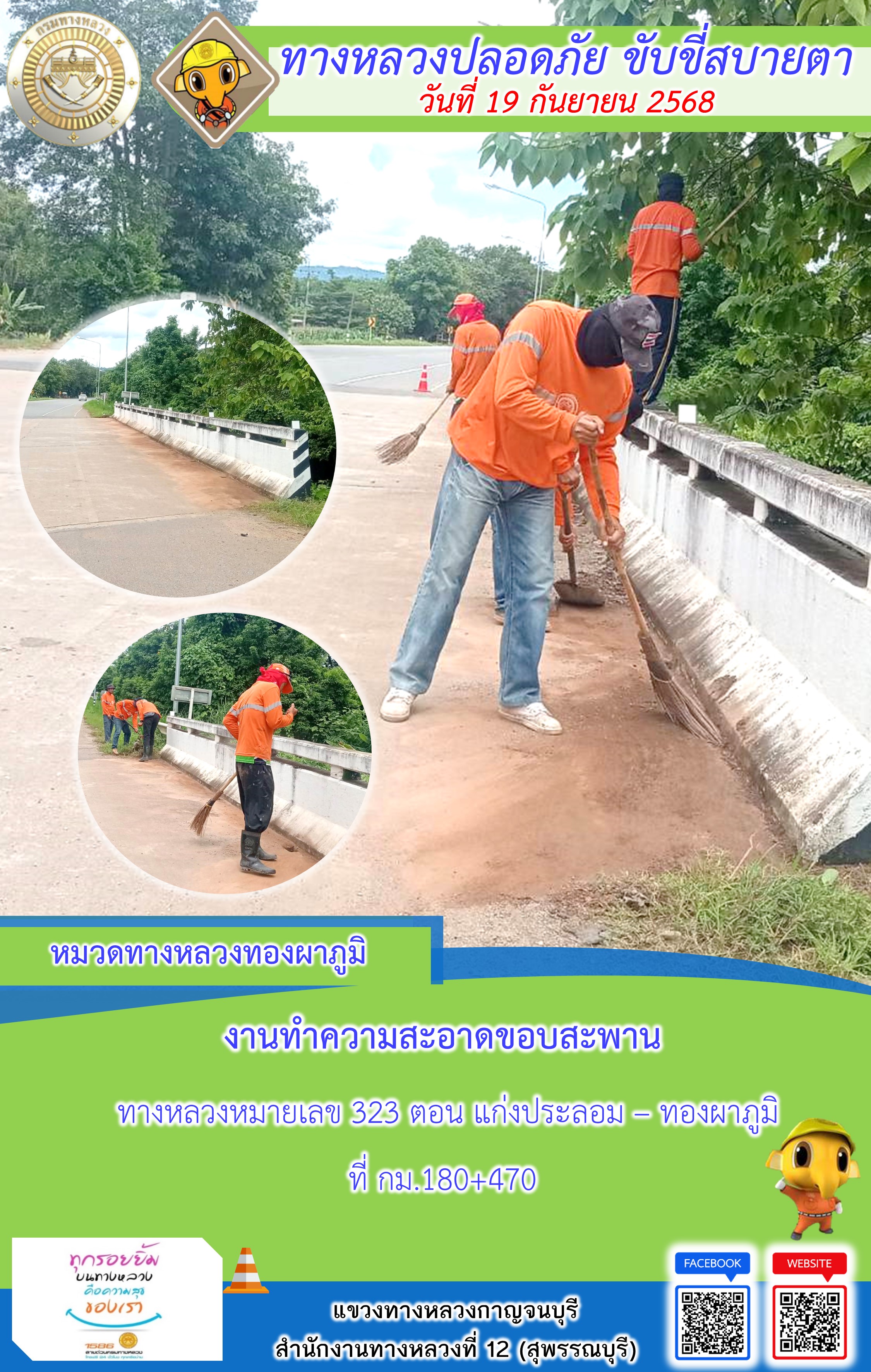 แขวงทางหลวงกาญจนบุรี โดยหมวดทางหลวงในสังกัด และงานอำนวยความปลอดภัยปฏิบัติงาน ประจำวันที่ 19 ก.ย. 68