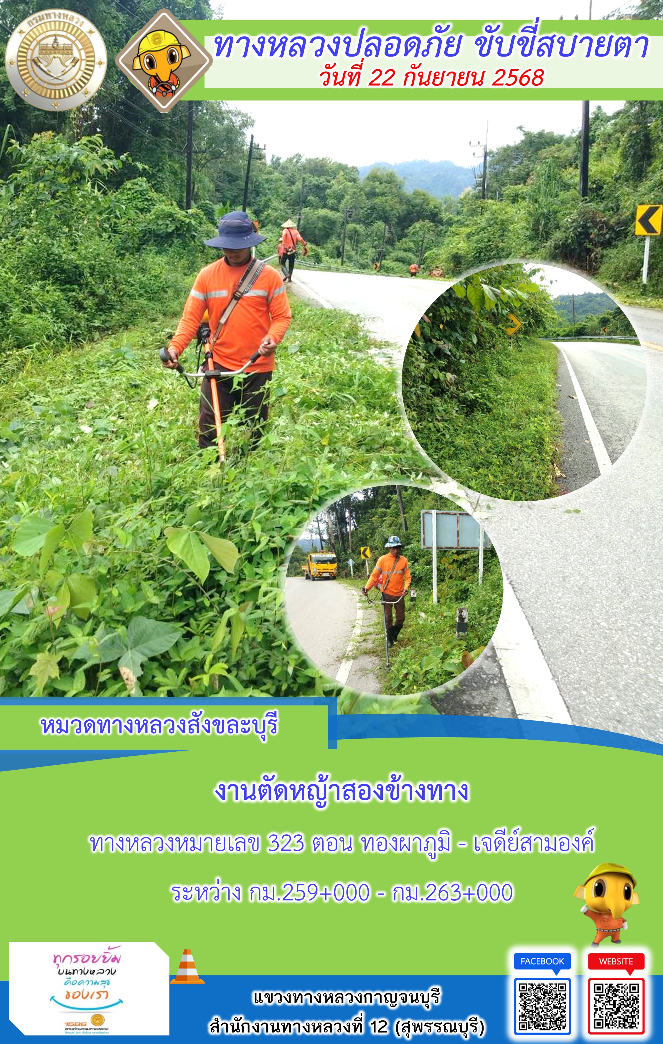 แขวงทางหลวงกาญจนบุรี โดยหมวดทางหลวงในสังกัด และงานอำนวยความปลอดภัยปฏิบัติงาน ประจำวันที่ 22 ก.ย. 68