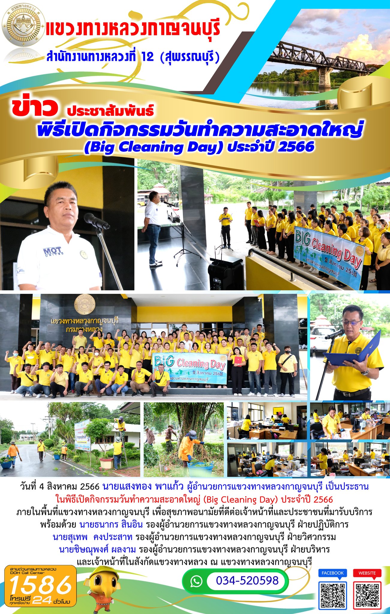 วันที่ 4 สิงหาคม 2566 นายแสงทอง พาแก้ว ผู้อำนวยการแขวงทางหลวงกาญจนบุรี เป็นประธานในพิธีเปิดกิจกรรมวันทำความสะอาดใหญ่ (Big Cleaning Day) ประจำปี 2566 ภายในพื้นที่แขวงทางหลวงกาญจนบุรี