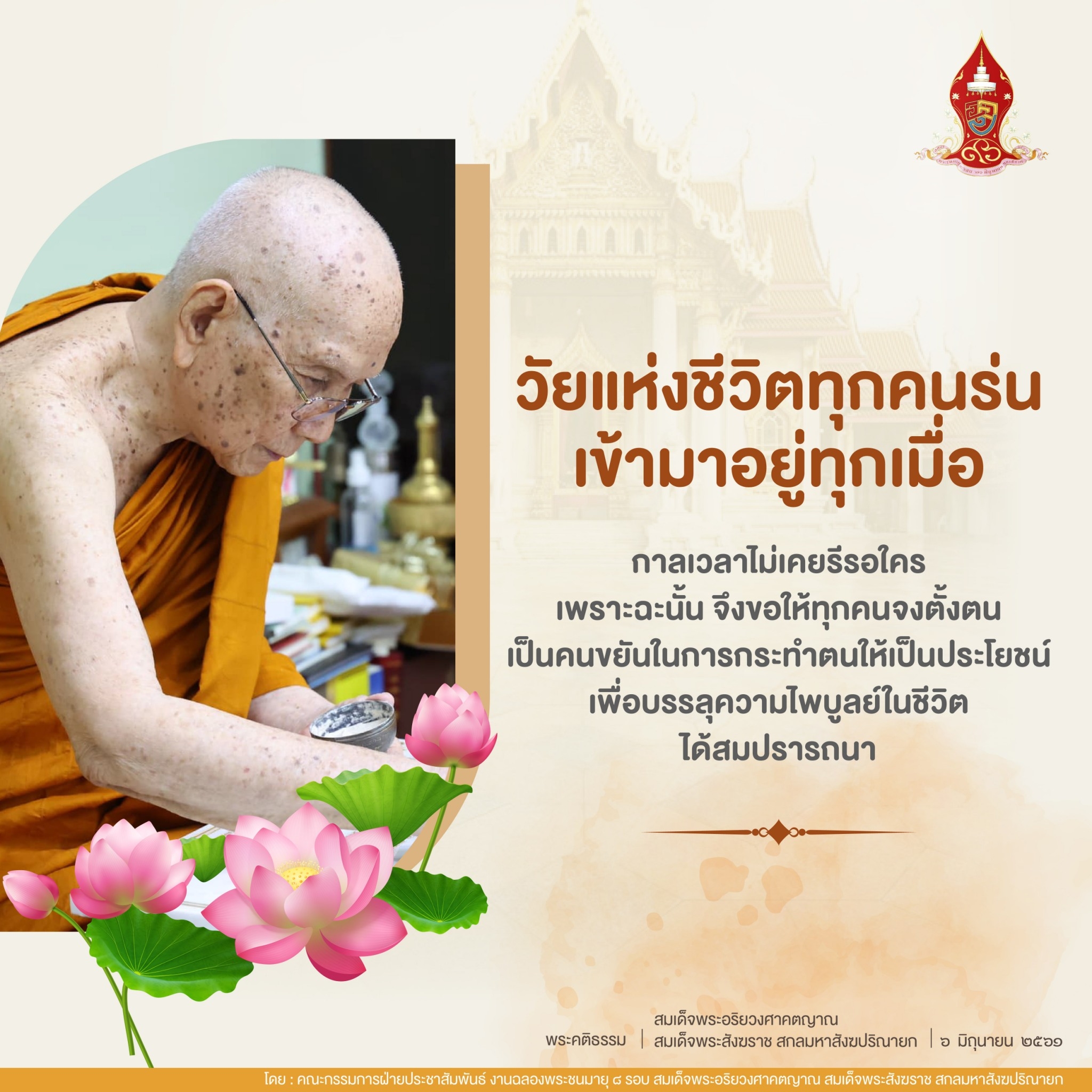 วัยแห่งชีวิตทุกคนร่นเข้ามาอยู่ทุกเมื่อ กาลเวลาไม่เคยรีรอใคร เพราะฉะนั้น จึงขอให้ทุกคนจงตั้งตนเป็นคนขยันในการกระทำตนให้เป็นประโยชน์ เพื่อบรรลุความไพบูลย์ในชีวิตได้สมปรารถนา
