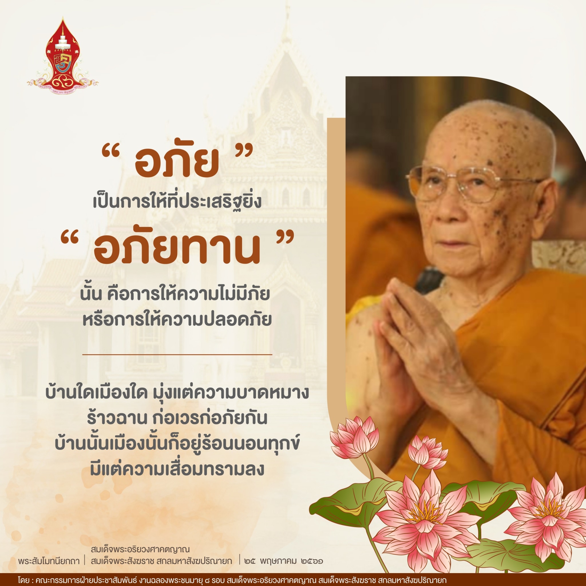 สมเด็จพระสัมมาสัมพุทธเจ้า ทรงสั่งสอนพุทธบริษัทไว้ว่า "ความสุขอื่น ยิ่งกว่าความสงบไม่มี" แต่การจะพบกับความสงบจนมีใจเป็นสุขได้ ก็จะไม่มีเช่นกัน หากเราทั้งหลายไม่รู้จักการเอื้อเฟื้อให้ปันแก่กันและกัน โดยเฉพาะอย่างยิ่งการให้ "อภัย" อันเป็นการให้ที่ประเสริฐยิ่ง "อภัยทาน" นั้น คือการให้ความไม่มีภัย หรือการให้ความปลอดภัย บ้านใดเมืองใด พลเมืองมุ่งแต่ความบาดหมาง ร้าวฉาน ก่อเวรก่อภัยกัน บ้านนั้นเมืองนั้นก็อยู่ร้อนนอนทุกข์ มีแต่ความเสื่อมทรามลง