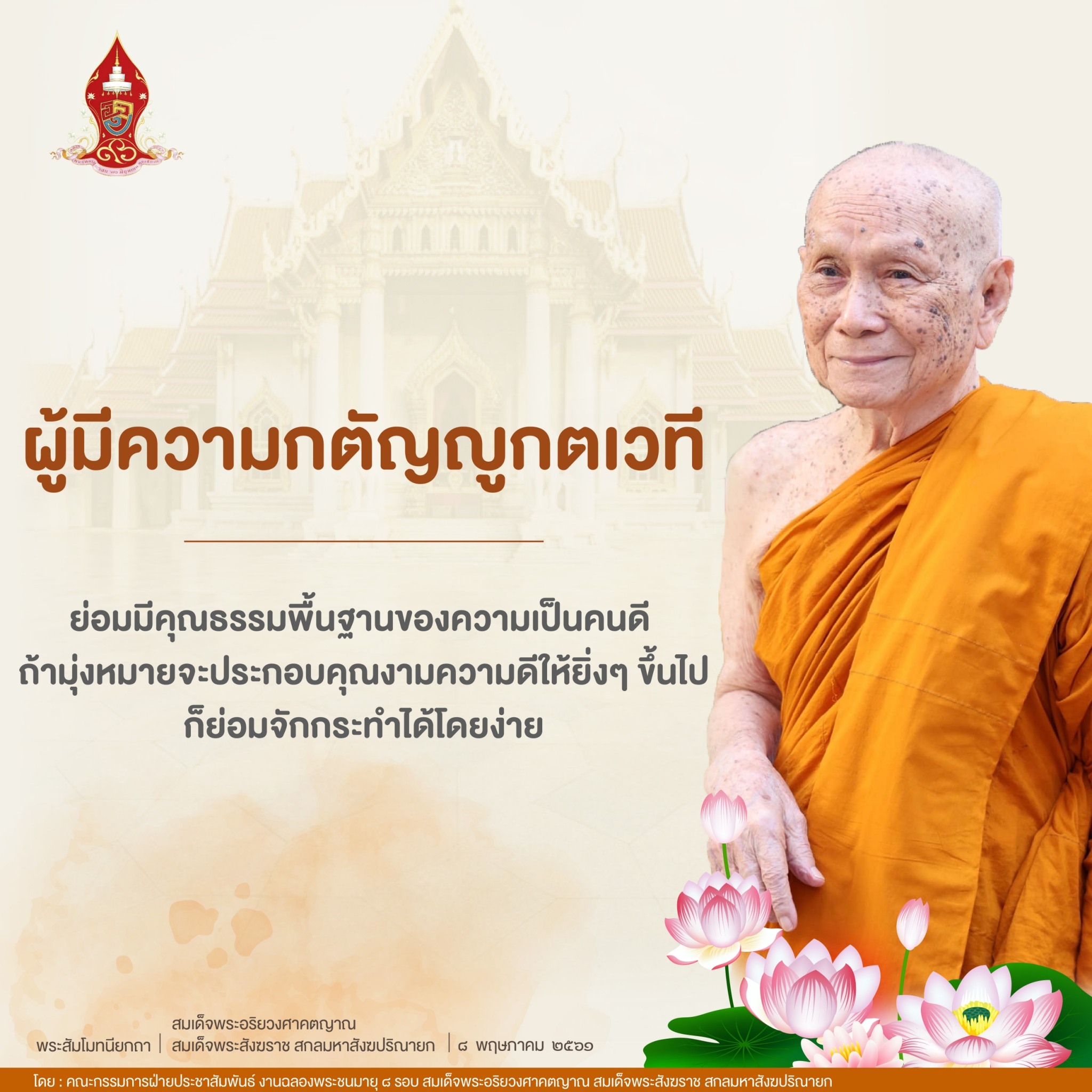 ผู้มีความกตัญญูกตเวที ย่อมมีคุณธรรมพื้นฐานของความเป็นคนดี ถ้ามุ่งหมายจะประกอบคุณงามความดีให้ยิ่งๆ ขึ้นไปก็ย่อมจักกระทำได้โดยง่าย สมดังพระพุทธภาษิตที่ว่า "ความกตัญญูกตเวที เป็นพื้นภูมิของคนดี" และเมื่อขึ้นชื่อว่าเป็นคนดี มีฉันทะในการบำเพ็ญคุณงามความดีอยู่เสมอ ผลดี คือความสุขความเจริญ ย่อมจักบังเกิดขึ้นแก่บุคคล ผู้สั่งสมเหตุอันดีงามไว้แล้วเสมือนบุคคลผู้หว่านพืชเช่นไร ก็ย่อมได้รับผลเช่นนั้นนั่นเอง
