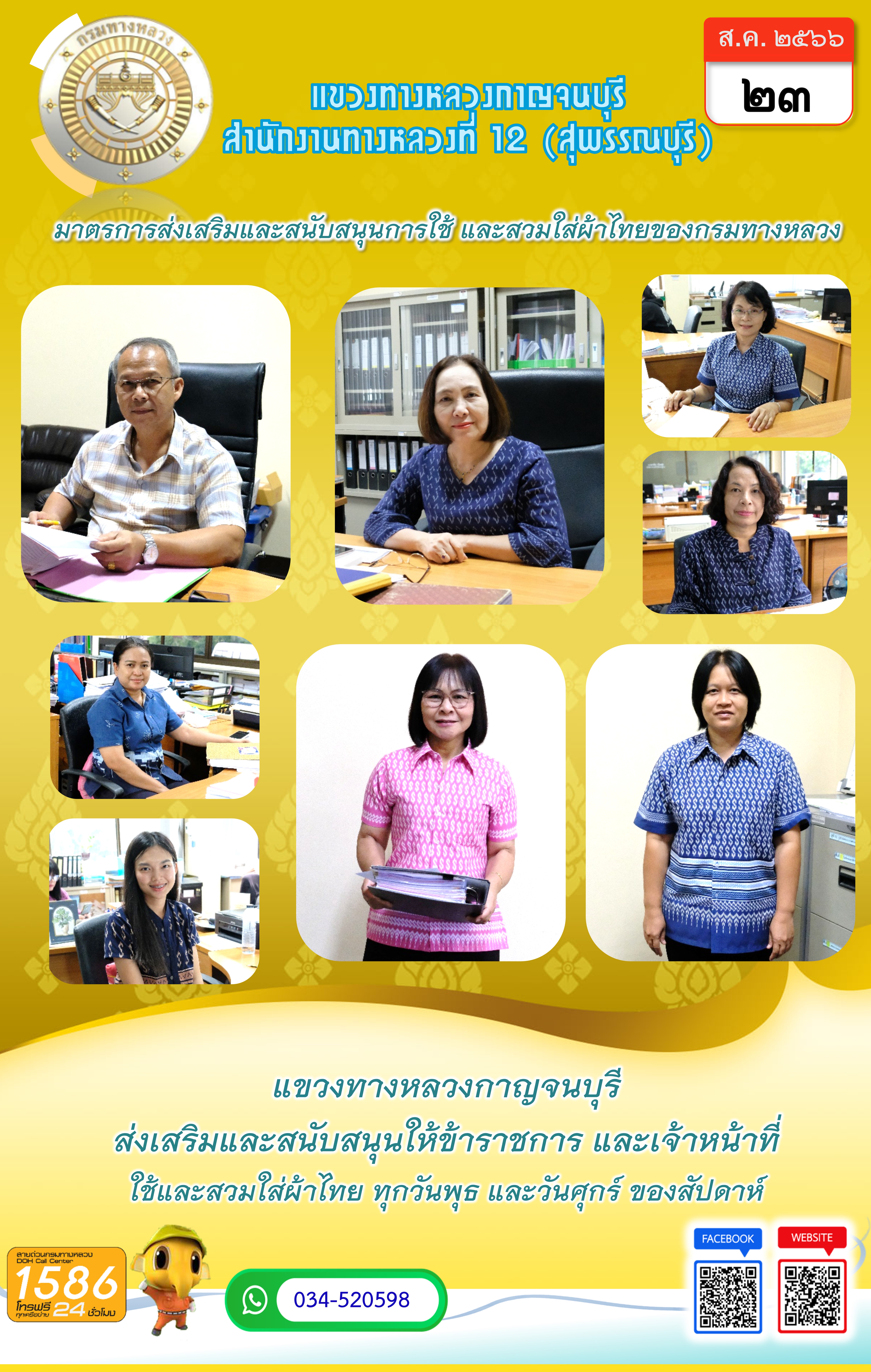 วันที่ 23 ส.ค. 2566 แขวงทางหลวงกาญจนบุรี รณรงค์แต่งกายด้วยผ้าไทยเพื่อส่งเสริมและสนับสนุนการใช้และสวมใส่ผ้าไทย เป็นการอนุรักษ์และสืบสานภูมิปัญญาของไทย สร้างค่านิยมและการตระหนักรับรู้การรักษามรดกและอัตลักษณ์ภูมิปัญญาของไทย
