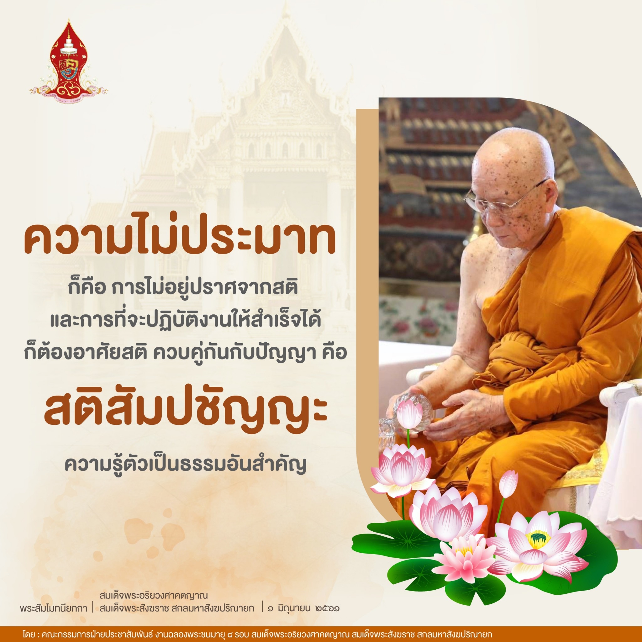 สมเด็จพระสัมมาสัมพุทธเจ้า ทรงพระอนุศาสน์สั่งสอนพุทธบริษัทมิให้ประมาท ดังความตอนหนึ่ง ว่า "อย่ามัวแต่ประมาท อย่ามัวแต่สนิทชิดชอบในกาม เพราะผู้ไม่ประมาท พิจารณาอยู่ ย่อมถึงบรมสุข"