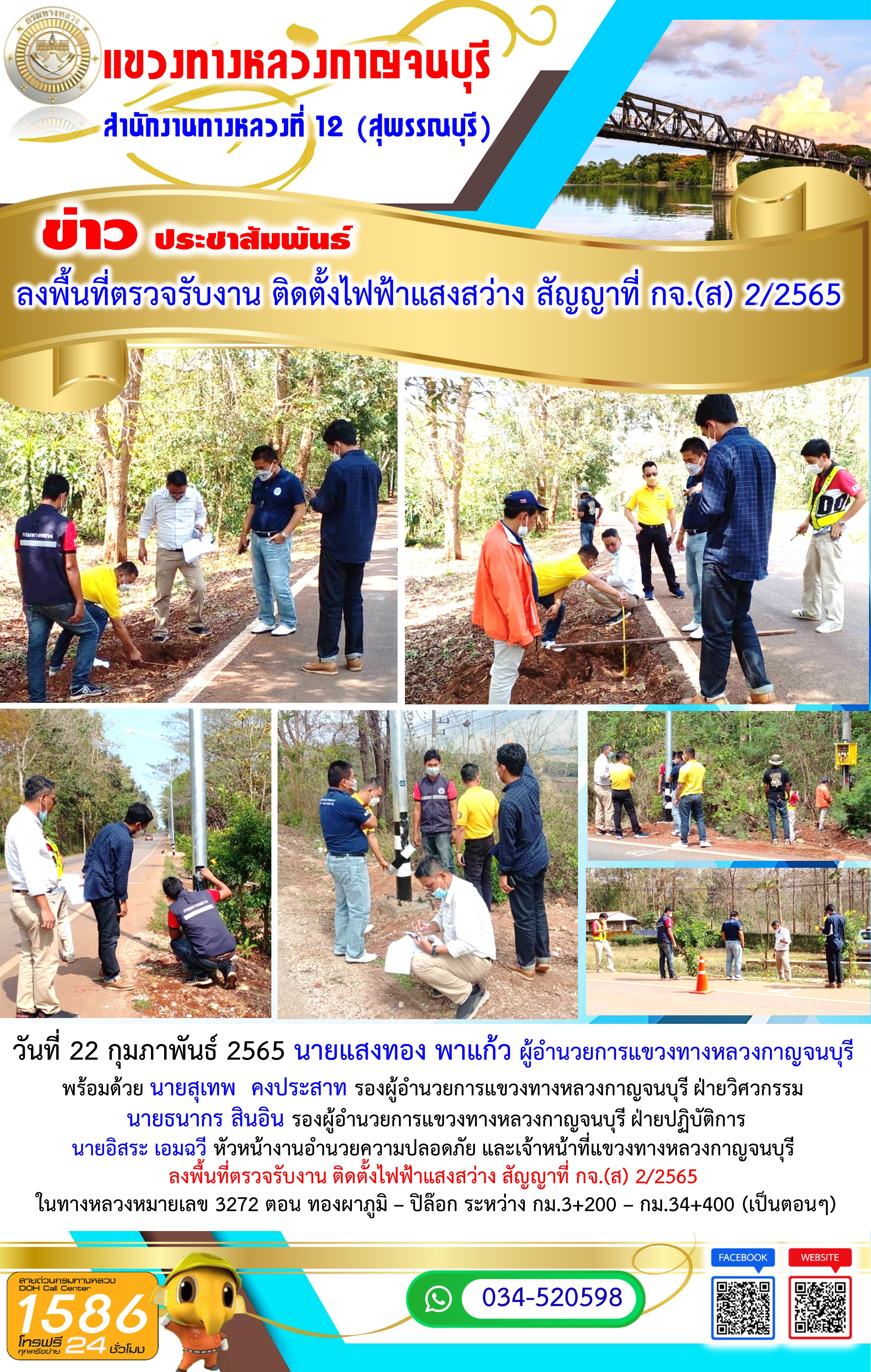 วันที่ 24 กุมภาพันธ์ 2565 นายแสงทอง พาแก้ว ผู้อำนวยการแขวงทางหลวงกาญจนบุรี พร้อมด้วย นายสุเทพ คงประสาท รองผู้อำนวยการแขวงทางหลวงกาญจนบุรี ฝ่ายวิศวกรรม นายธนากร สินอิน รองผู้อำนวยการแขวงทางหลวงกาญจนบุรี ฝ่ายปฏิบัติการ นายอิสระ เอมฉวี หัวหน้างานอำนวยความปลอดภัย และเจ้าหน้าที่แขวงทางหลวงกาญจนบุรี ลงพื้นที่ตรวจรับงาน ติดตั้งไฟฟ้าแสงสว่าง สัญญาที่ กจ.(ส) 1/2565 ในทางหลวงหมายเลข 3084 ตอน ท่าม่วง – หนองขาว ระหว่าง กม.1+500 – กม.7+850 (เป็นตอนๆ)