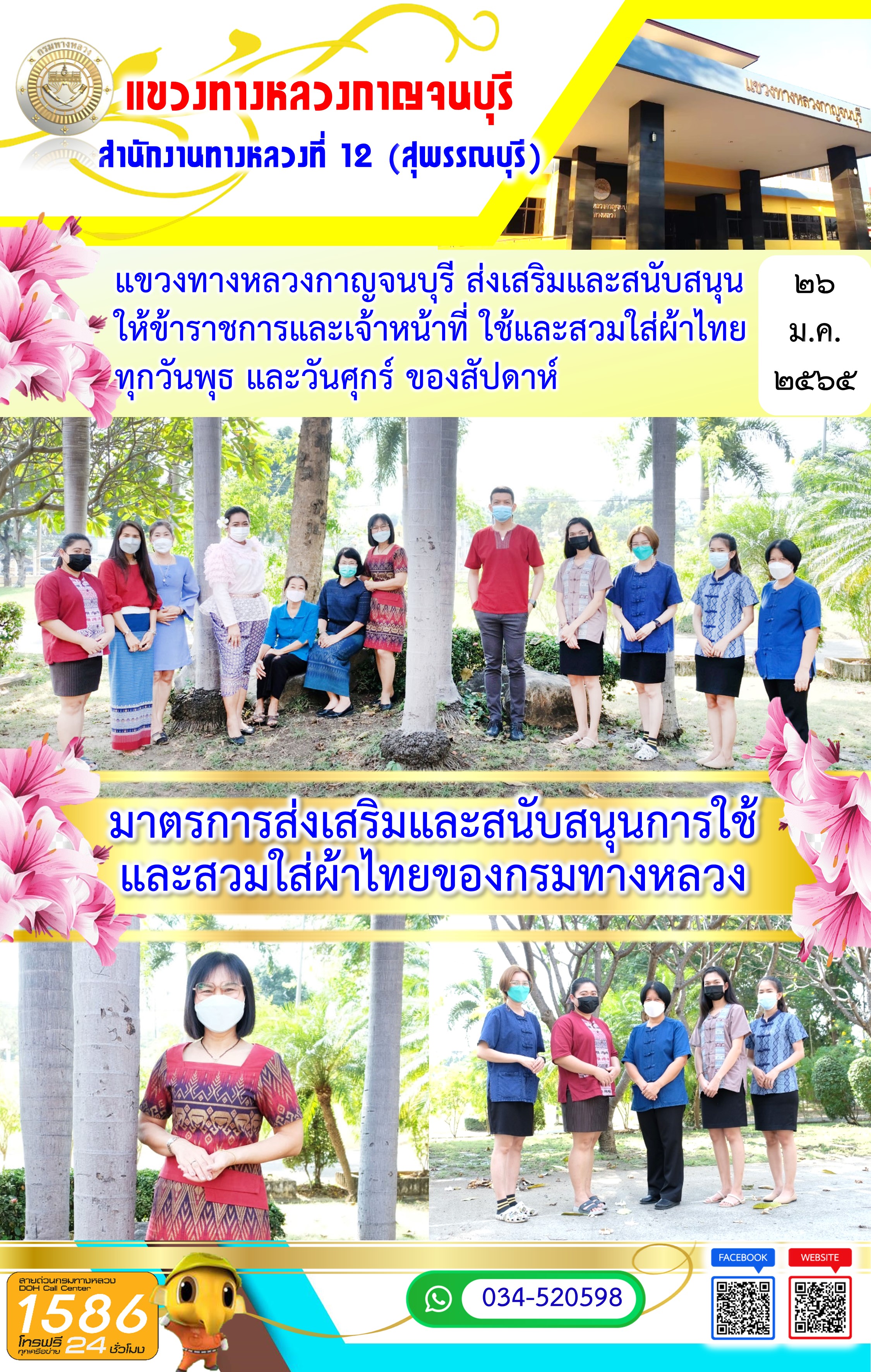 วันที่ 26 ม.ค. 2565 แขวงทางหลวงกาญจนบุรี รณรงค์แต่งกายด้วยผ้าไทยเพื่อส่งเสริมและสนับสนุนการใช้และสวมใส่ผ้าไทย เป็นการอนุรักษ์และสืบสานภูมิปัญญาของไทย สร้างค่านิยมและการตระหนักรับรู้การรักษามรดกและอัตลักษณ์ภูมิปัญญาของไทย #กรมทางหลวง #สายด่วนกรมทางหลวง1586 #แขวงทางหลวงกาญจนบุรี โทร 034-520-598