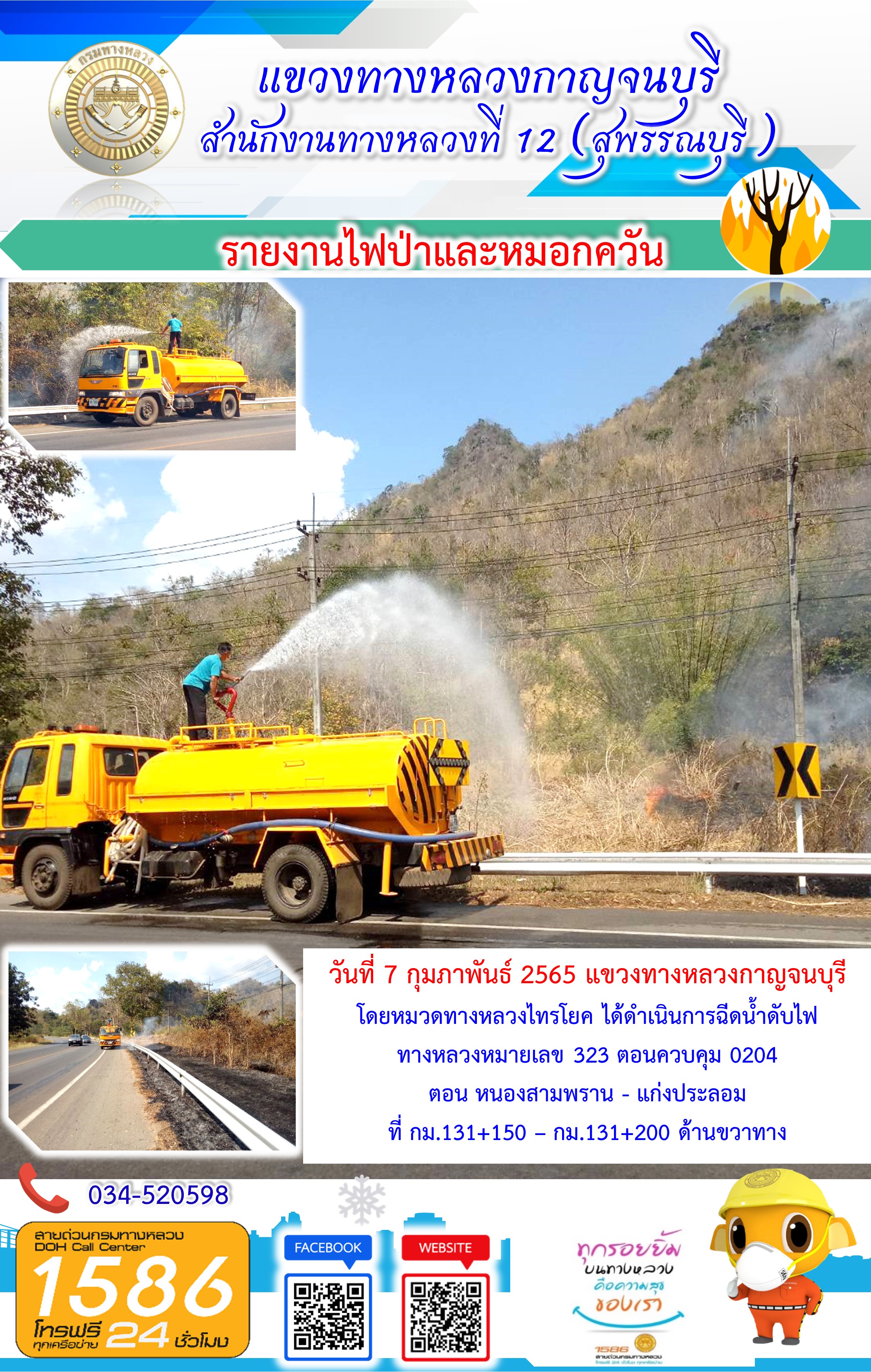 วันที่ 7 กุมภาพันธ์ 2565 แขวงทางหลวงกาญจนบุรี โดยหมวดทางหลวงไทรโยค ได้ดำเนินการฉีดน้ำดับไฟ ทางหลวงหมายเลข 323 ตอนควบคุม 0204 ตอน หนองสามพราน - แก่งประลอม ที่ กม.131+150 – กม.131+200 ด้านขวาทาง
