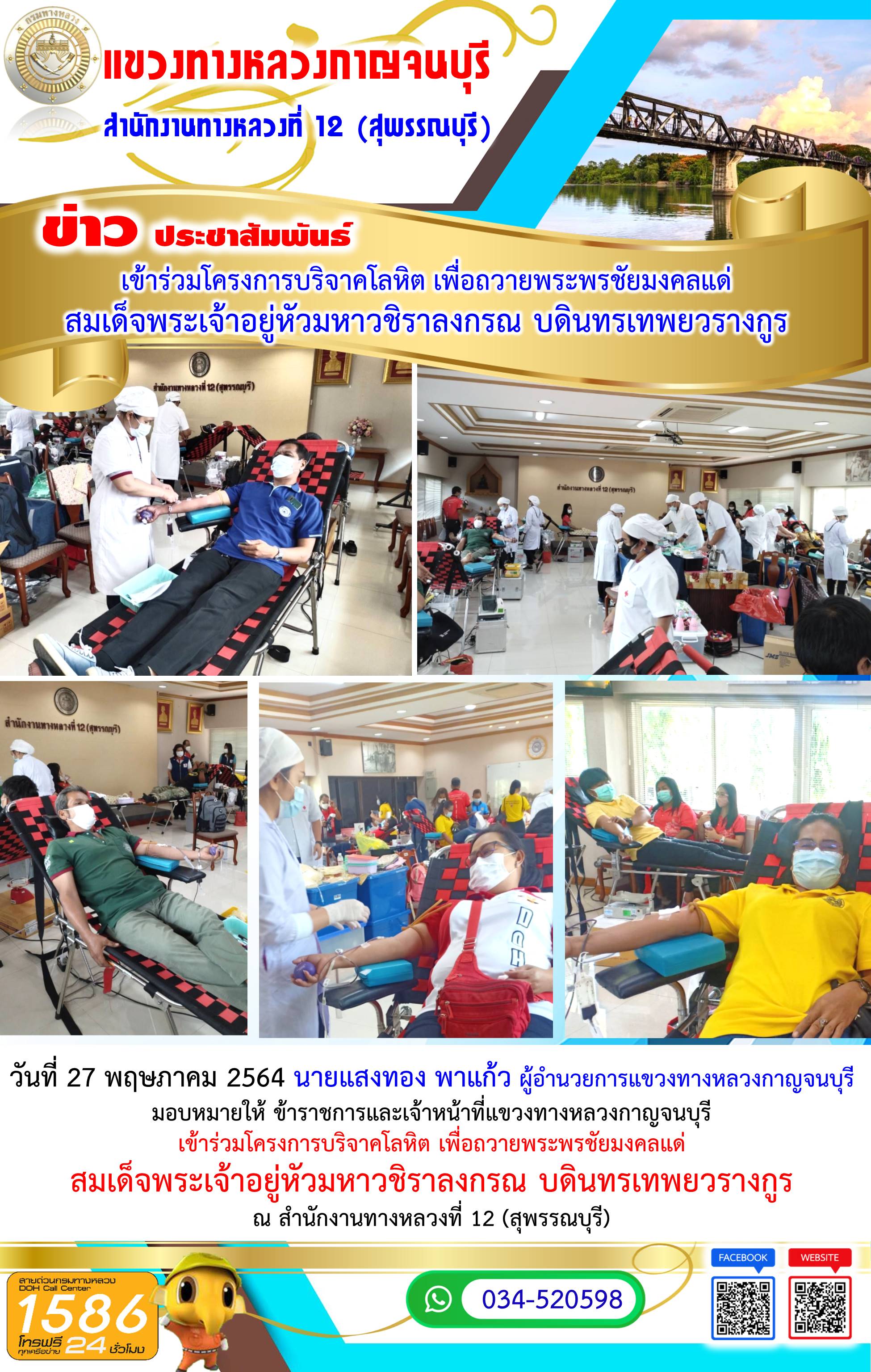 วันที่ 27 พฤษภาคม 2564 นายแสงทอง พาแก้ว ผู้อำนวยการแขวงทางหลวงกาญจนบุรี มอบหมายให้ ข้าราชการและเจ้าหน้าที่แขวงทางหลวงกาญจนบุรี เข้าร่วมโครงการบริจาคโลหิต เพื่อถวายพระพรชัยมงคลแด่ สมเด็จพระเจ้าอยู่หัวมหาวชิราลงกรณ บดินทรเทพยวรางกูร ณ สำนักงานทางหลวงที่ 12 (สุพรรณบุรี)