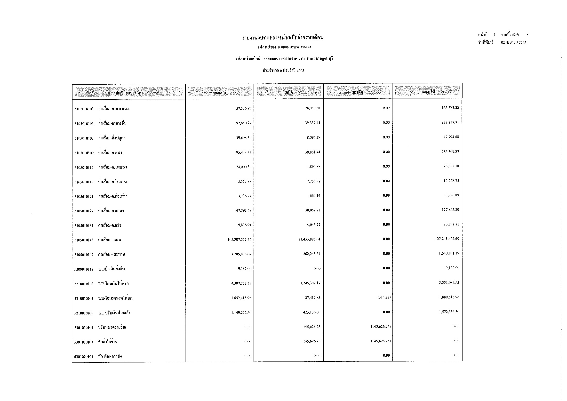 รายงานงบทดลองหน่วยเบิกจ่ายรายเดือน ประจำงวด 7 ประจำปีที่ 2563