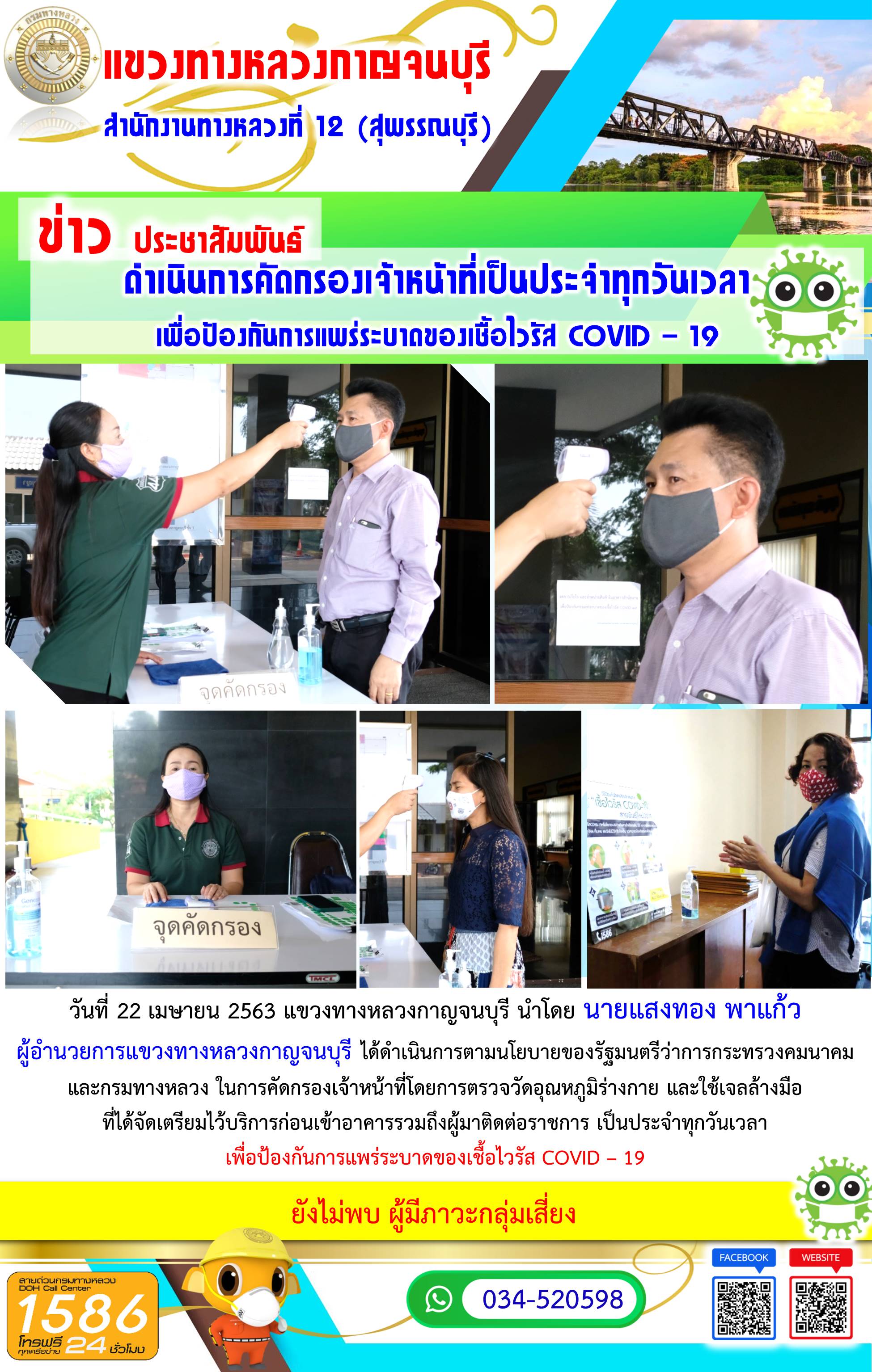 วันที่ 22 เมษายน 2563 แขวงทางหลวงกาญจนบุรี นำโดย นายแสงทอง พาแก้ว ผู้อำนวยการแขวงทางหลวงกาญจนบุรี ได้ดำเนินการตามนโยบายของรัฐมนตรีว่าการกระทรวงคมนาคมและกรมทางหลวง ในการคัดกรองเจ้าหน้าที่โดยการตรวจวัดอุณหภูมิร่างกาย และใช้เจลล้างมือที่ได้จัดเตรียมไว้บริการก่อนเข้าอาคารรวมถึงผู้มาติดต่อราชการ เพื่อป้องกันการแพร่ระบาดของเชื้อไวรัส COVID – 19