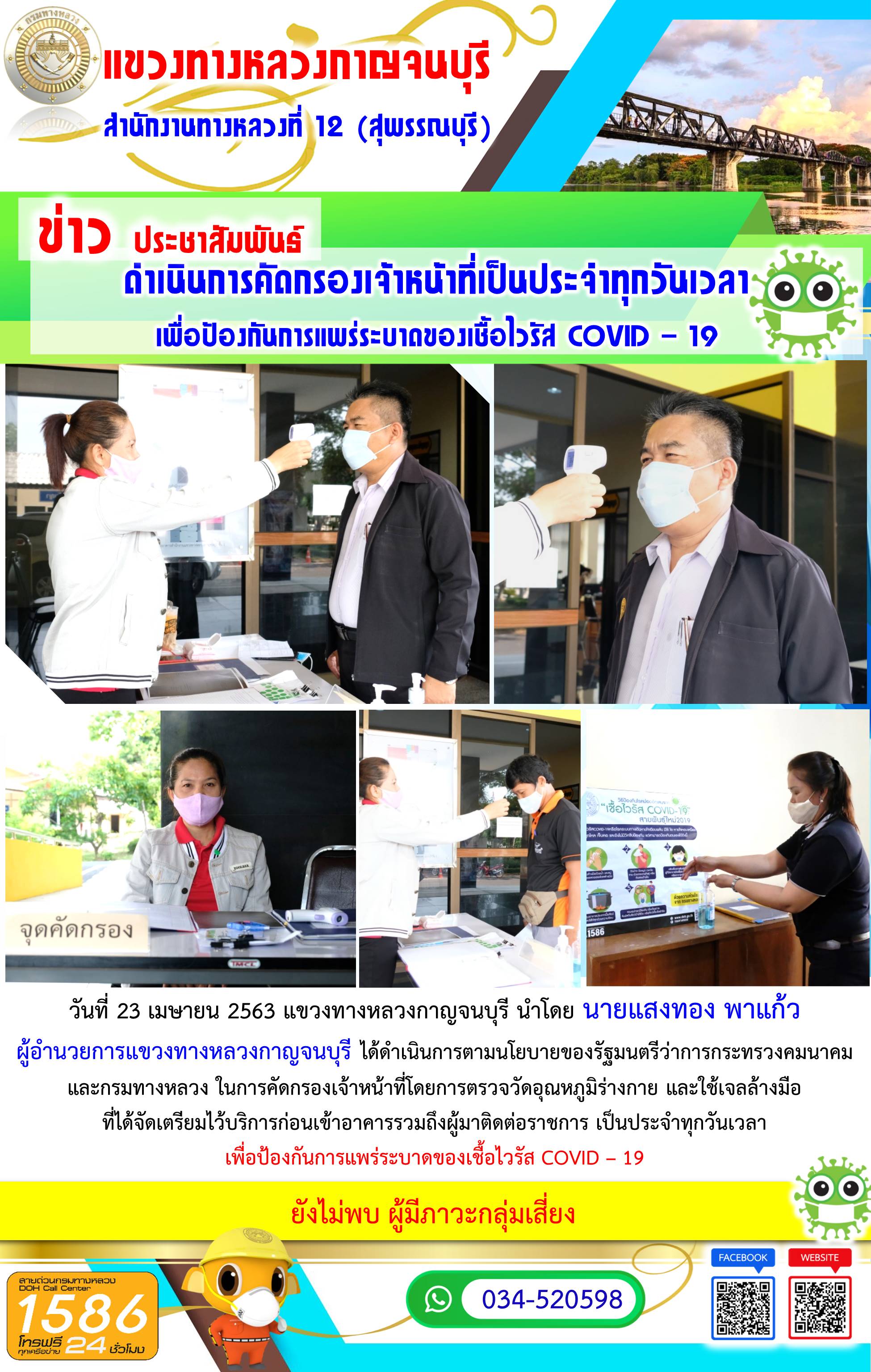 วันที่ 23 เมษายน 2563 แขวงทางหลวงกาญจนบุรี นำโดย นายแสงทอง พาแก้ว ผู้อำนวยการแขวงทางหลวงกาญจนบุรี ได้ดำเนินการตามนโยบายของรัฐมนตรีว่าการกระทรวงคมนาคมและกรมทางหลวง ในการคัดกรองเจ้าหน้าที่โดยการตรวจวัดอุณหภูมิร่างกาย และใช้เจลล้างมือที่ได้จัดเตรียมไว้บริการก่อนเข้าอาคารรวมถึงผู้มาติดต่อราชการ เพื่อป้องกันการแพร่ระบาดของเชื้อไวรัส COVID – 19