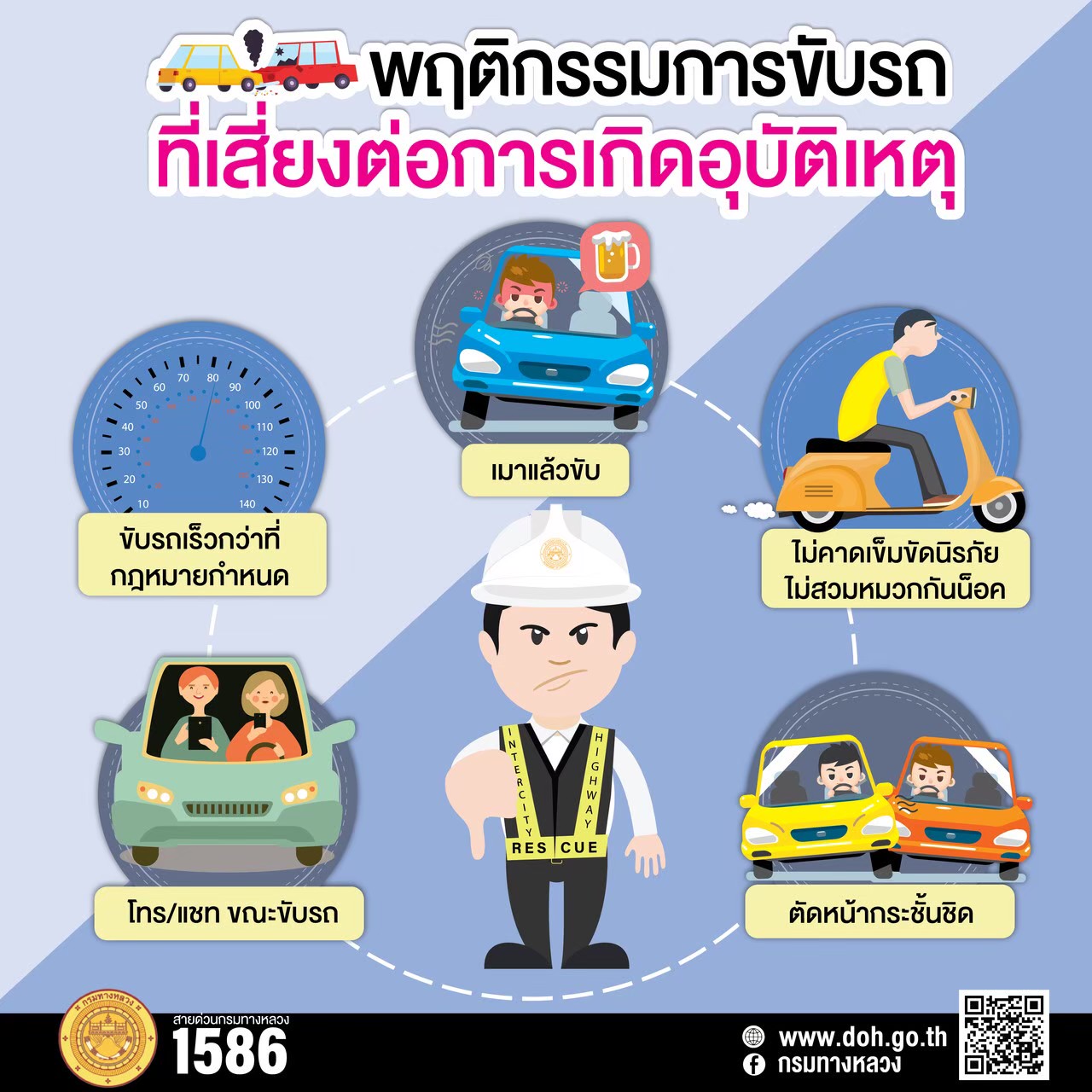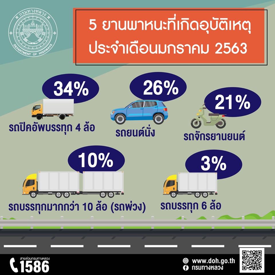 อุบัติเหตุลดลง! กรมทางหลวง สรุปอุบัติเหตุบนทางหลวงเดือนมกราคม 2563 พร้อมขอความร่วมมือปฏิบัติตามกฎจราจร พบอุบัติเหตุโทร 1586