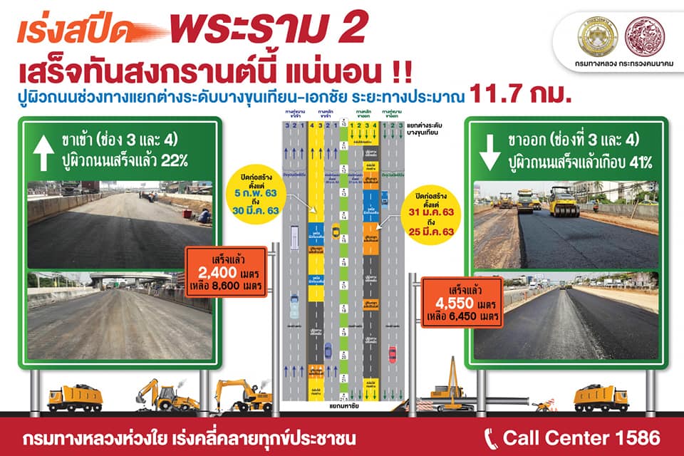 กรมทางหลวงยันพระราม 2 วิ่งฉิวก่อนสงกรานต์ ขานรับนโยบาย “รมว.คมนาคม” กรมทางหลวงระดมเครื่องจักรเพิ่มอีก 3 ชุด เร่งสปีดปูผิวถนนพระราม 2 ระยะทาง 11.7 กม. ยัน 14 ช่องจราจรไป-กลับได้ใช้แน่ก่อนสงกรานต์นี้ ช่วยอำนวยความสะดวกเพิ่มความคล่องตัวเดินทาง แก้ไขปัญหารถติด