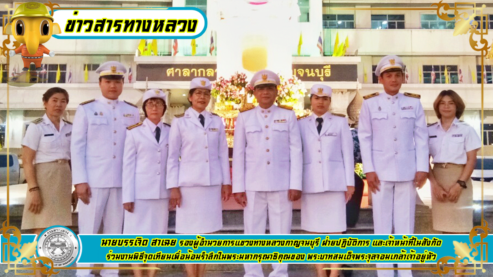 นายมงคล ทวีชัยทศพล ผู้อำนวยการแขวงทางหลวงกาญจนบุรี มอบหมายให้นายบรรเจิด สาเฉย รองผู้อำนวยการแขวงทางหลวงกาญจนบุรี ฝ่ายปฏิบัติการ และเจ้าหน้าที่ในสังกัดร่วมงานพิธีจุดเทียนเพื่อน้อมรำลึกในพระมหากรุณาธิคุณของ พระบาทสมเด็จพระจุลจอมเกล้าเจ้าอยู่หัว “พระปิยมหาราช” ที่พระองค์ทรงมีต่อปวงชนชาวไทยอย่างหาที่สุดมิได้