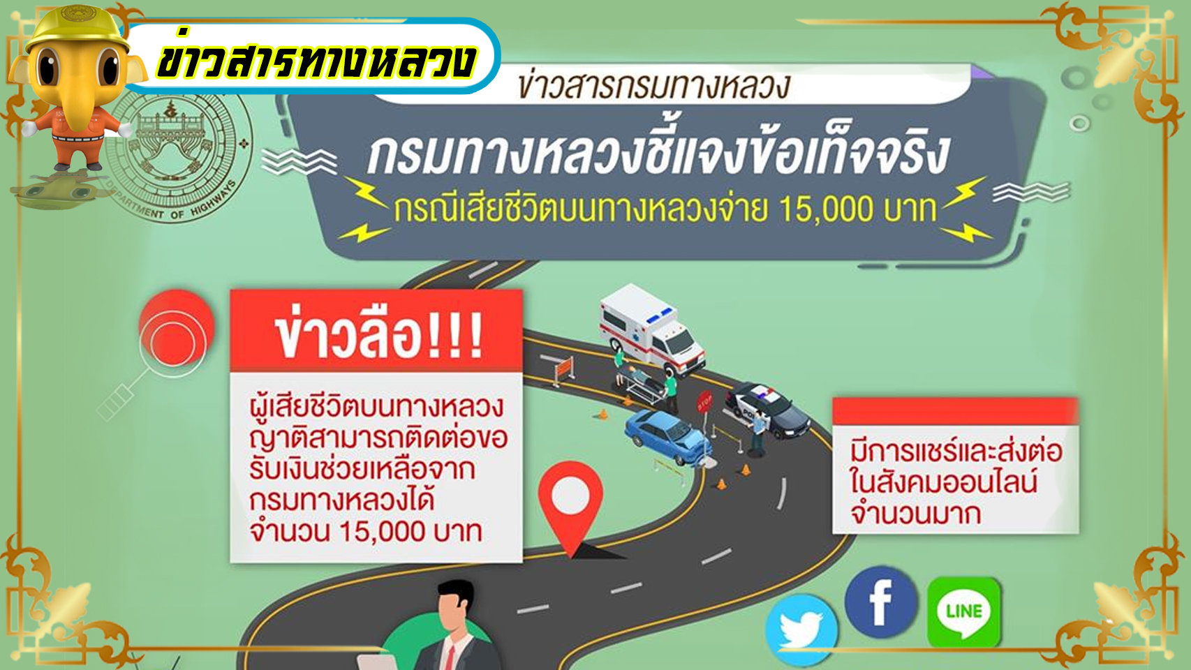 กรมทางหลวงชี้แจงข้อเท็จจริง ข่าวลือ กรณีเสียชีวิตบนทางหลวงจ่าย 15,000 บาท ตามที่มีการแชร์และส่งต่อในสังคมออนไลน์จำนวนมากนั้น ไม่เป็นความจริง