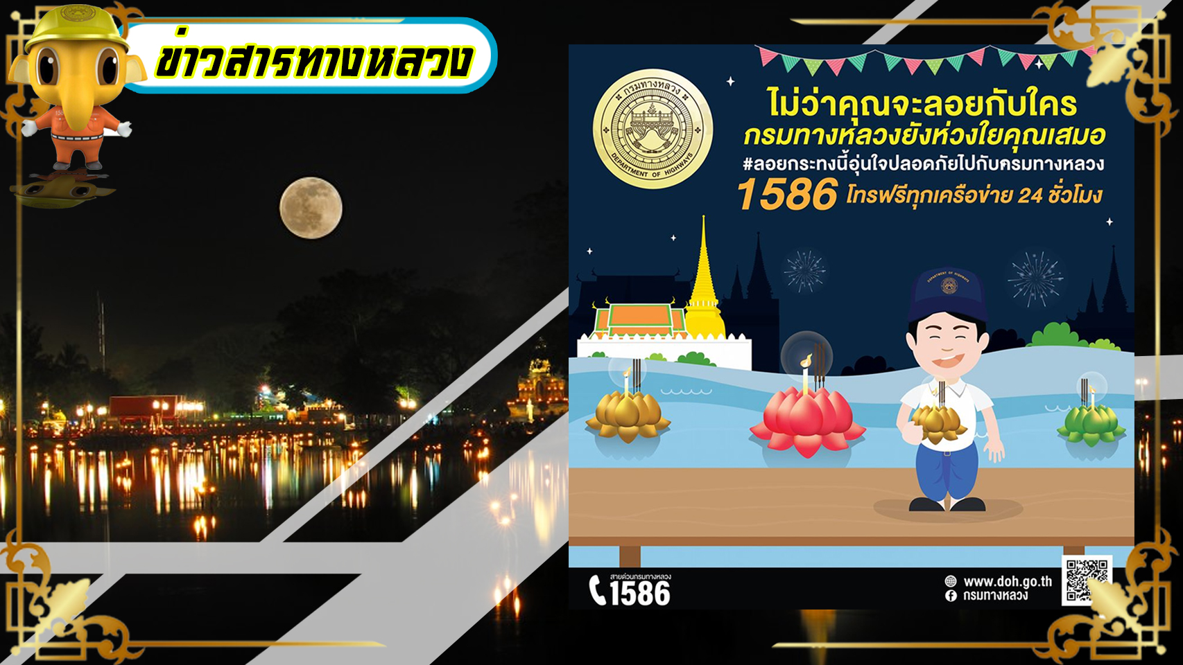 เทศกาลลอยกระทง ขับขี่ปลอดภัยอุ่นใจไปกับกรมทางหลวง ด้วยความห่วงใยจากแขวงทางหลวงกาญจนบุรี 1586 โทรฟรีทุกเครือข่าย 24 ชั่วโมง