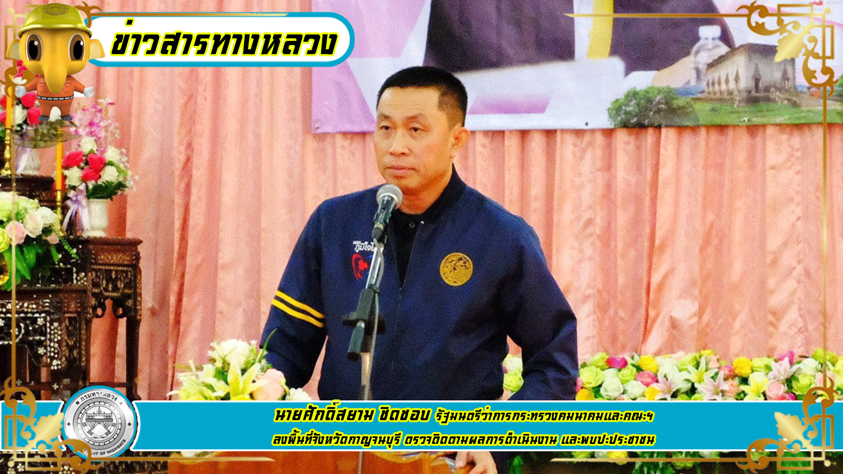 ชาวจังหวัดกาญจนบุรี ยินดีต้อนรับ ท่านศักดิ์สยาม ชิดชอบ รัฐมนตรีว่าการกระทรวงคมนาคม พร้อมด้วย นายสราวุธ ทรงศิวิไล อธิบดีกรมทางหลวง และคณะ ลงพื้นทีในจังหวัดกาญจนบุรี ตรวจติดตามผลการดำเนินงาน โครงการก่อสร้างทางหลวงพิเศษระหว่างเมือง สายบางใหญ่-กาญจนบุรี วันที่ 11 พฤศจิกายน 2562 ณ วัดตะคร้ำเอน ตำบลตำคร้ำเอน อำเภอท่ามะกา จังหวัดกาญจนบุรี และตำบลหนองขาว อำเภอท่าม่วง จังหวัดกาญจนบุรี
