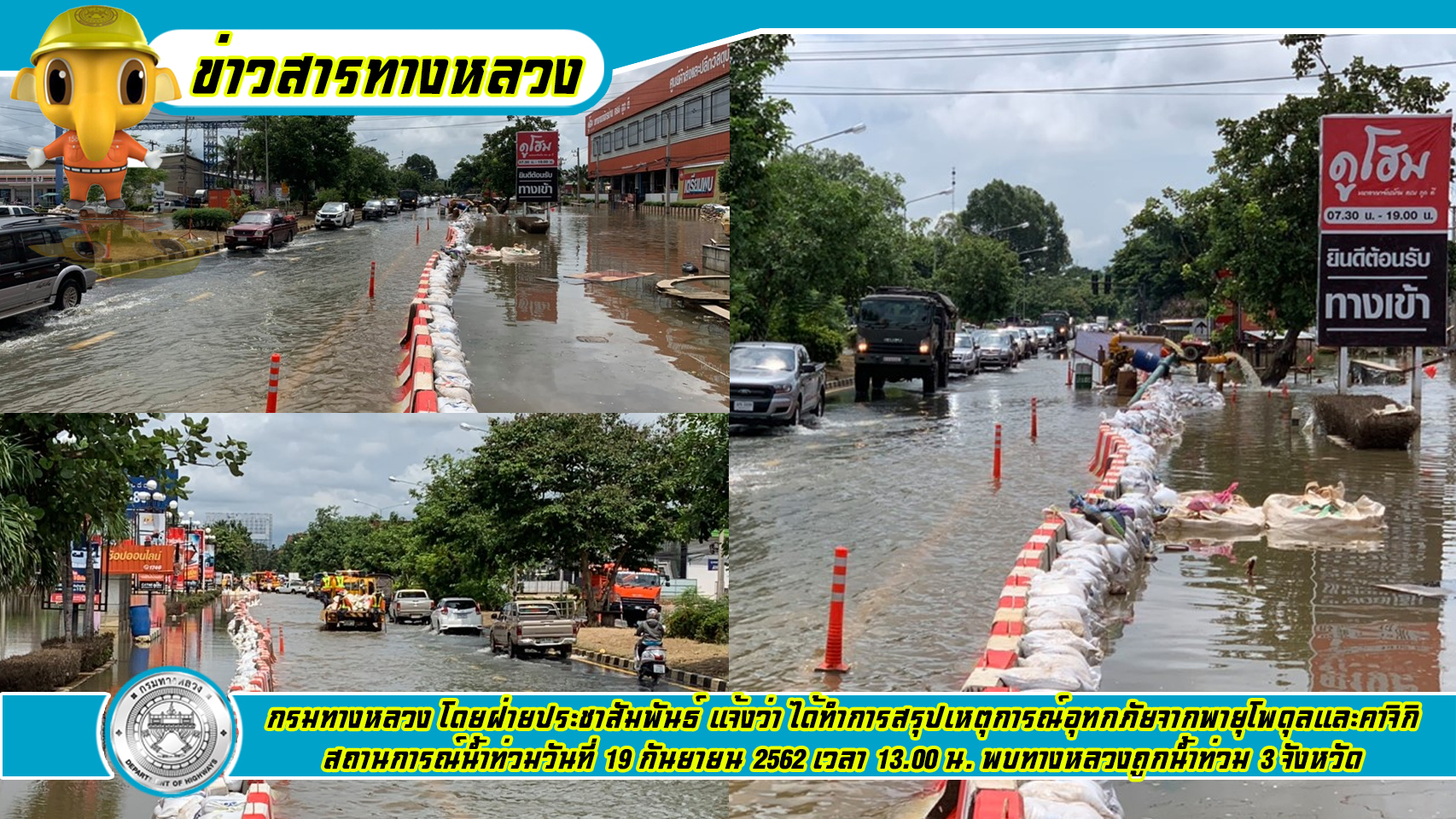 กรมทางหลวง โดยฝ่ายประชาสัมพันธ์ แจ้งว่า ได้ทำการสรุปเหตุการณ์อุทกภัยจากพายุโพดุลและคาจิกิ สถานการณ์น้ำท่วมวันที่ 19 กันยายน 2562 เวลา 13.00 น. พบทางหลวงถูกน้ำท่วม 3 จังหวัด ได้แก่ จังหวัดศรีสะเกษ จังหวัดอุบลราชธานี และจังหวัดอำนาจเจริญ จำนวน 5 สายทาง ทางหลวงที่การจราจรผ่านไม่ได้ 4 แห่ง