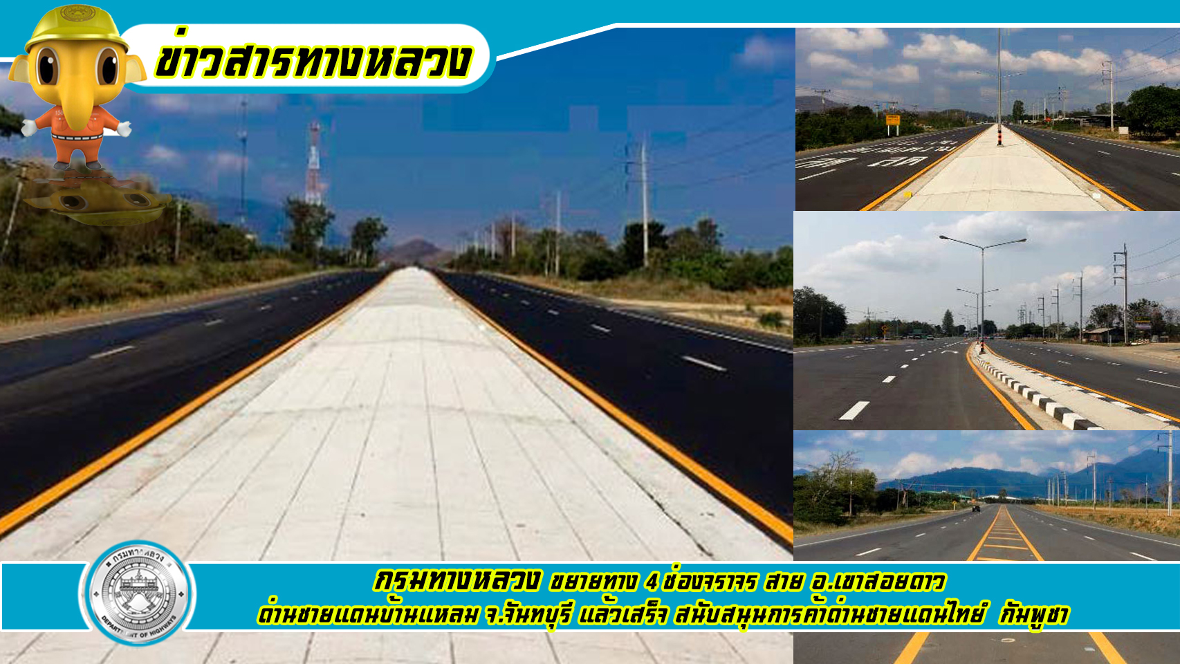 กรมทางหลวง ขยายทาง 4 ช่องจราจร สาย อ.เขาสอยดาว – ด่านชายแดนบ้านแหลม จ.จันทบุรี แล้วเสร็จ สนับสนุนการค้าด่านชายแดนไทย – กัมพูชา