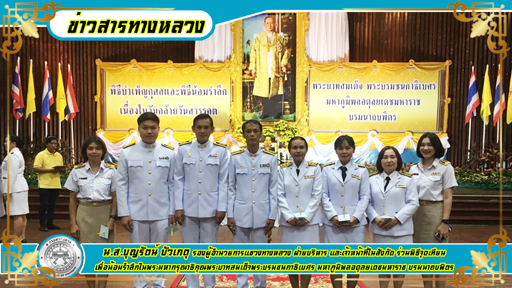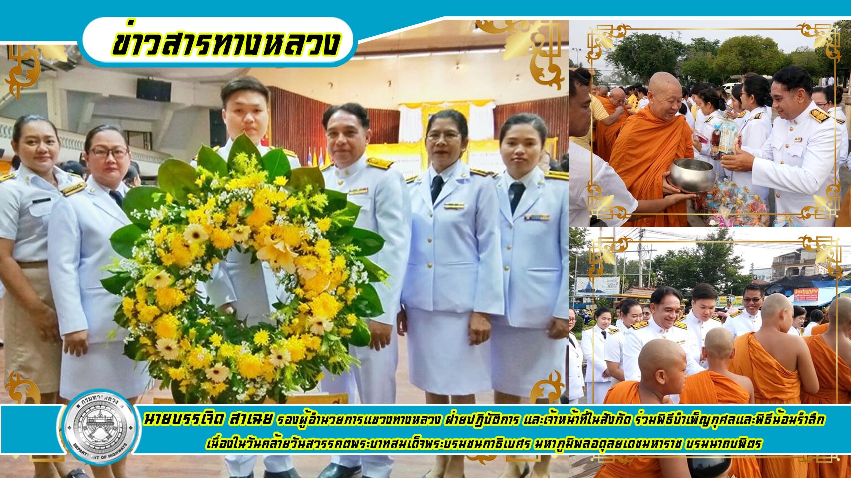 วันที่ ๑๓ ตุลาคม ๒๕๖๒ นายมงคล ทวีชัยทศพล ผู้อำนวยการแขวงทางหลวงกาญจนบุรี มอบหมายให้นายบรรเจิด สาเฉย รองผู้อำนวยการแขวงทางหลวง ฝ่ายปฏิบัติการ และเจ้าหน้าที่ในสังกัด ร่วมพิธีบำเพ็ญกุศลและพิธีน้อมรำลึก เนื่องในวันคล้ายวันสวรรคตพระบาทสมเด็จพระบรมชนกาธิเบศร มหาภูมิพลอดุลยเดชมหาราช บรมนาถบพิตร ณ ศาลา ๖๐ พรรษา จ.กาญจนบุรี