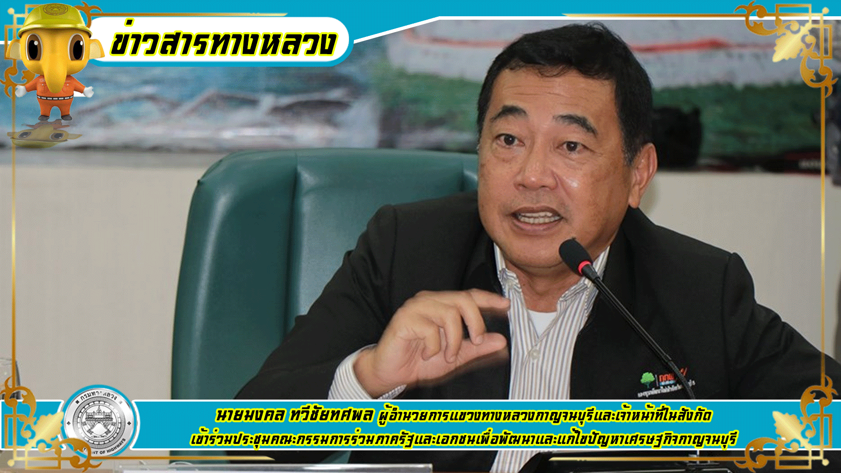 วันที่ 21 ต.ค.2562 นายมงคล ทวีชัยทศพล ผู้อำนวยการแขวงทางหลวงกาญจนบุรีและเจ้าหน้าที่ในสังกัด เข้าร่วมประชุมคณะกรรมการร่วมภาครัฐและเอกชนเพื่อพัฒนาและแก้ไขปัญหาเศรษฐกิจกาญจนบุรี ณ ห้องประชุมแควน้อย ชั้น 3 ศาลากลางจังหวัดกาญจนบุรี โดยมี นายจีระเกียรติ ภูมิสวัสดิ์ ผู้ว่าราชการจังหวัดกาญจนบุรี เป็นประธานการประชุม