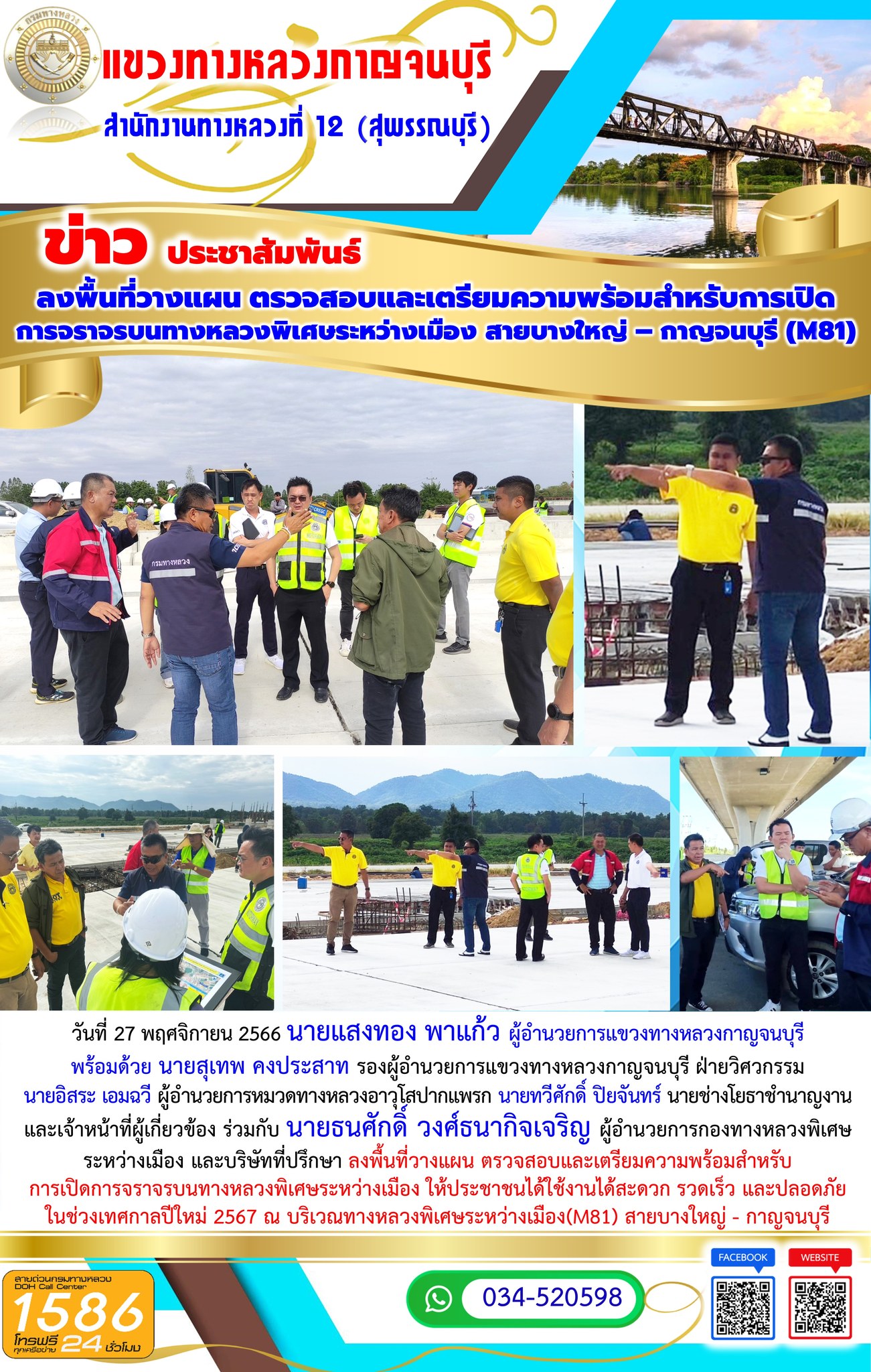 นายแสงทอง พาแก้ว ผู้อำนวยการแขวงทางหลวงกาญจนบุรี พร้อมด้วย นายสุเทพ คงประสาท รองผู้อำนวยการแขวงทางหลวงกาญจนบุรี ฝ่ายวิศวกรรม นายอิสระ เอมฉวี ผู้อำนวยการหมวดทางหลวงอาวุโสปากแพรก นายทวีศักดิ์ ปิยจันทร์ นายช่างโยธาชำนาญงาน และเจ้าหน้าที่ผู้เกี่ยวข้อง ร่วมกับ นายธนศักดิ์ วงศ์ธนากิจเจริญ ผู้อำนวยการกองทางหลวงพิเศษระหว่างเมือง และบริษัทที่ปรึกษา ลงพื้นที่วางแผน ตรวจสอบและเตรียมความพร้อมสำหรับ การเปิดการจราจรบนทางหลวงพิเศษระหว่างเมือง