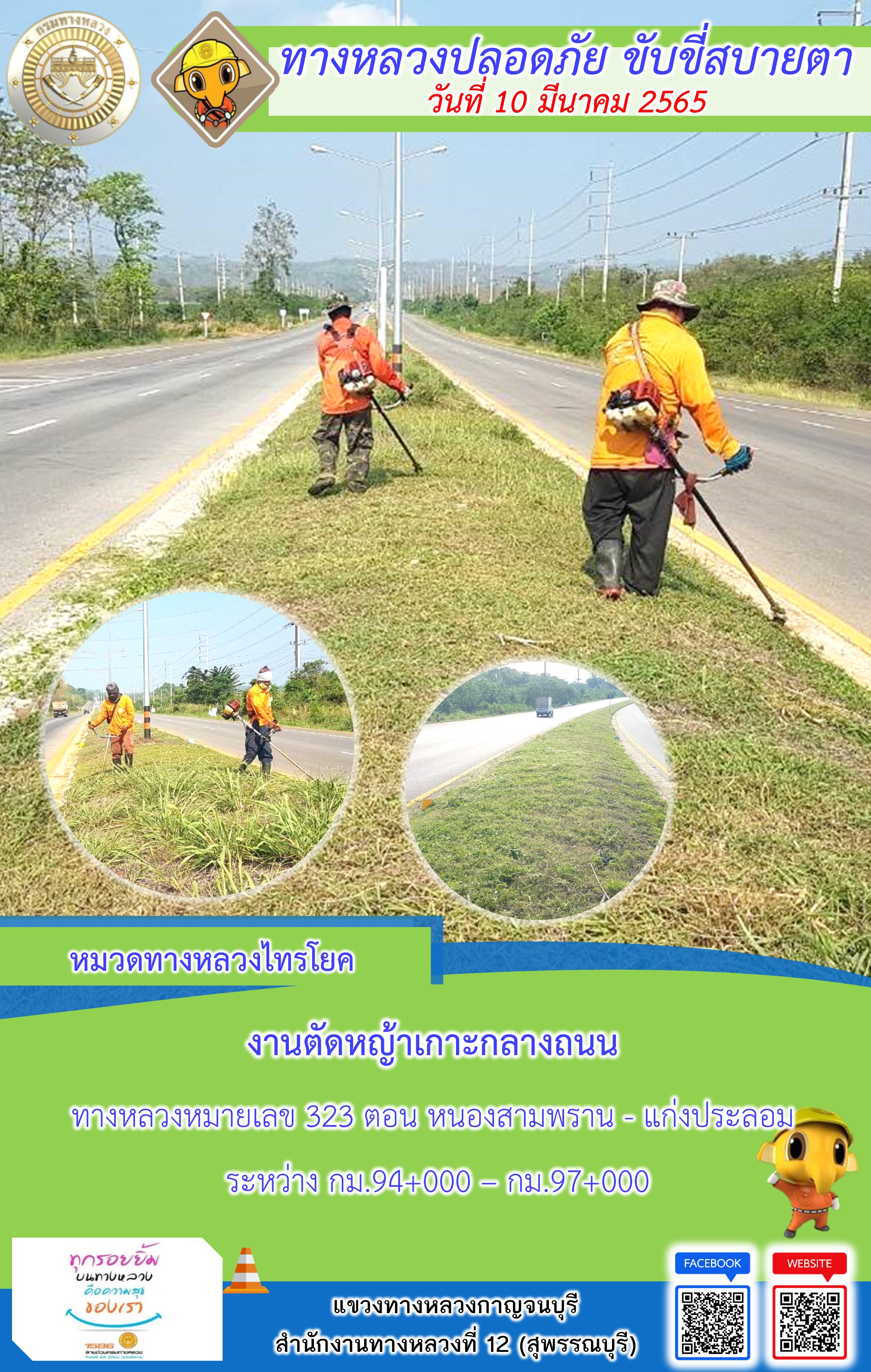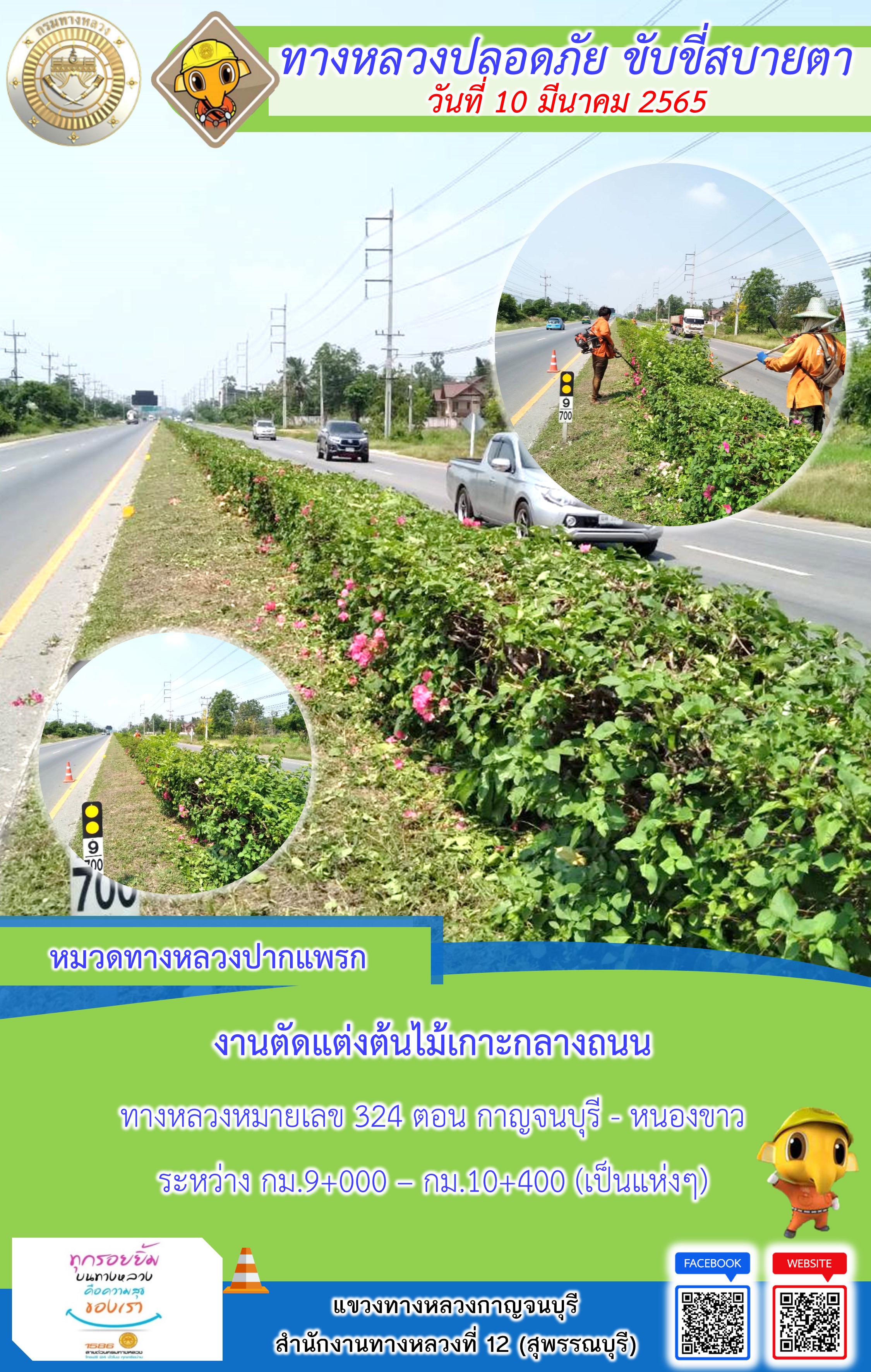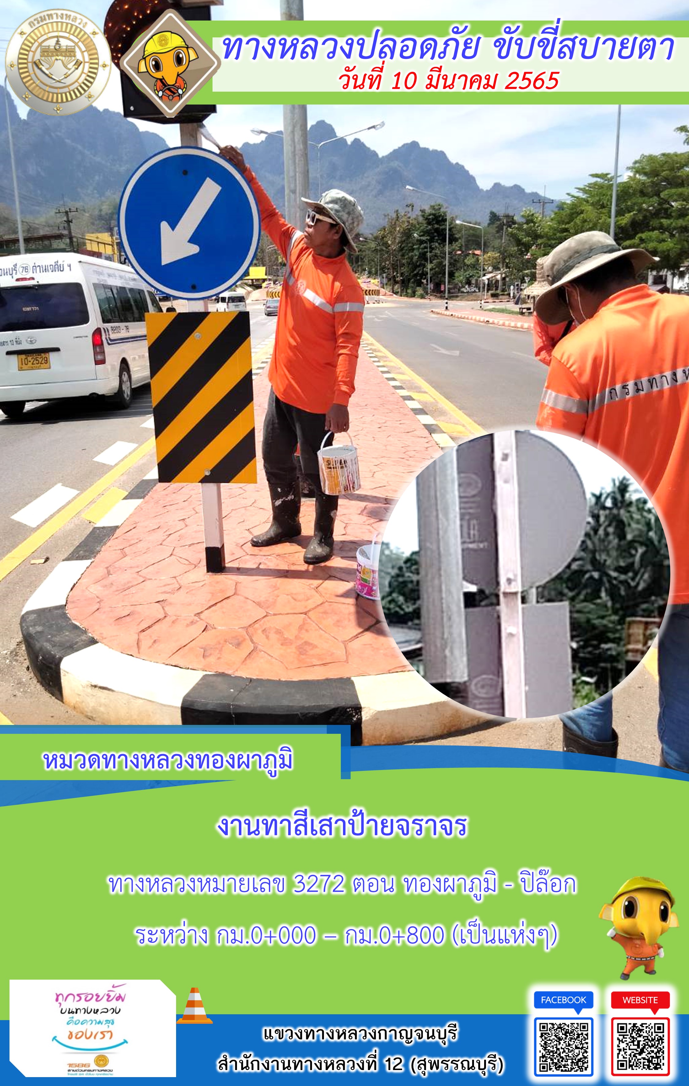 ข้อมูลภาพกิจกรรม : แขวงทางหลวงกาญจนบุรี โดยหมวดทางหลวงในสังกัด และงานอำนวยความปลอดภัย ปฏิบัติงาน ประจำวันที่ 10 มี.ค. 65 #กรมทางหลวง #สายด่วนกรมทางหลวง1586 #แขวงทางหลวงกาญจนบุรี โทร 034-520-598