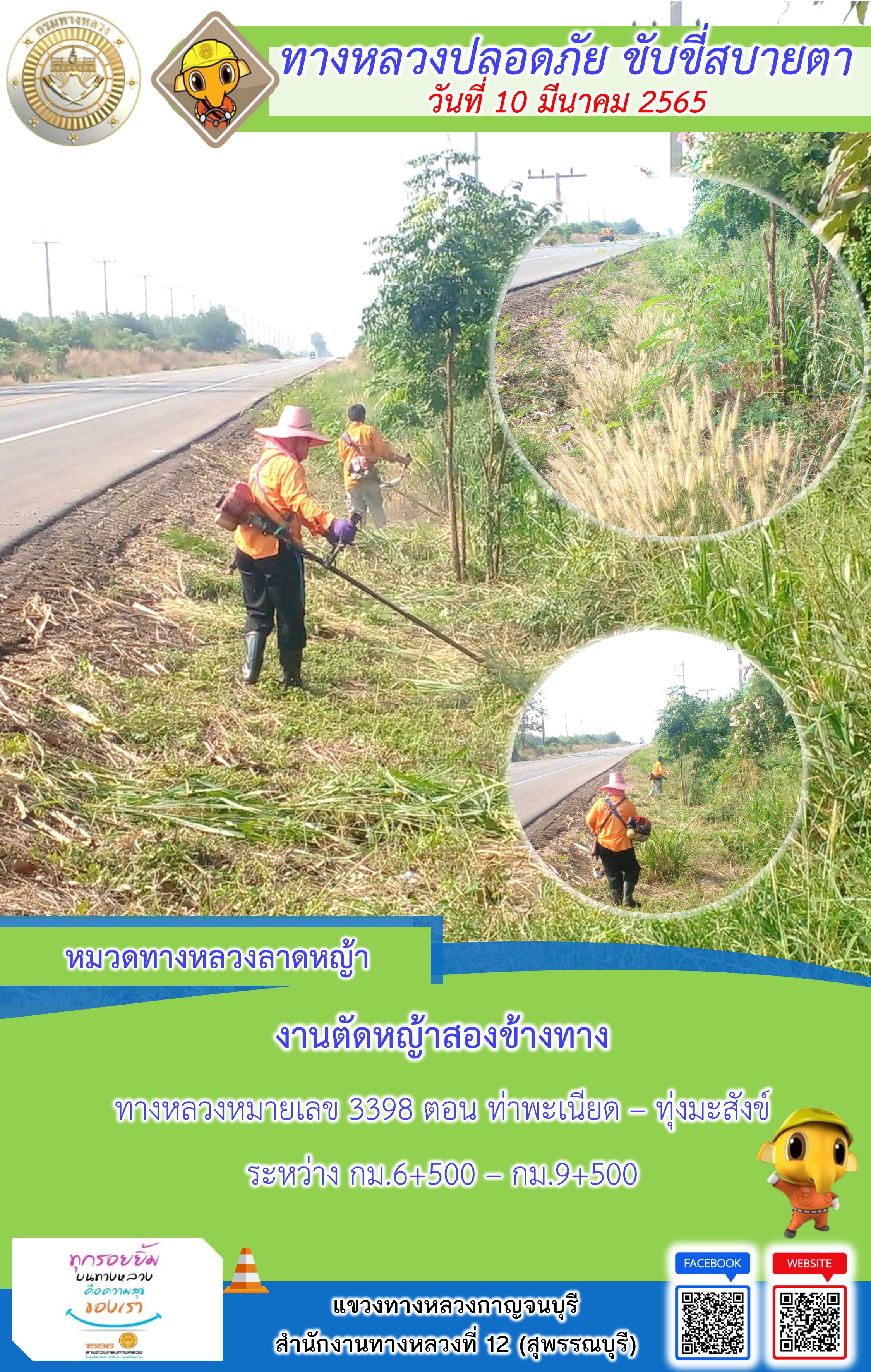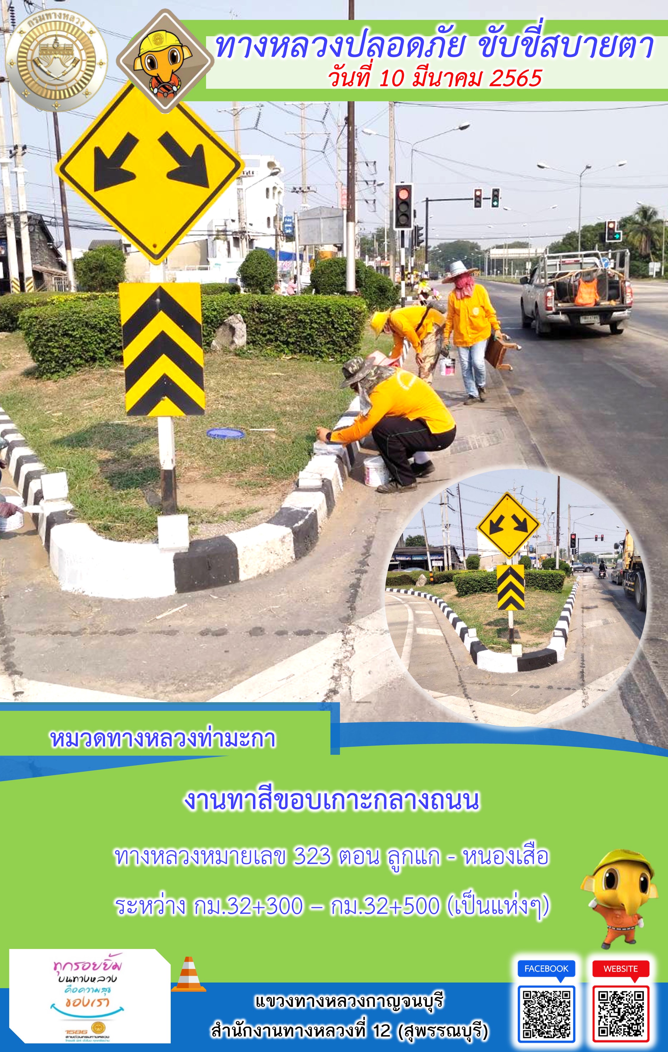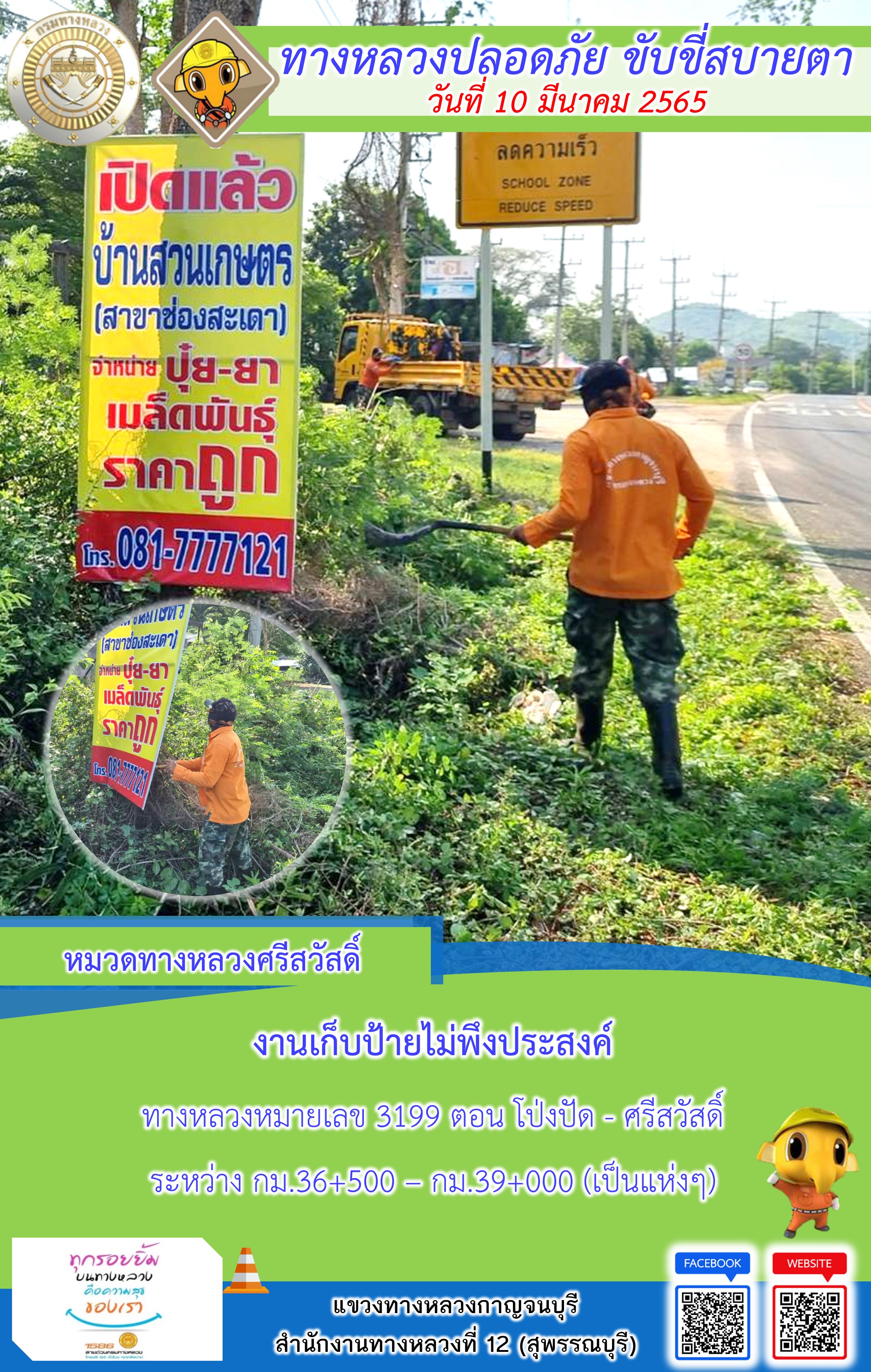 ข้อมูลภาพกิจกรรม : แขวงทางหลวงกาญจนบุรี โดยหมวดทางหลวงในสังกัด และงานอำนวยความปลอดภัย ปฏิบัติงาน ประจำวันที่ 10 มี.ค. 65 #กรมทางหลวง #สายด่วนกรมทางหลวง1586 #แขวงทางหลวงกาญจนบุรี โทร 034-520-598