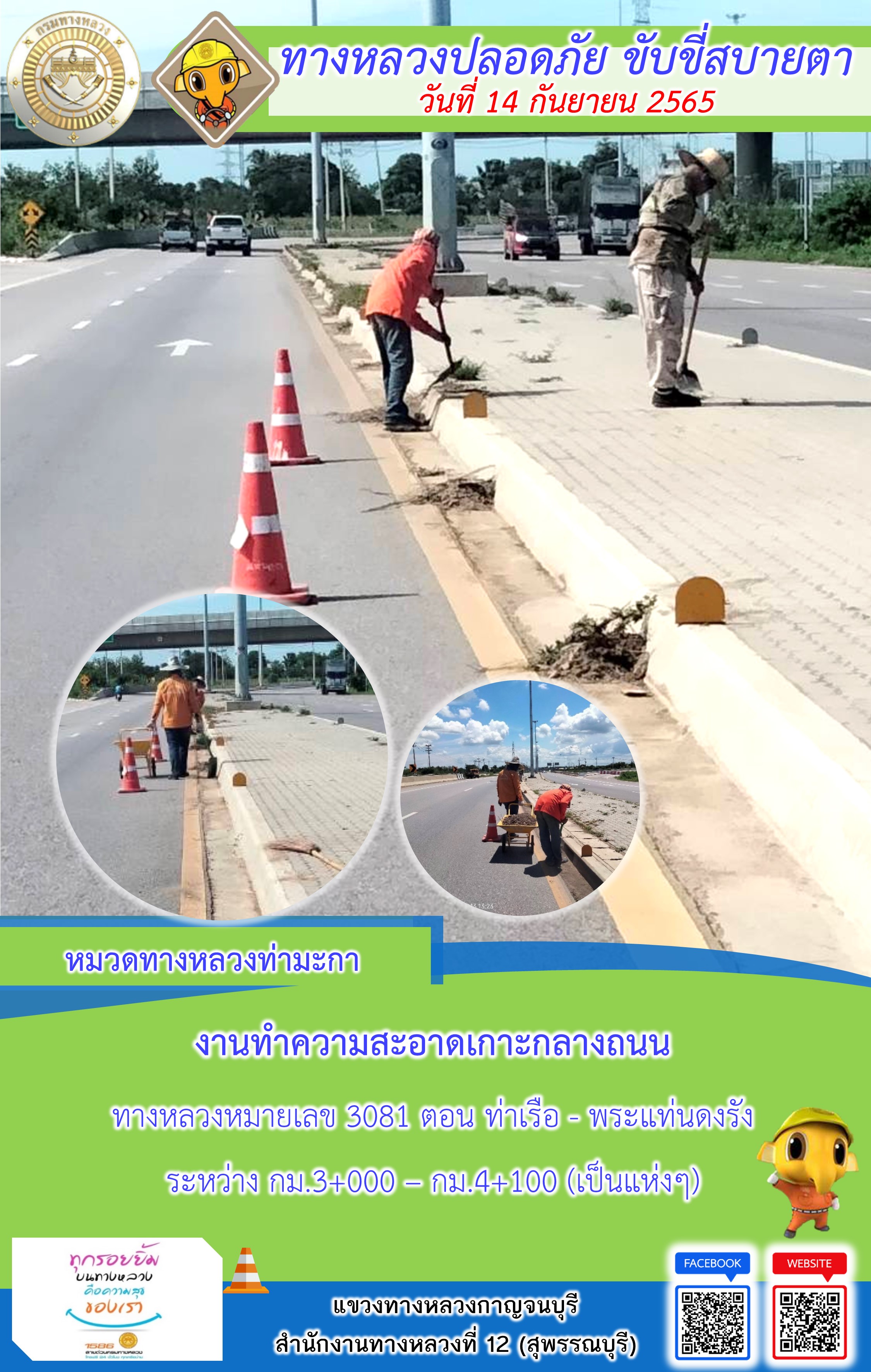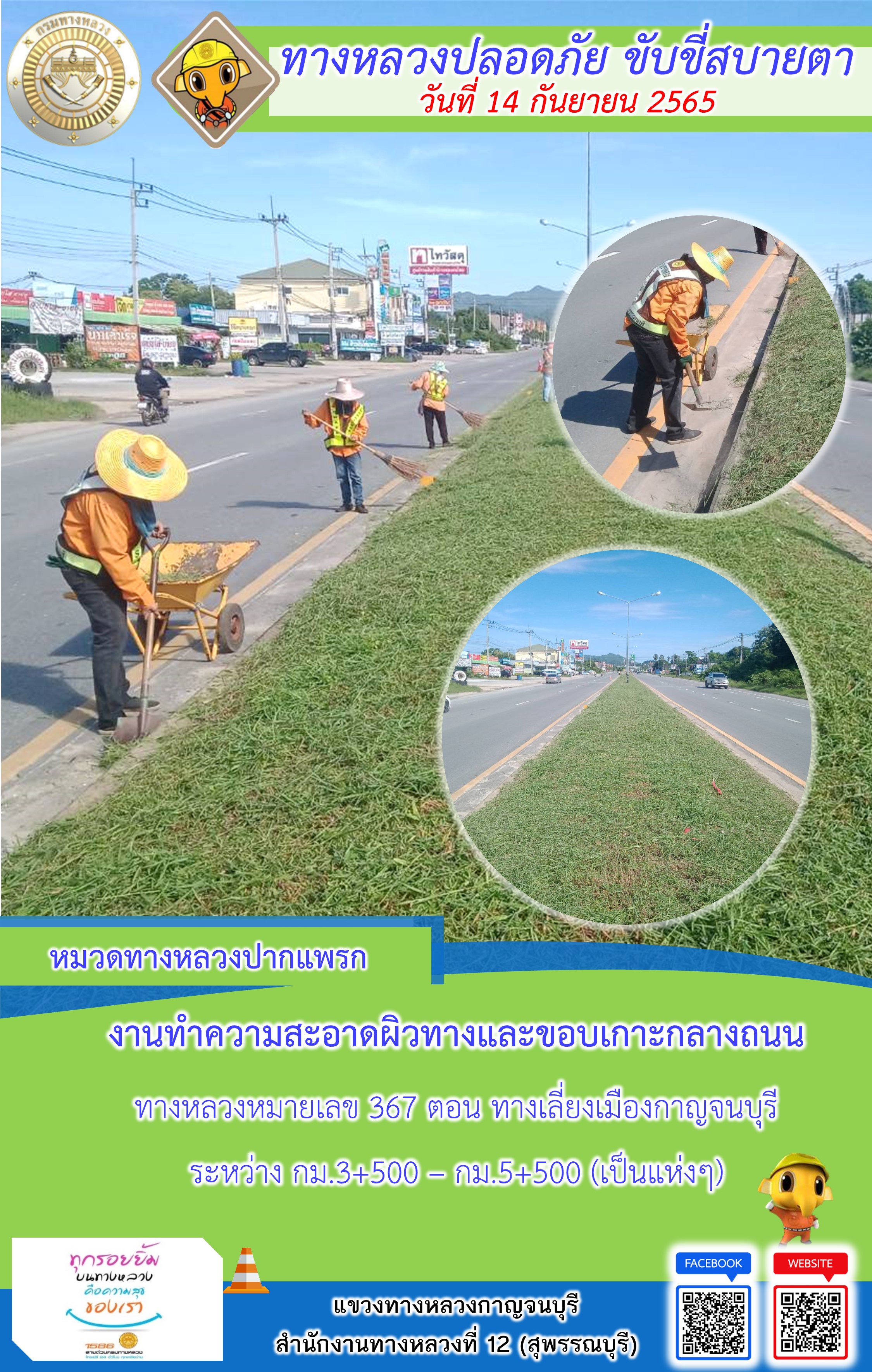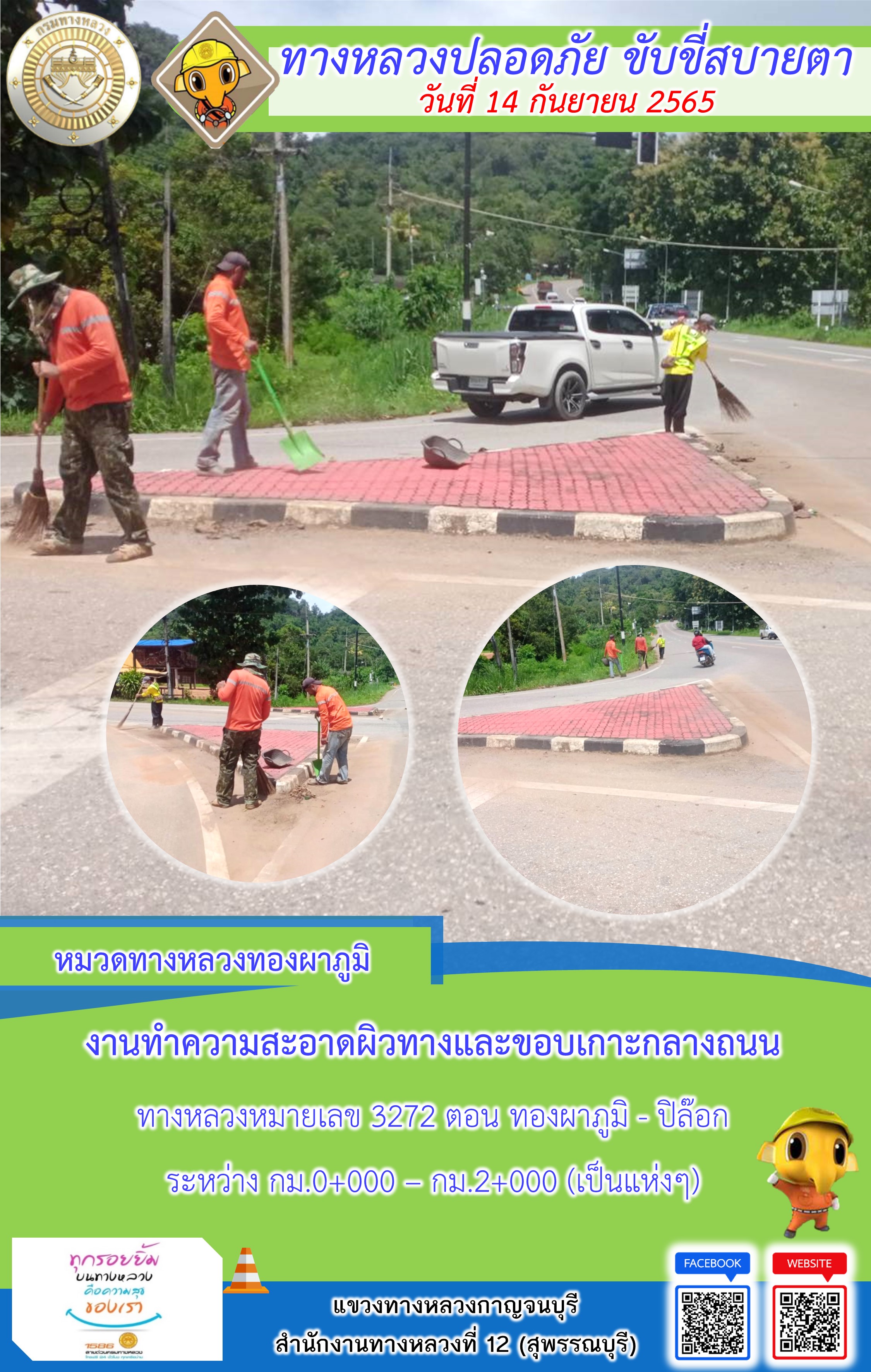 ข้อมูลภาพกิจกรรม : แขวงทางหลวงกาญจนบุรี โดยหมวดทางหลวงในสังกัดและงานอำนวยความปลอดภัย ปฏิบัติงาน ประจำวันที่ 14 ก.ย. 65 #กรมทางหลวง #สายด่วนกรมทางหลวง1586 #แขวงทางหลวงกาญจนบุรี โทร 034-520-598