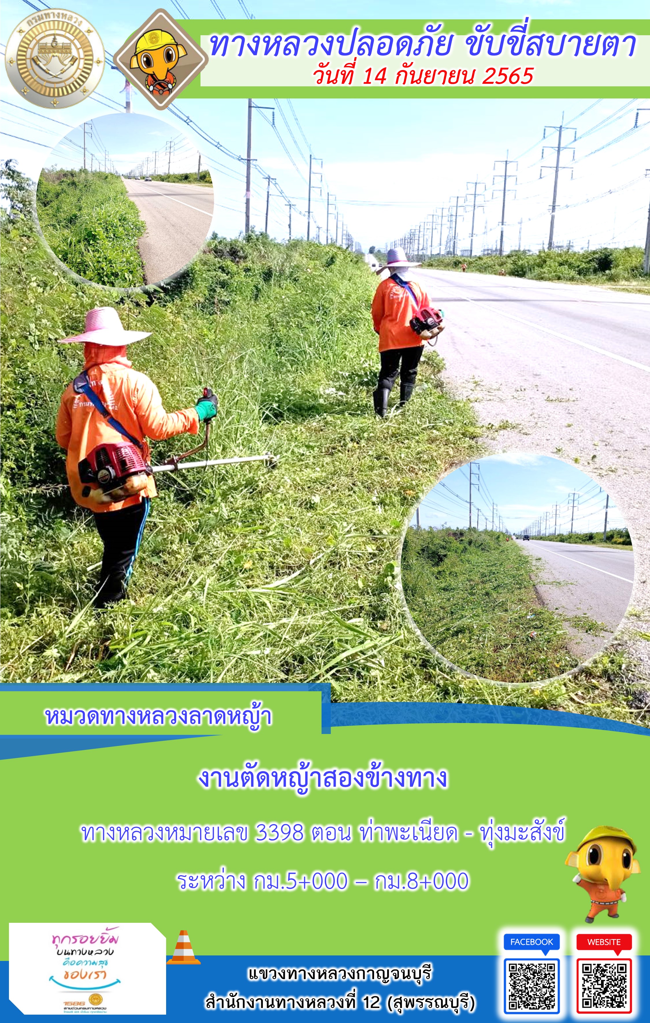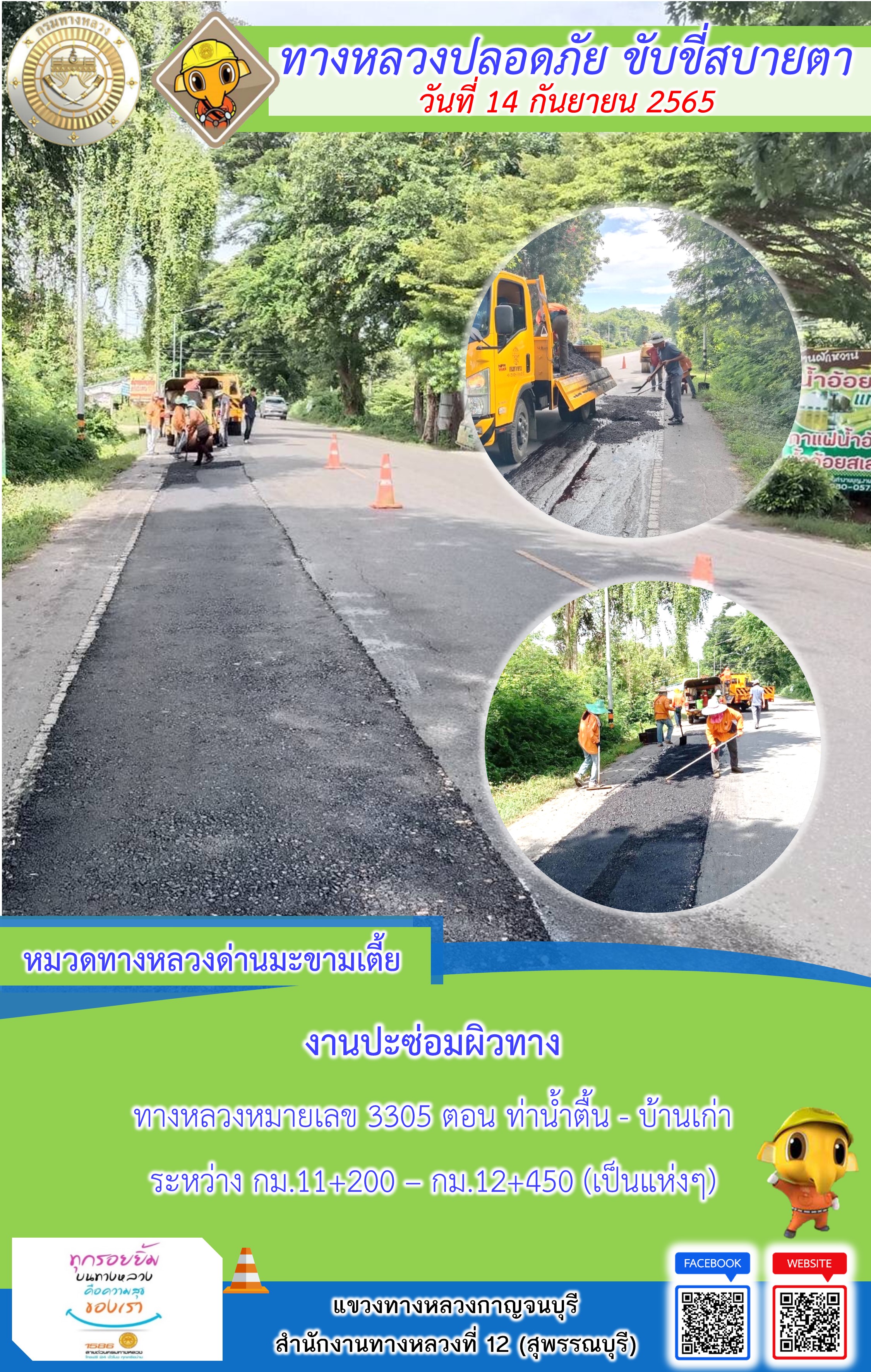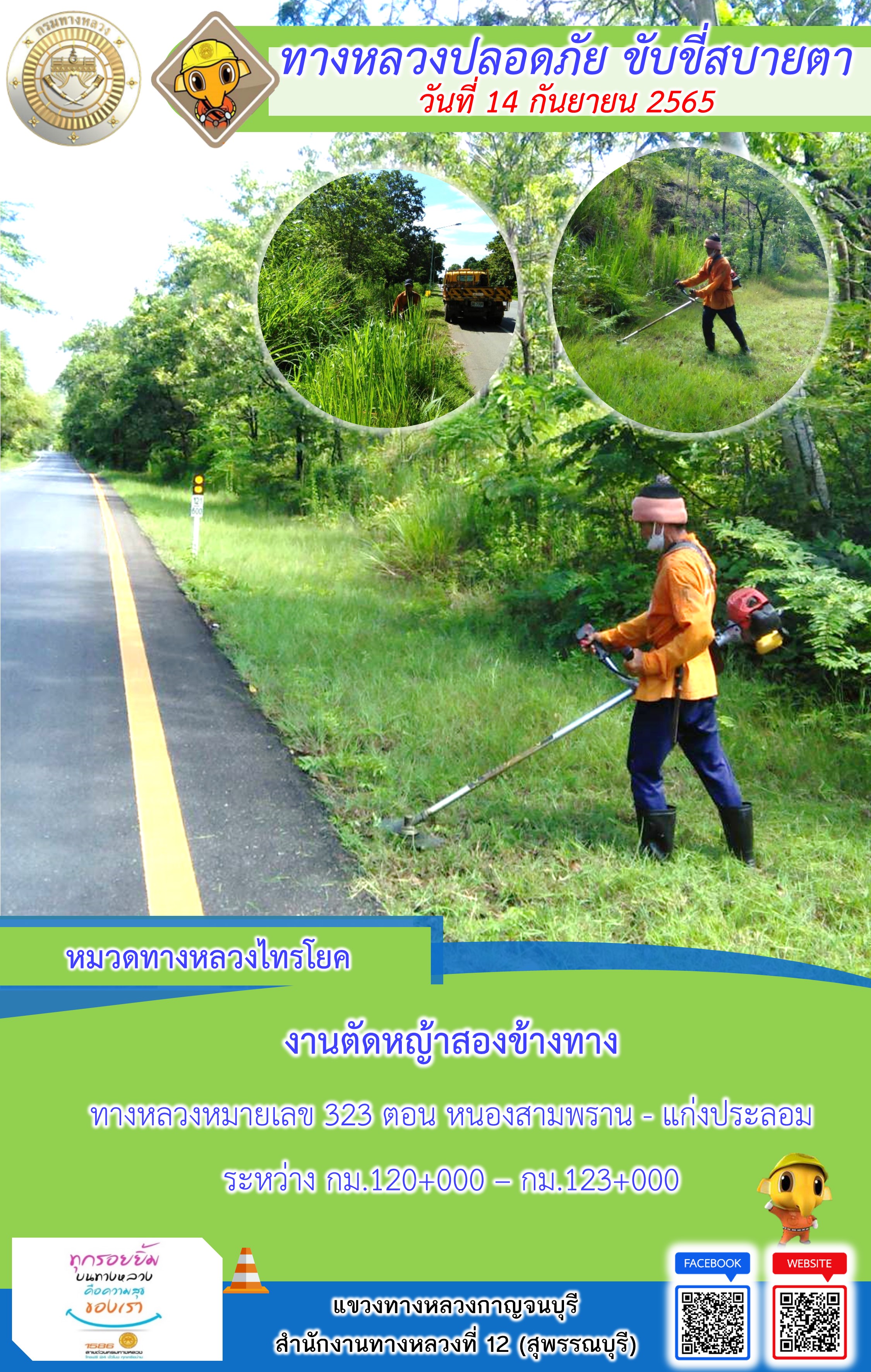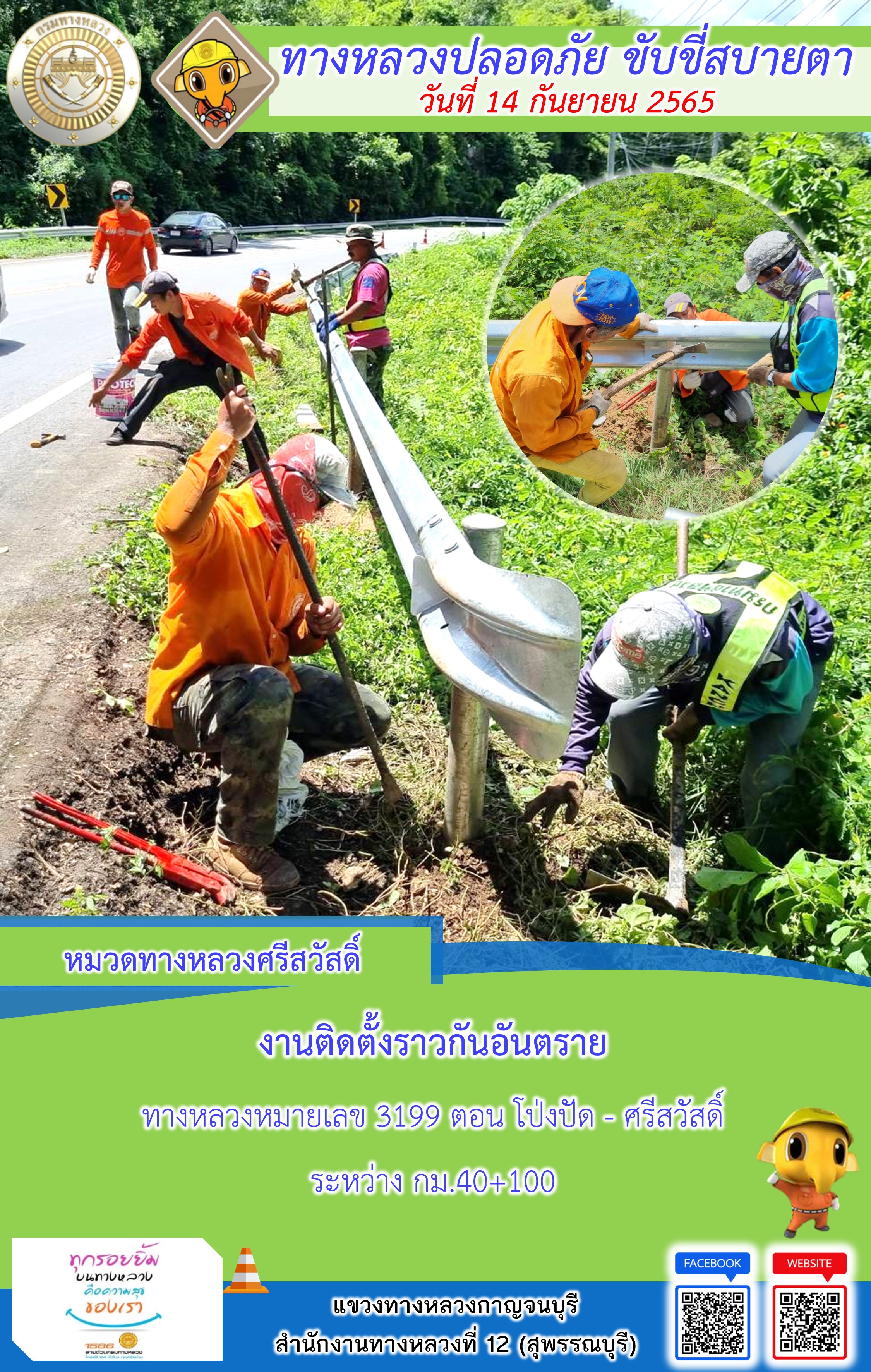 ข้อมูลภาพกิจกรรม : แขวงทางหลวงกาญจนบุรี โดยหมวดทางหลวงในสังกัดและงานอำนวยความปลอดภัย ปฏิบัติงาน ประจำวันที่ 14 ก.ย. 65 #กรมทางหลวง #สายด่วนกรมทางหลวง1586 #แขวงทางหลวงกาญจนบุรี โทร 034-520-598
