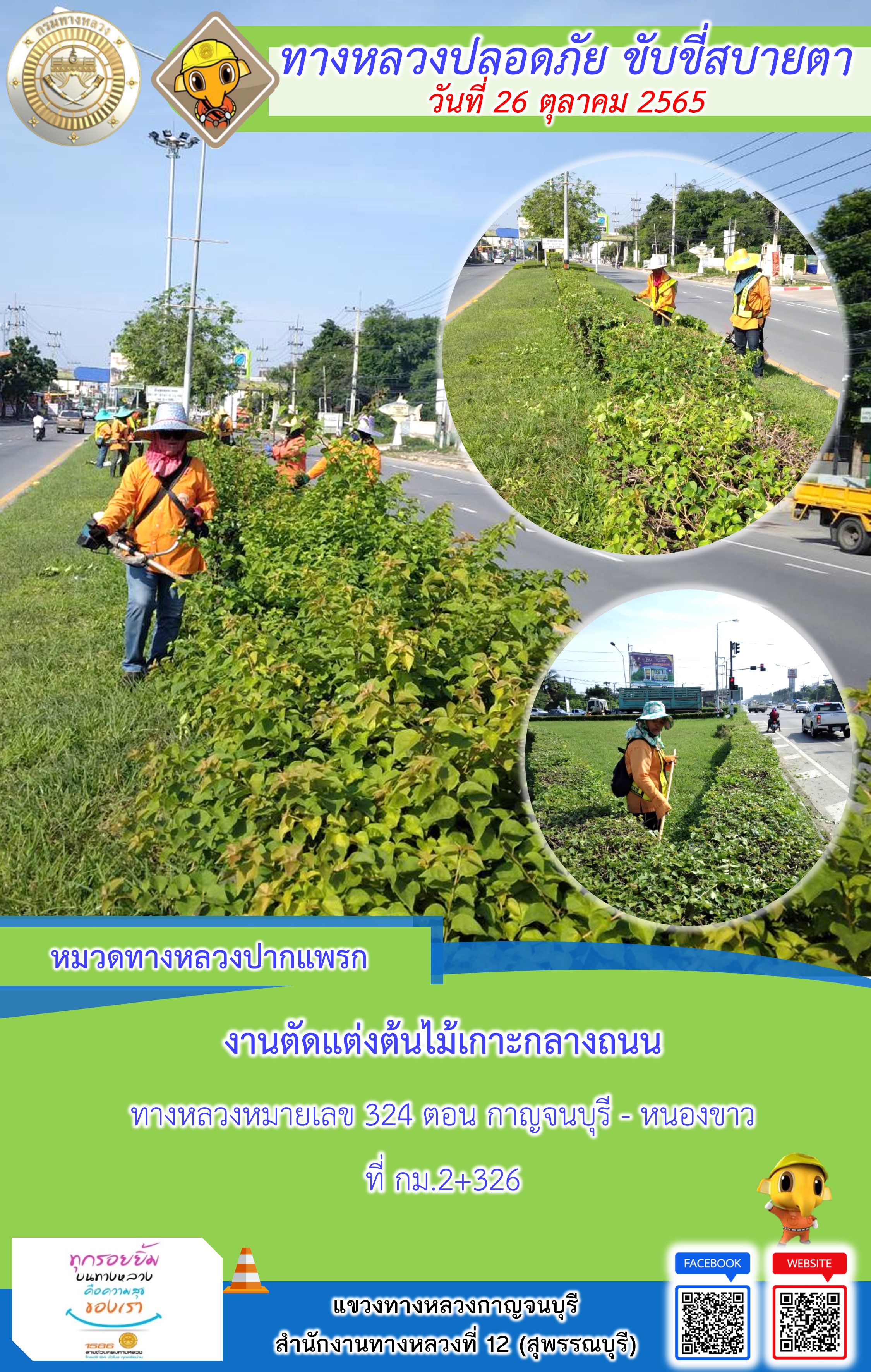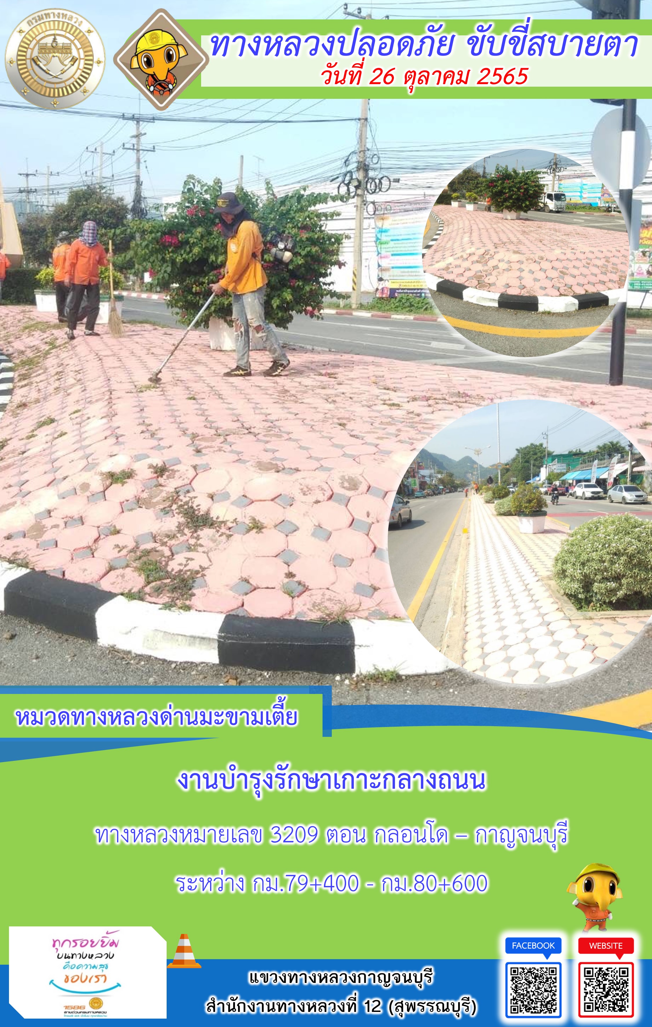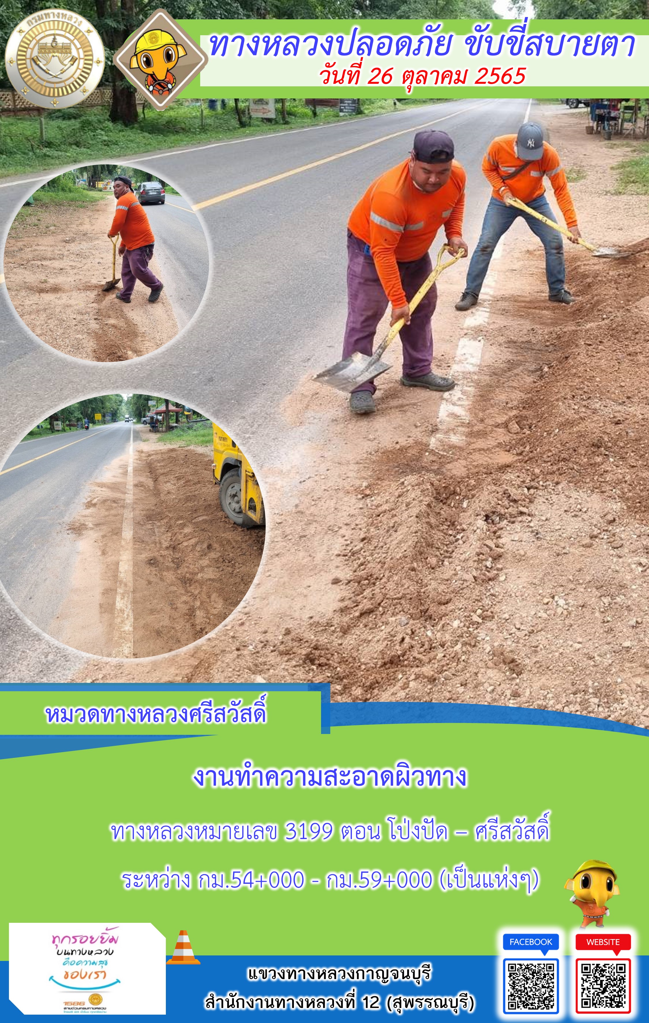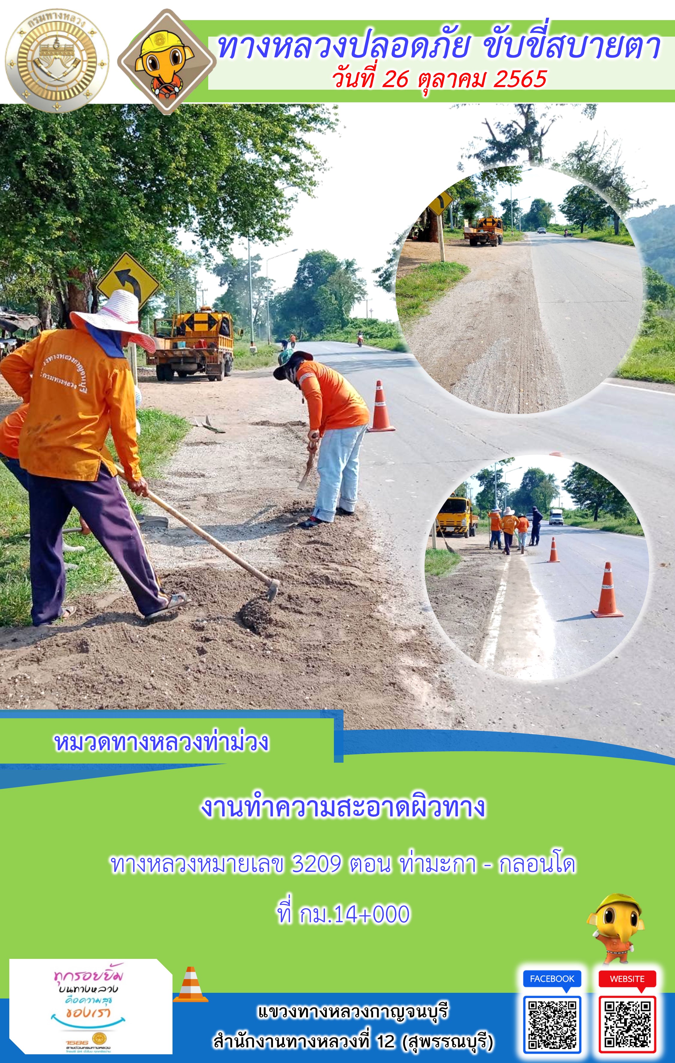 ข้อมูลภาพกิจกรรม : แขวงทางหลวงกาญจนบุรี โดยหมวดทางหลวงในสังกัดและงานอำนวยความปลอดภัย ปฏิบัติงาน ประจำวันที่ 26 ต.ค. 65 #กรมทางหลวง #สายด่วนกรมทางหลวง1586 #แขวงทางหลวงกาญจนบุรี โทร 034-520-598