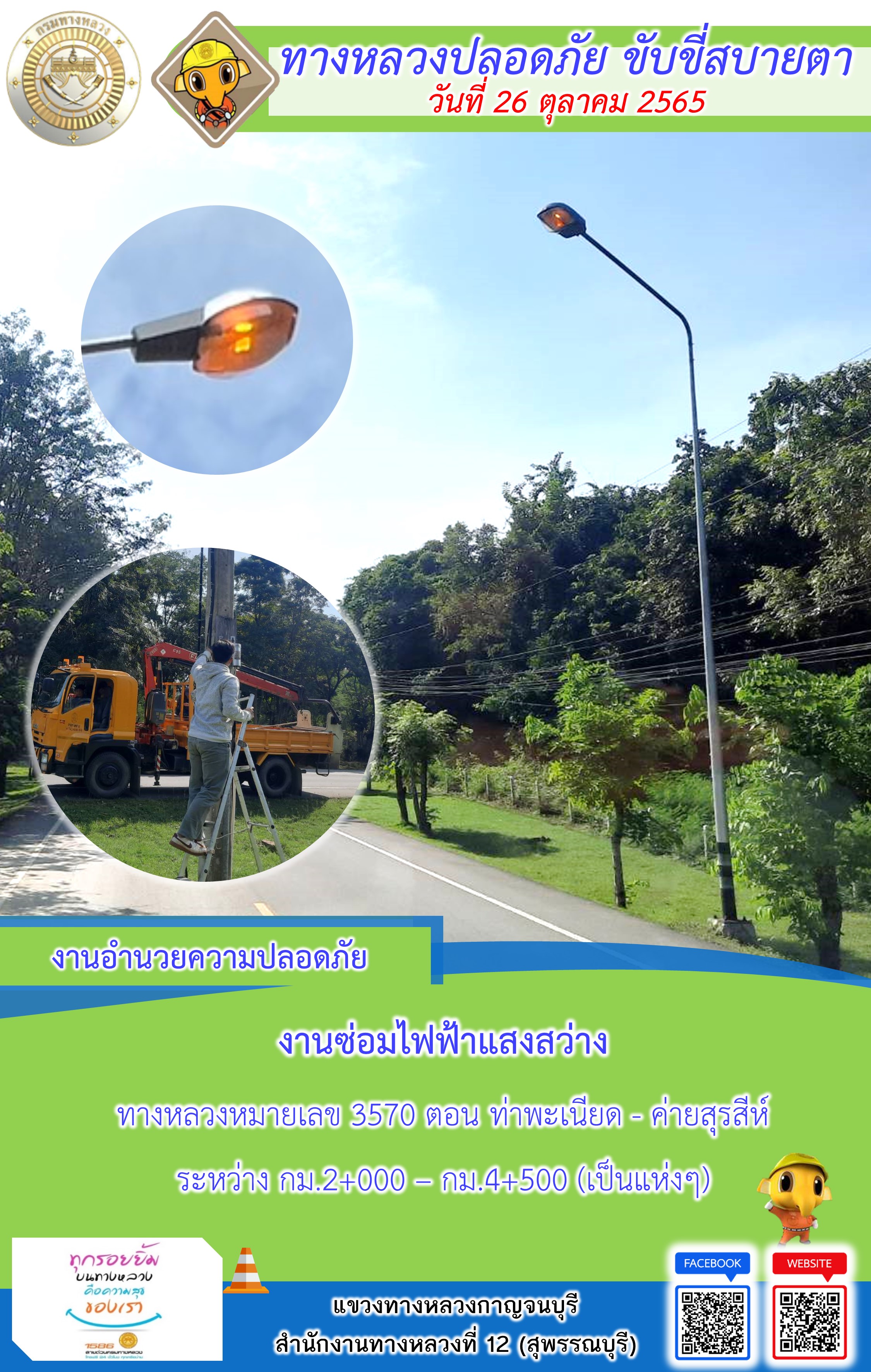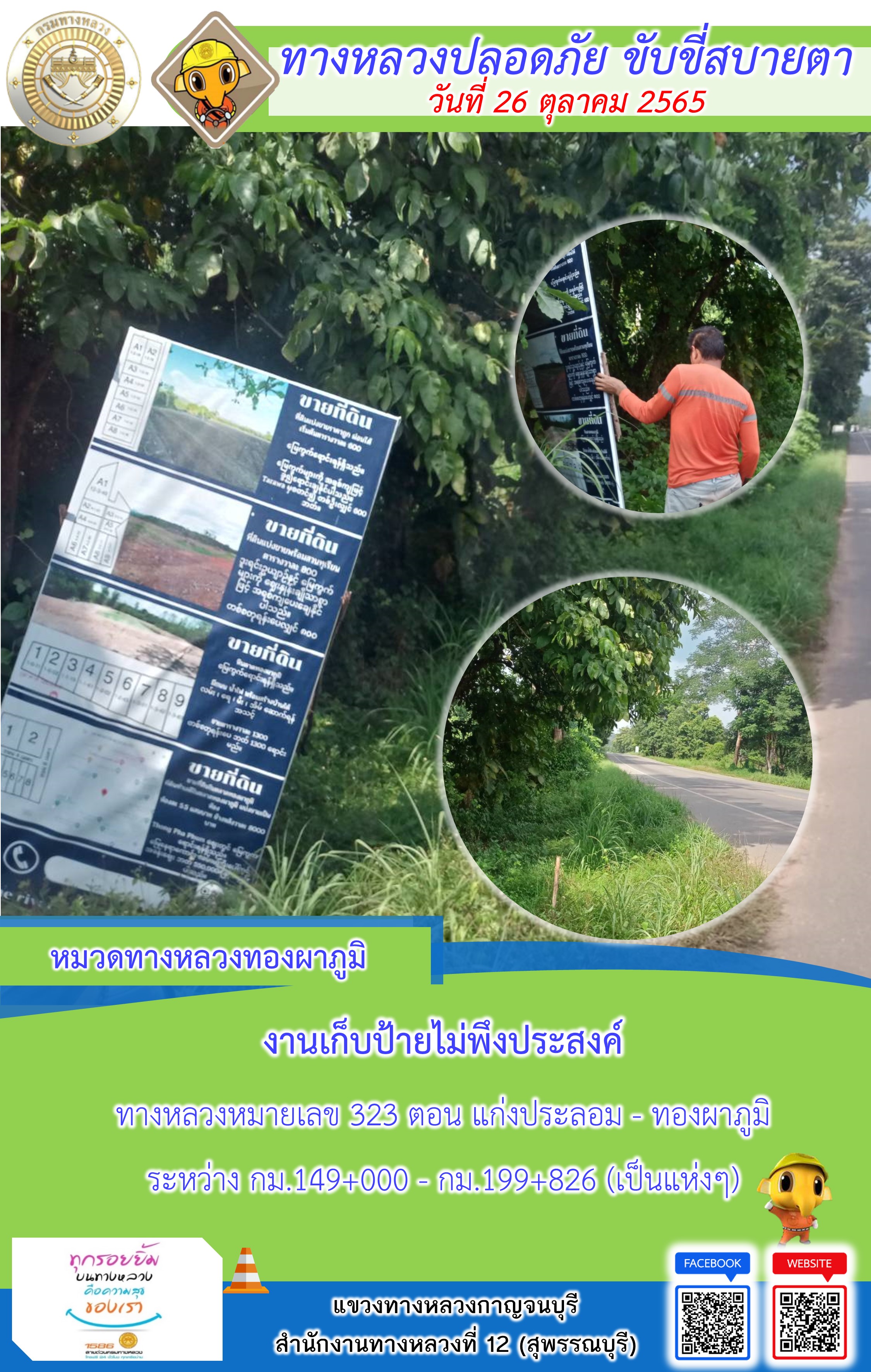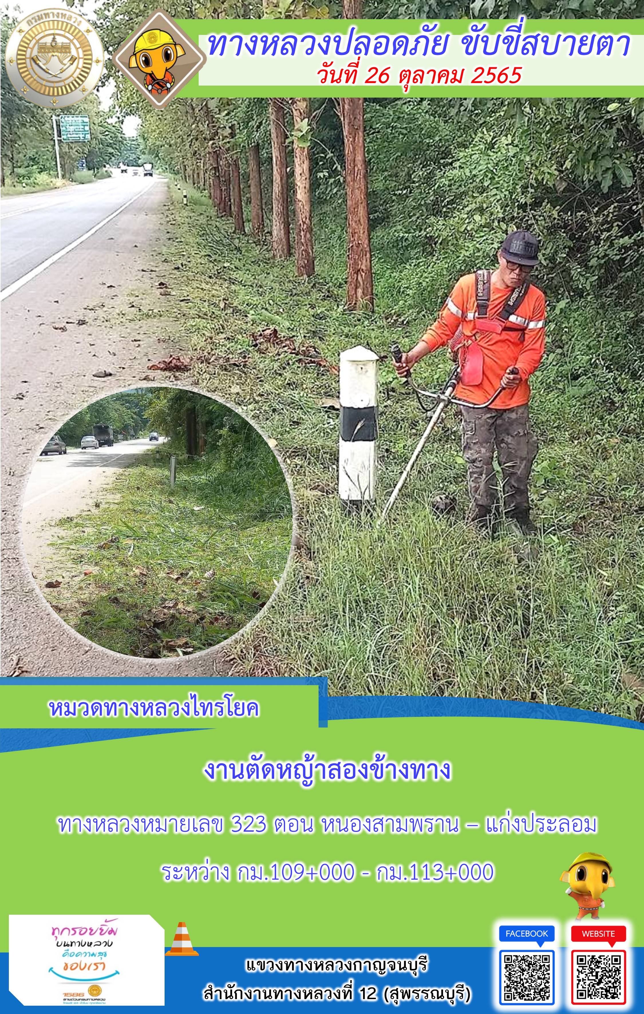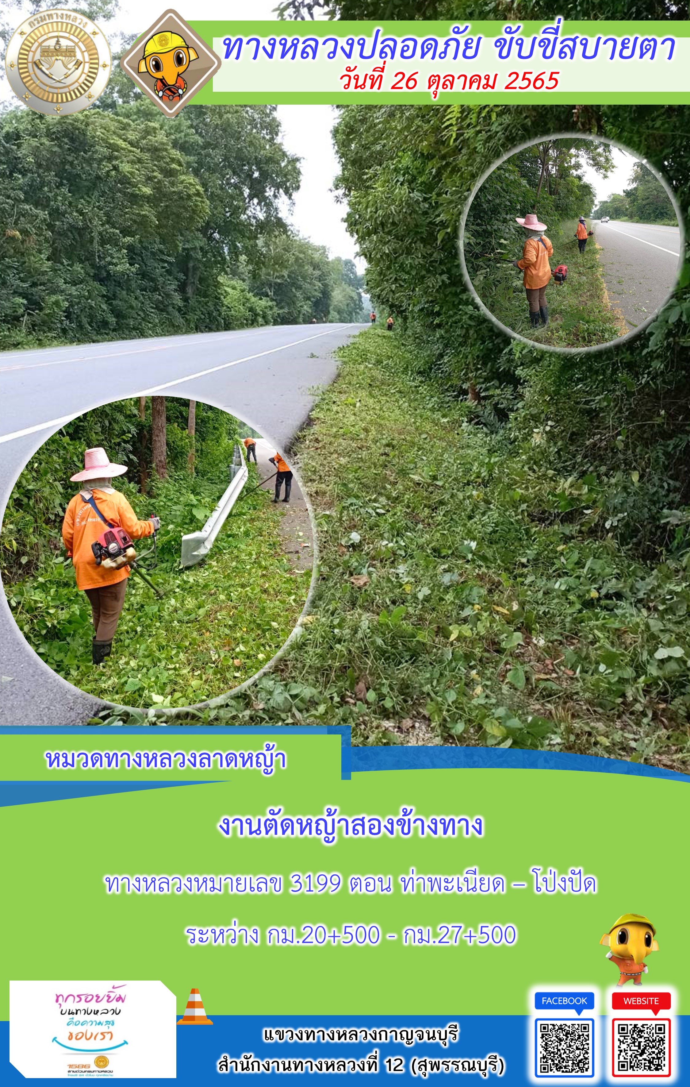 ข้อมูลภาพกิจกรรม : แขวงทางหลวงกาญจนบุรี โดยหมวดทางหลวงในสังกัดและงานอำนวยความปลอดภัย ปฏิบัติงาน ประจำวันที่ 26 ต.ค. 65 #กรมทางหลวง #สายด่วนกรมทางหลวง1586 #แขวงทางหลวงกาญจนบุรี โทร 034-520-598