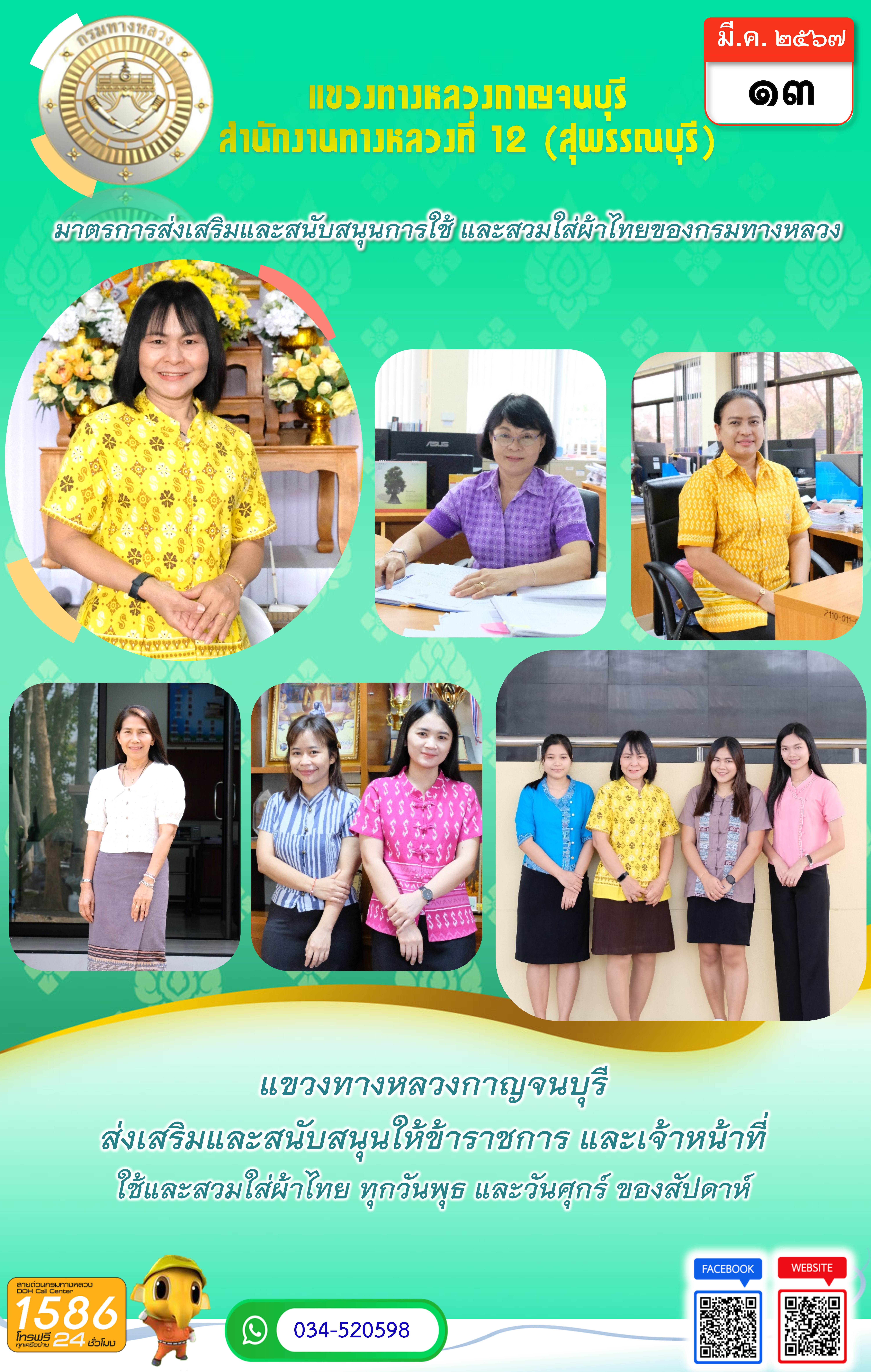 วันที่ 13 มี.ค. 2567 แขวงทางหลวงกาญจนบุรี รณรงค์แต่งกายด้วยผ้าไทย เพื่อส่งเสริมและสนับสนุนการใช้และสวมใส่ผ้าไทย เป็นการอนุรักษ์และสืบสานภูมิปัญญาของไทย สร้างค่านิยมและการตระหนักรับรู้การรักษามรดกและอัตลักษณ์ภูมิปัญญาของไทย