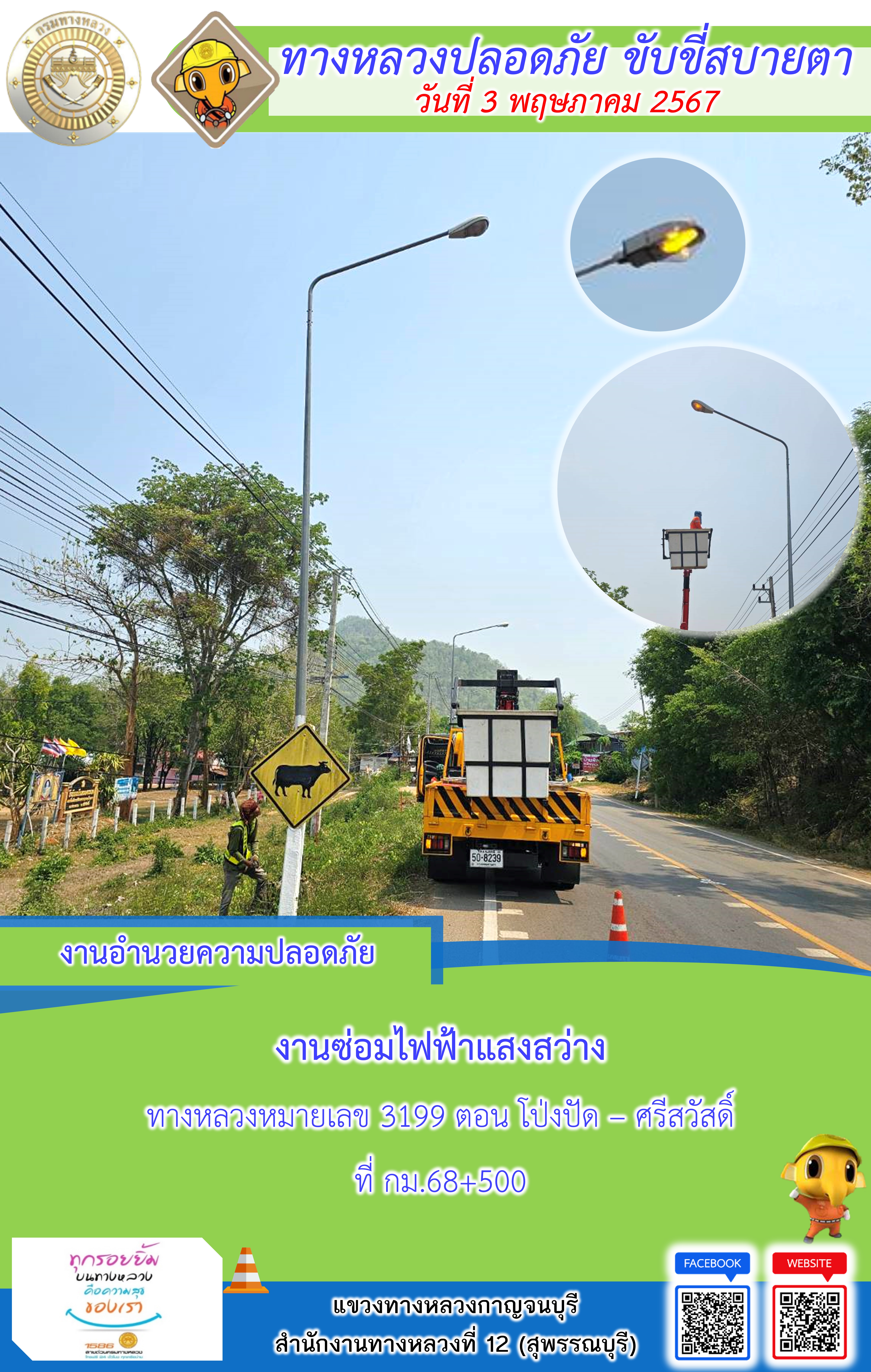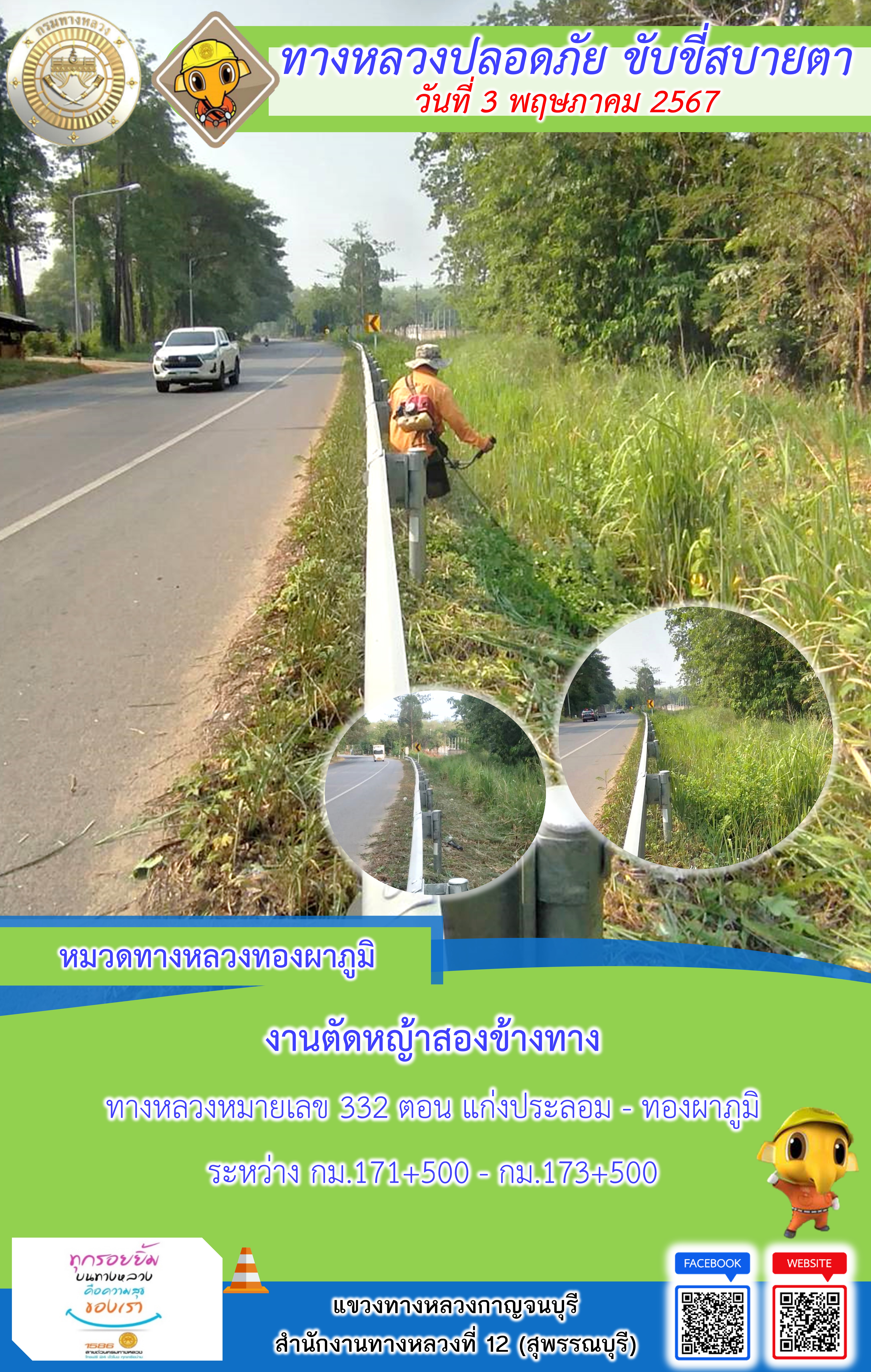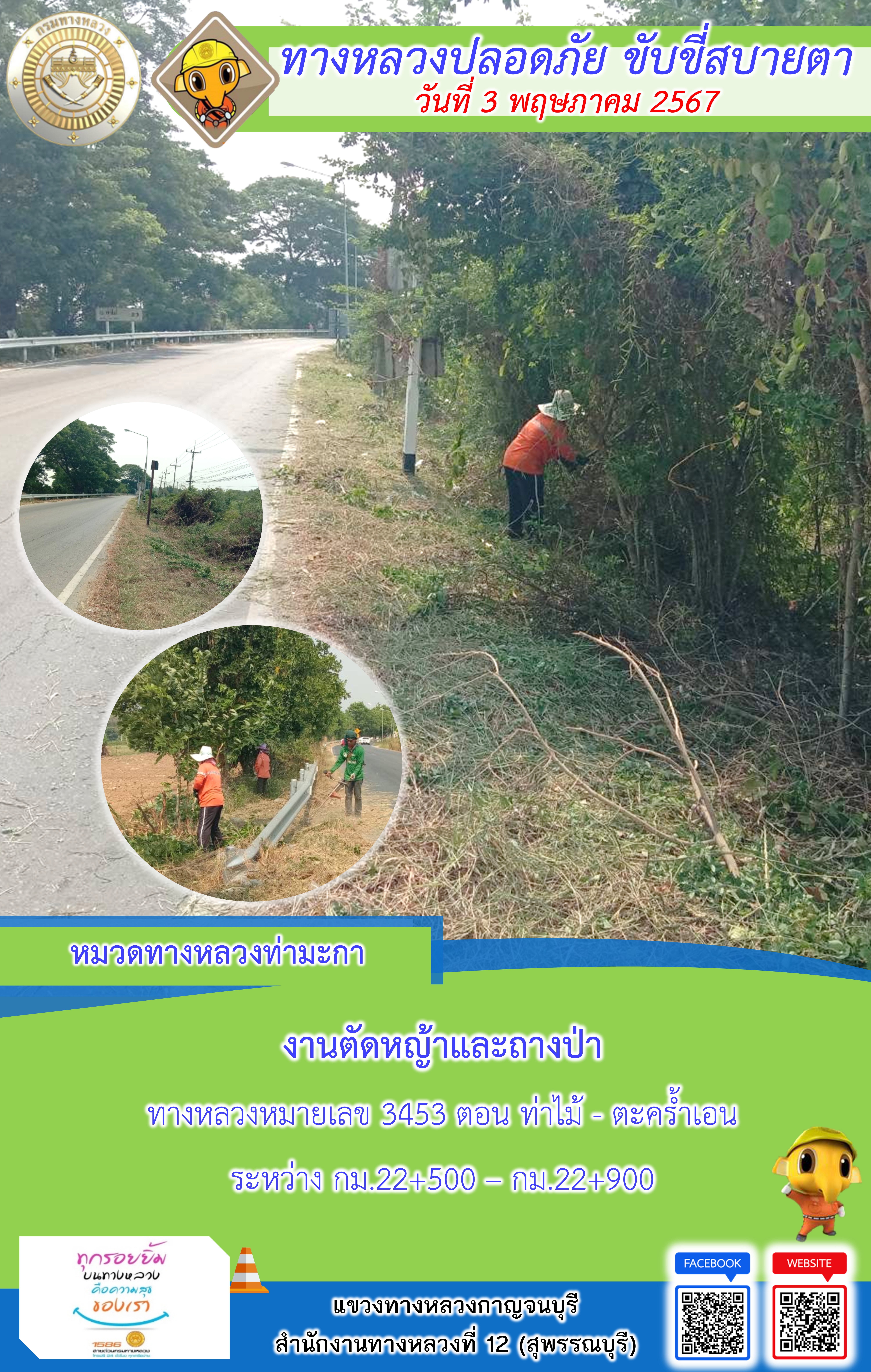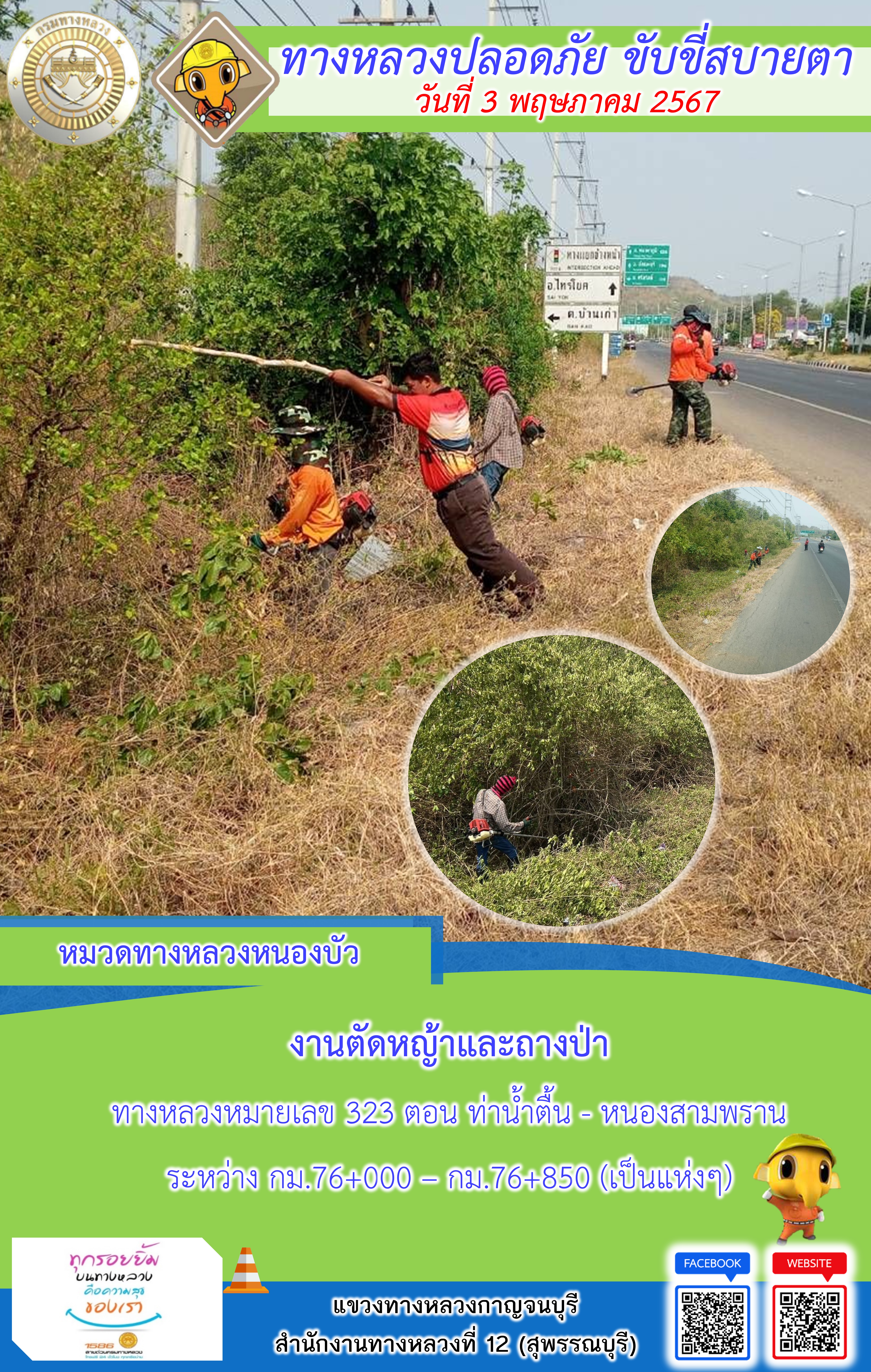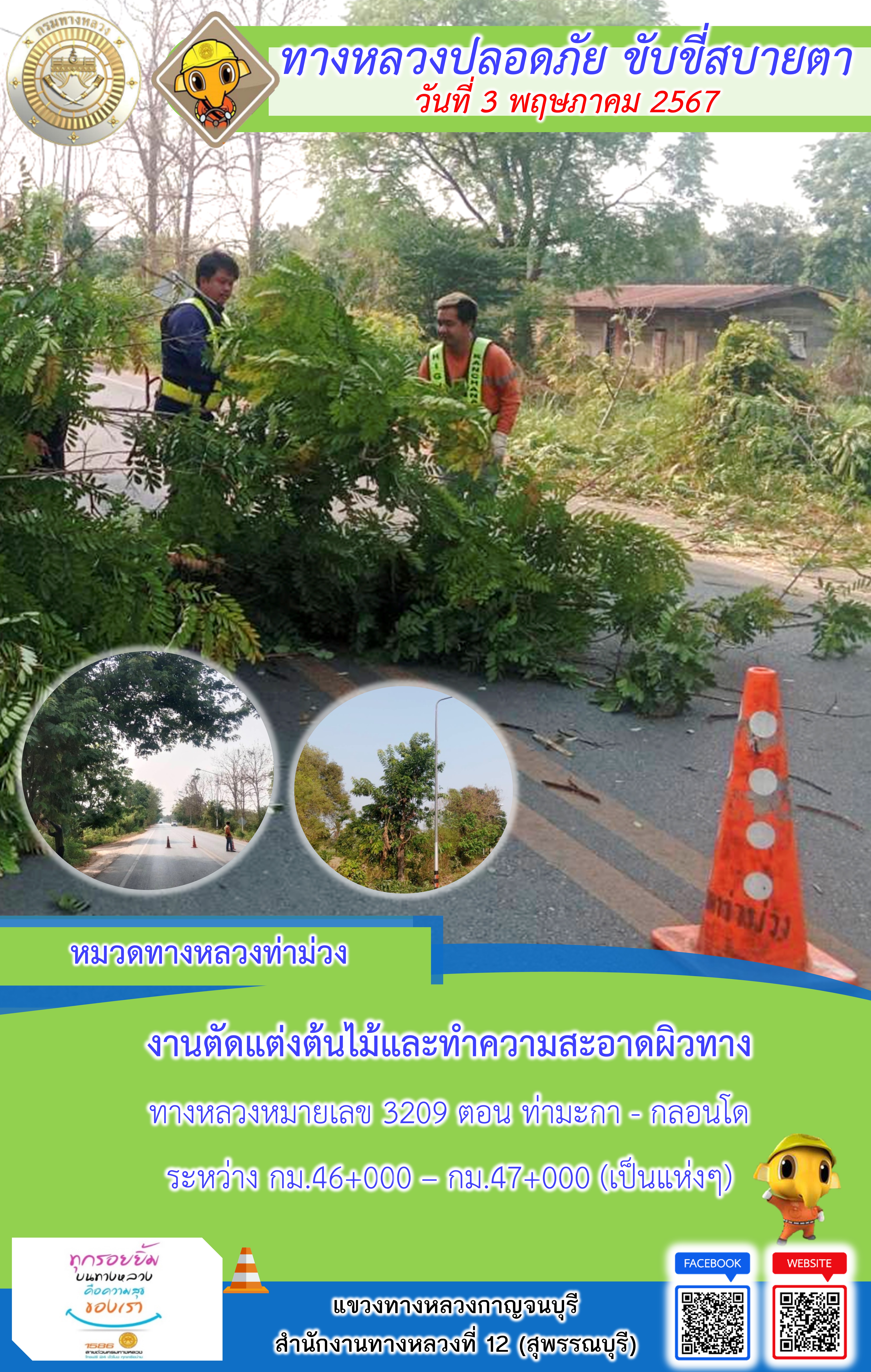 แขวงทางหลวงกาญจนบุรี โดยหมวดทางหลวงในสังกัด และงานอำนวยความปลอดภัยปฏิบัติงาน ประจำวันที่ 3 พ.ค. 67