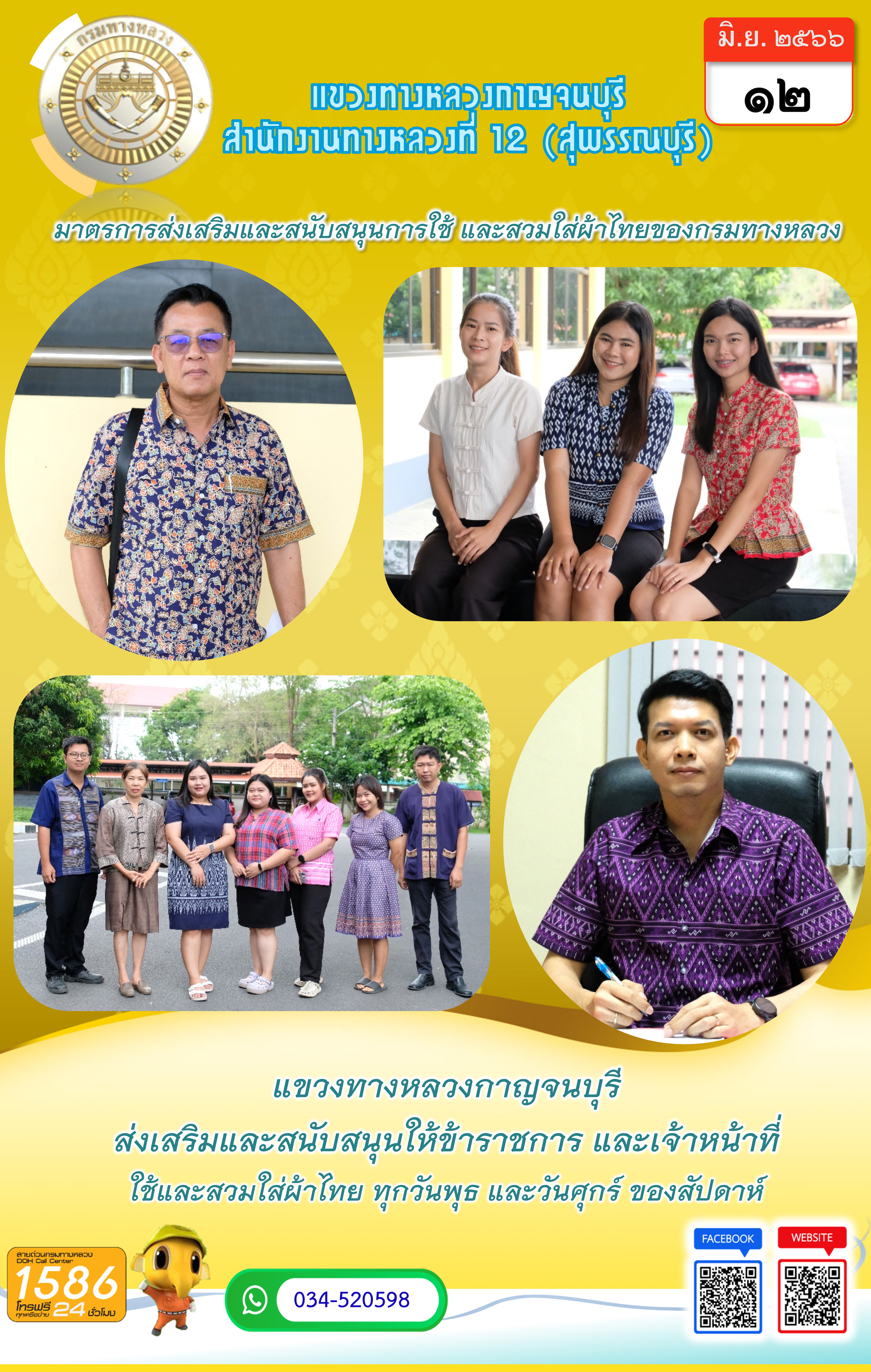 วันที่ 12 มิ.ย 2567 แขวงทางหลวงกาญจนบุรี รณรงค์แต่งกายด้วยผ้าไทยเพื่อส่งเสริมและสนับสนุนการใช้และสวมใส่ผ้าไทย เป็นการอนุรักษ์และสืบสานภูมิปัญญาของไทย สร้างค่านิยมและการตระหนักรับรู้การรักษามรดกและอัตลักษณ์ภูมิปัญญาของไทย
