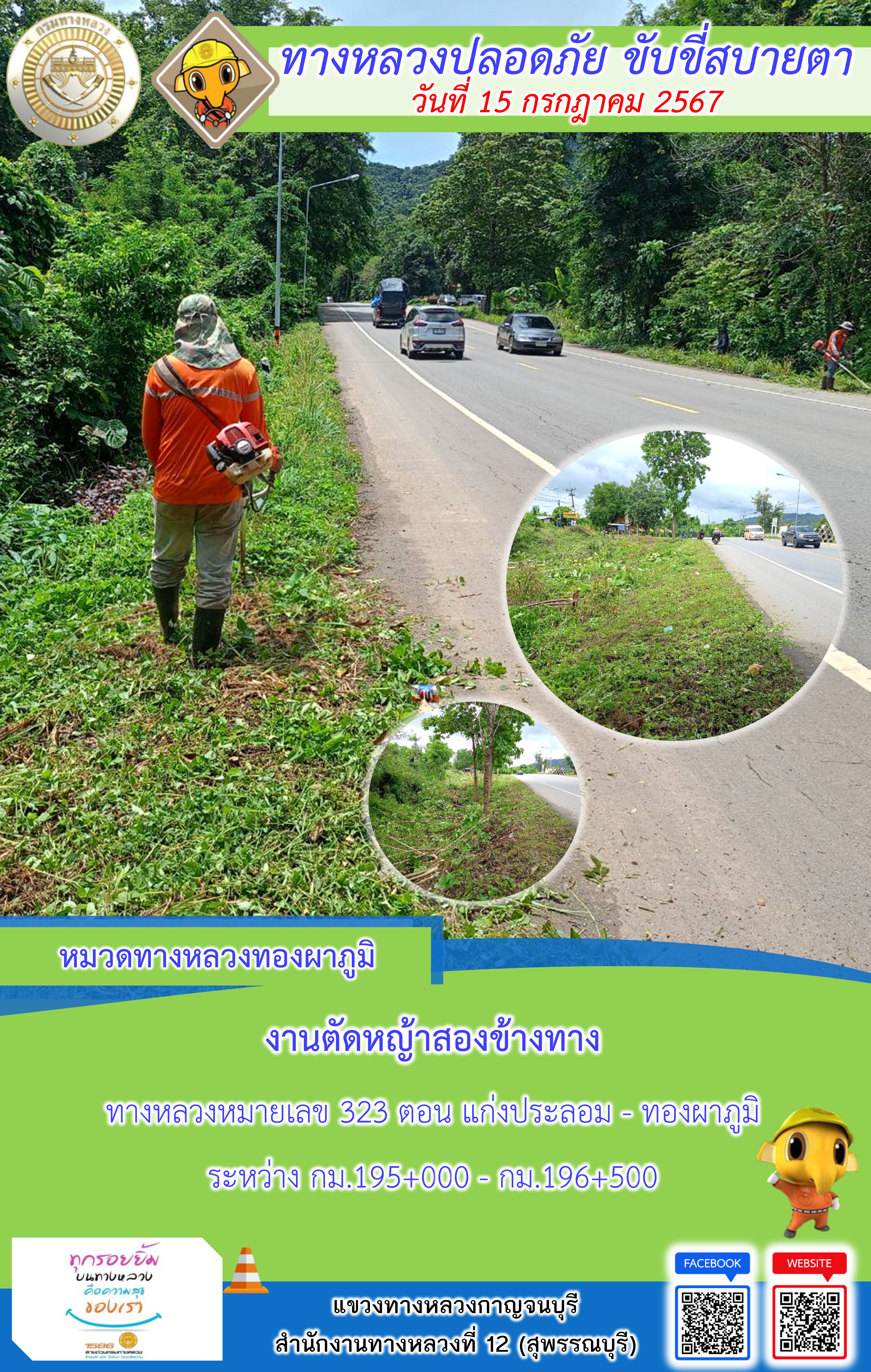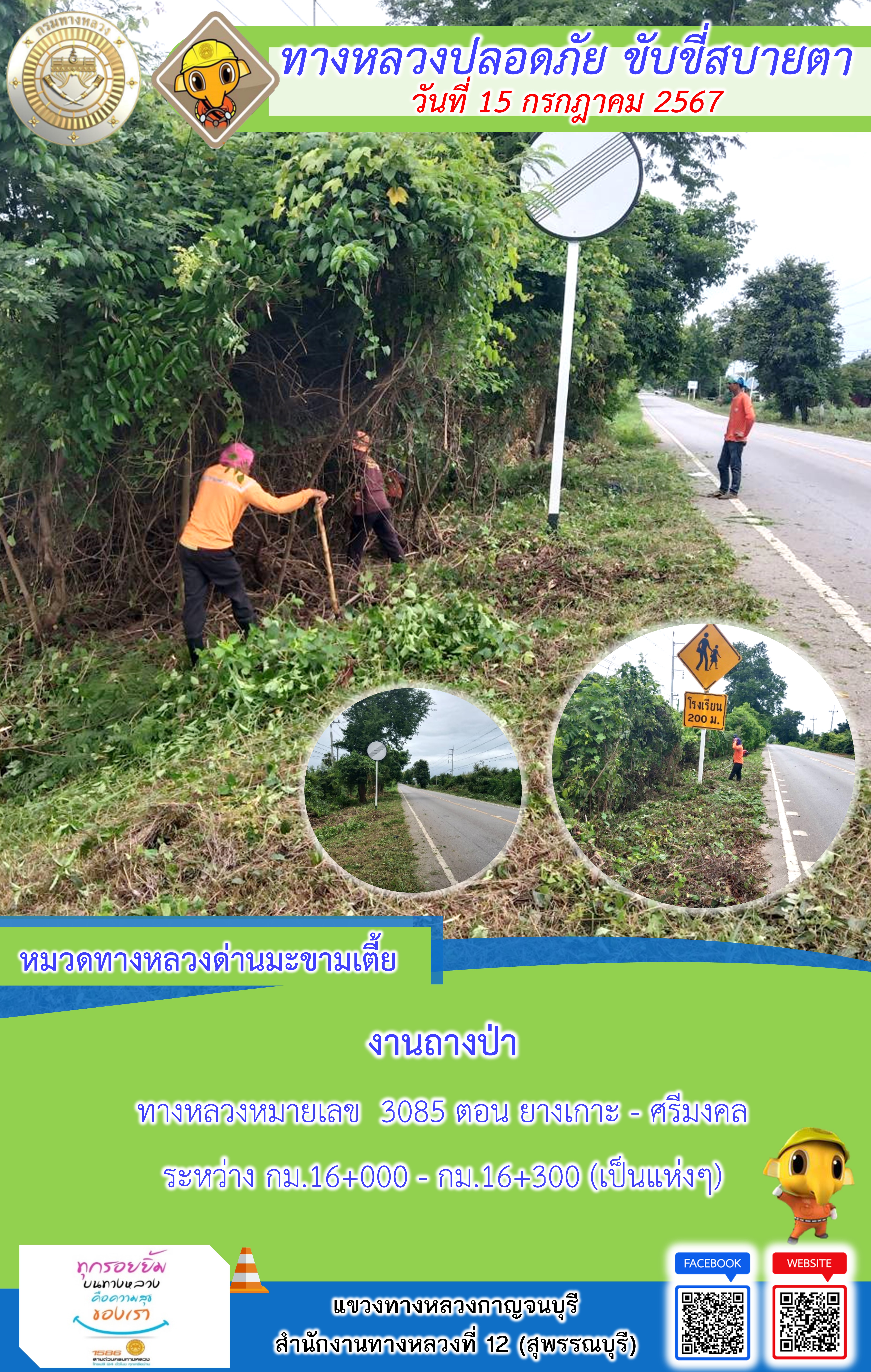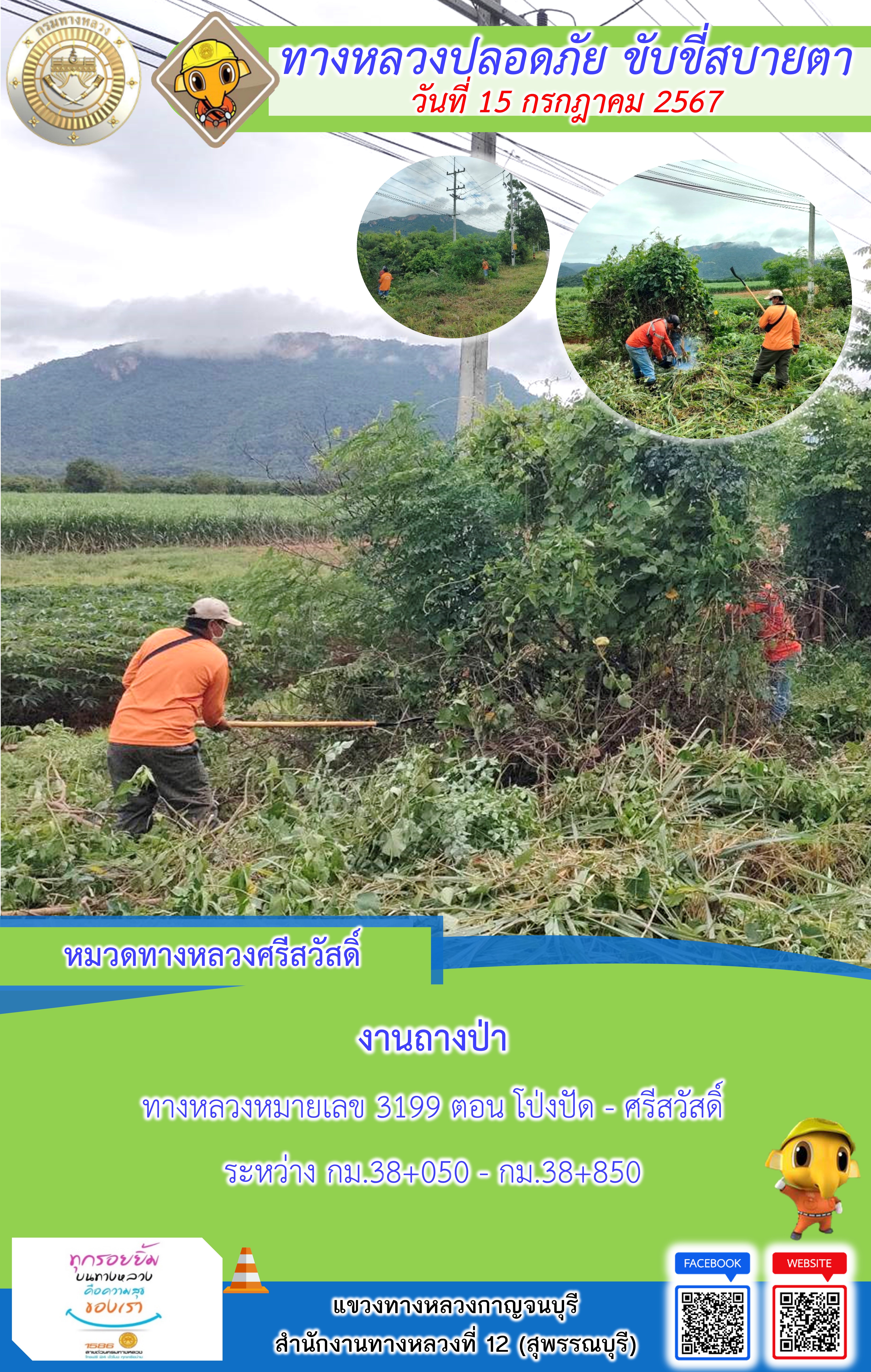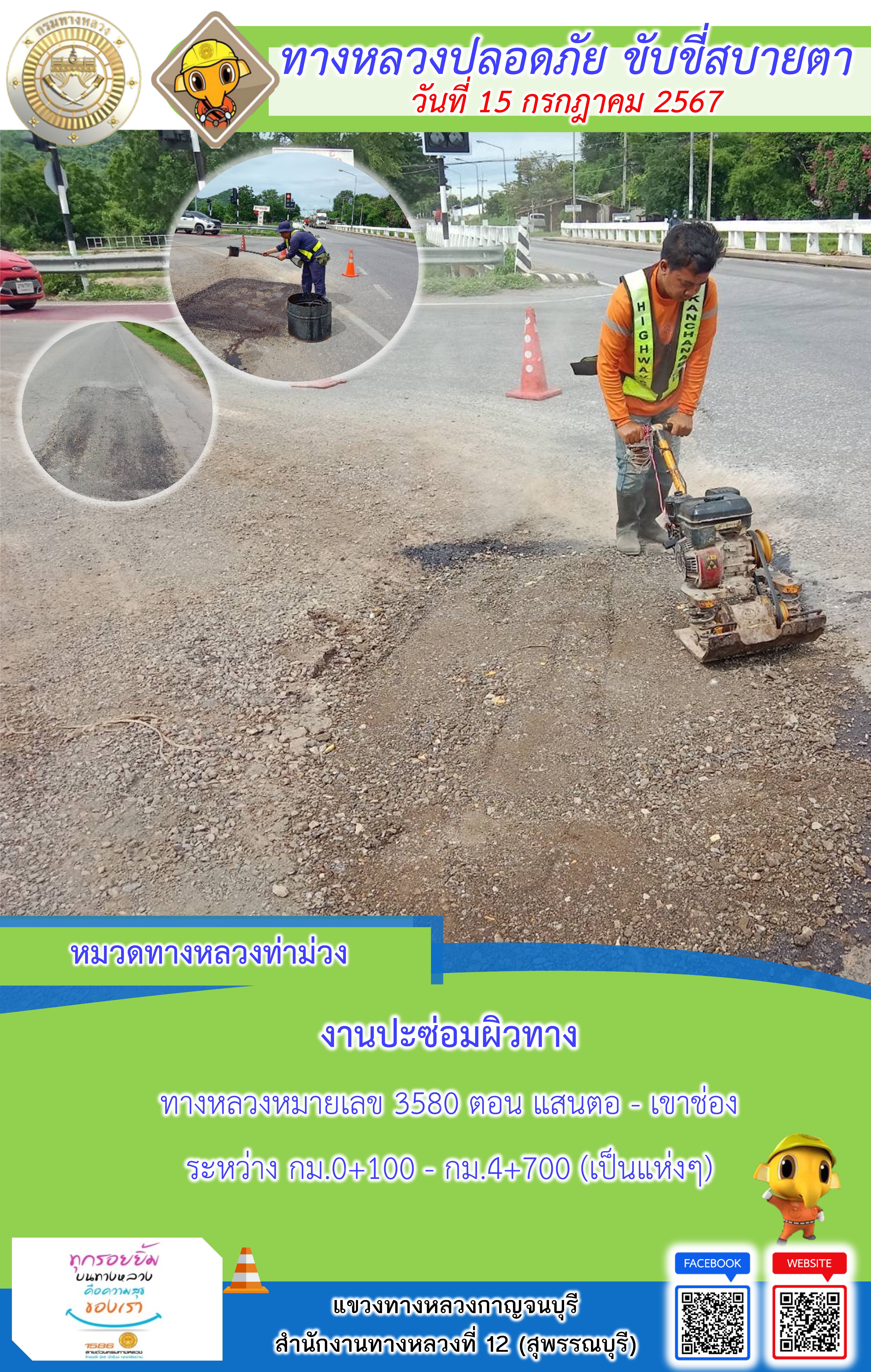 แขวงทางหลวงกาญจนบุรี โดยหมวดทางหลวงในสังกัด และงานอำนวยความปลอดภัยปฏิบัติงาน ประจำวันที่ 15 ก.ค. 67