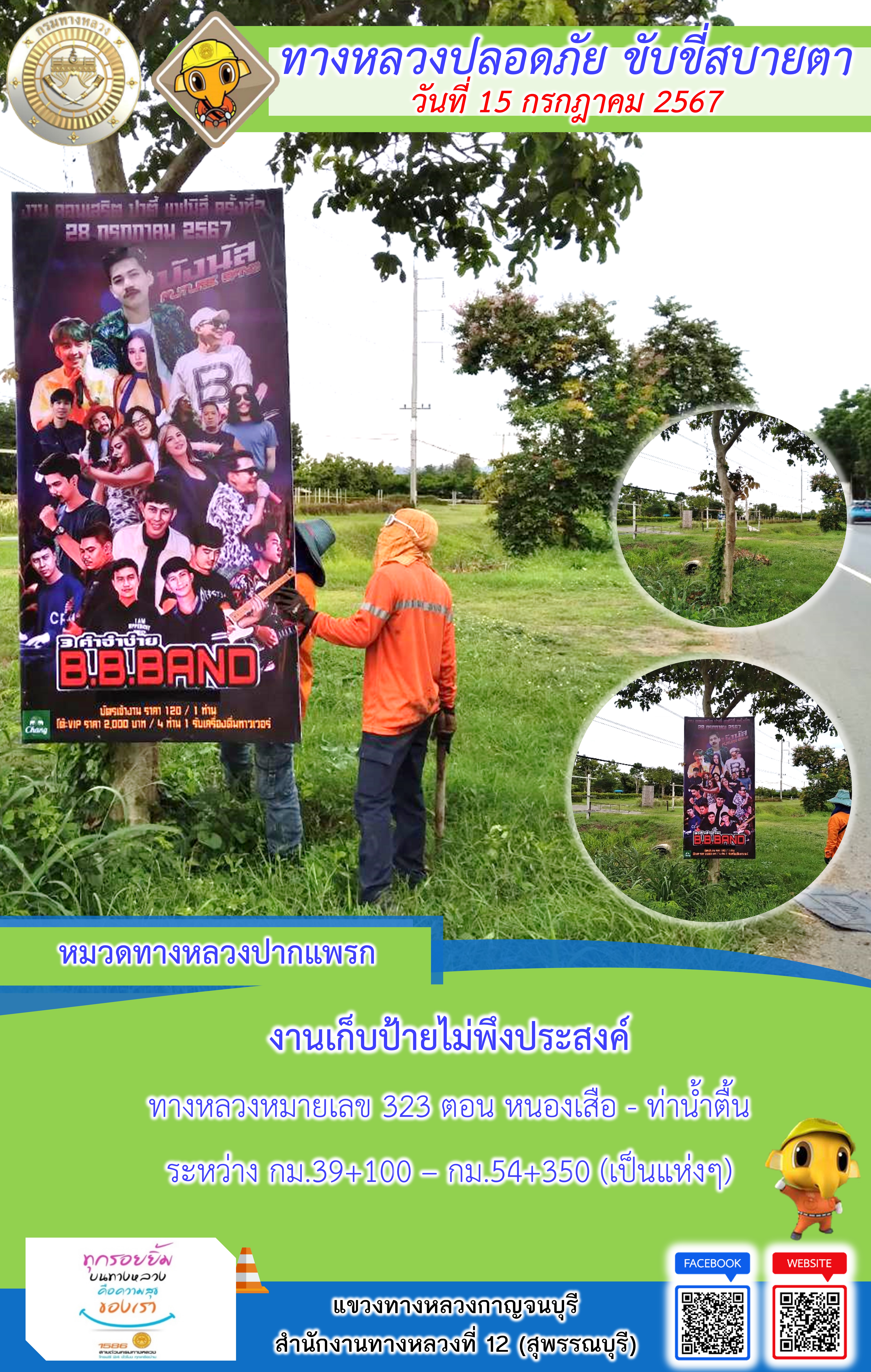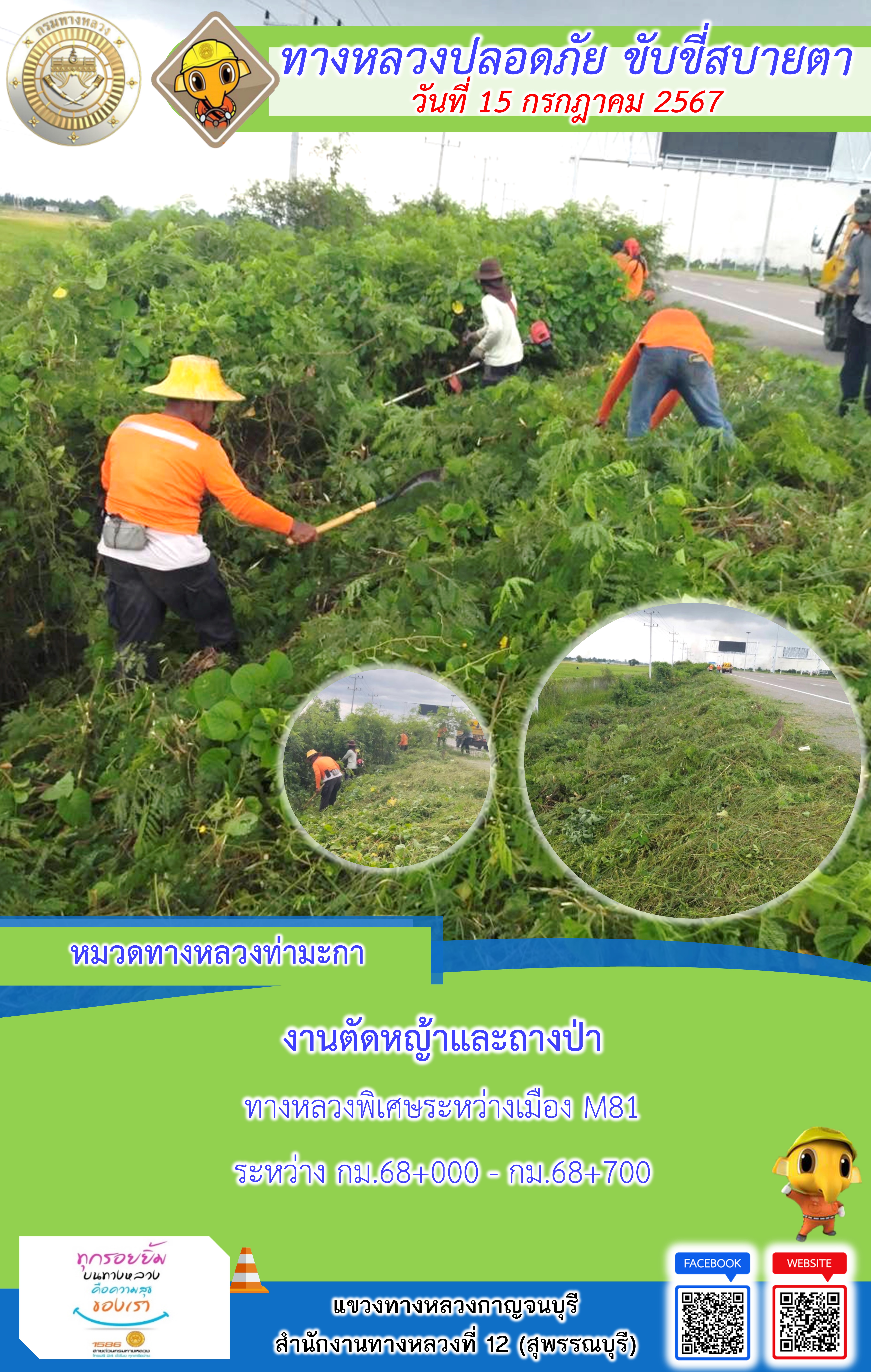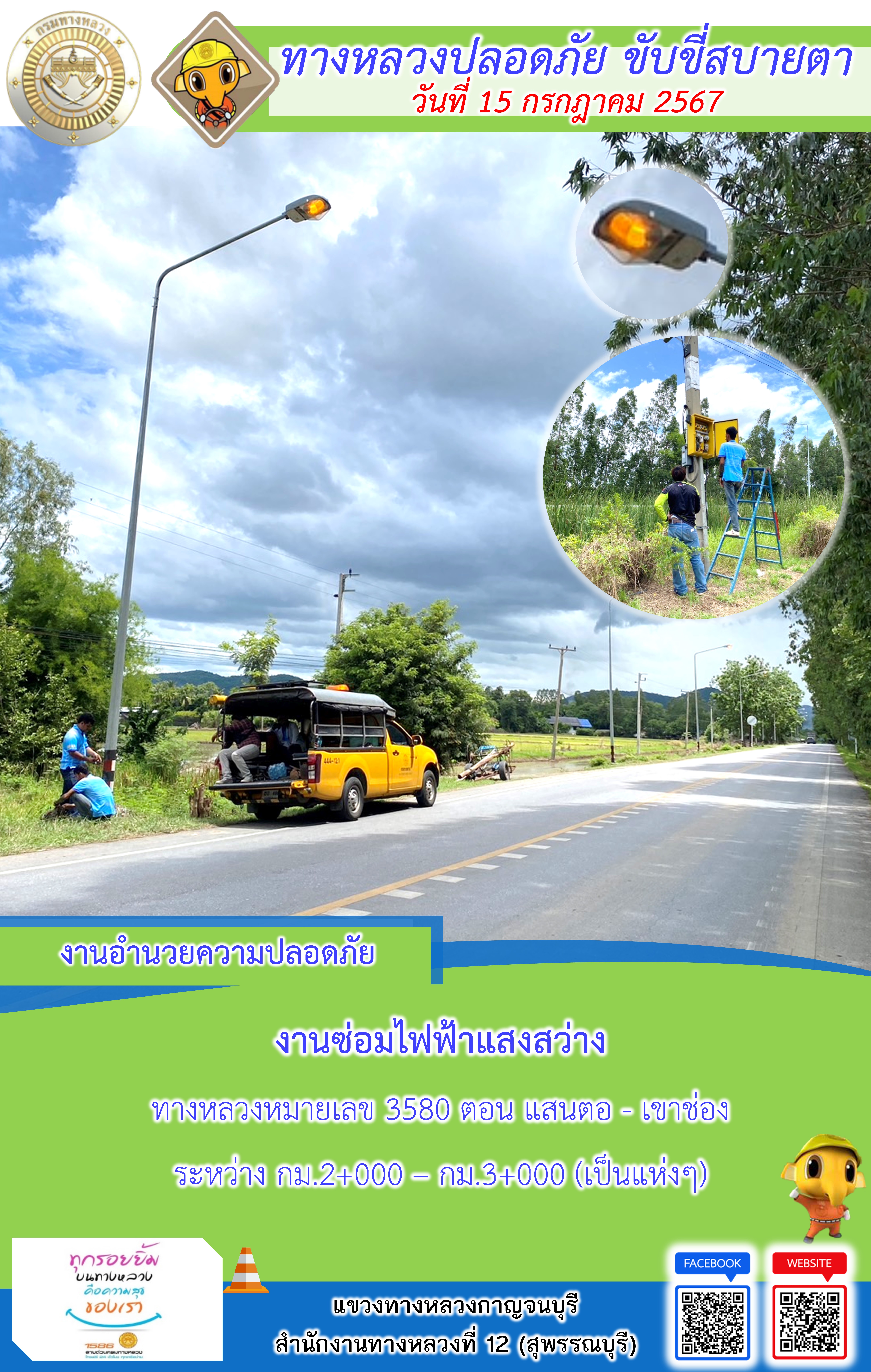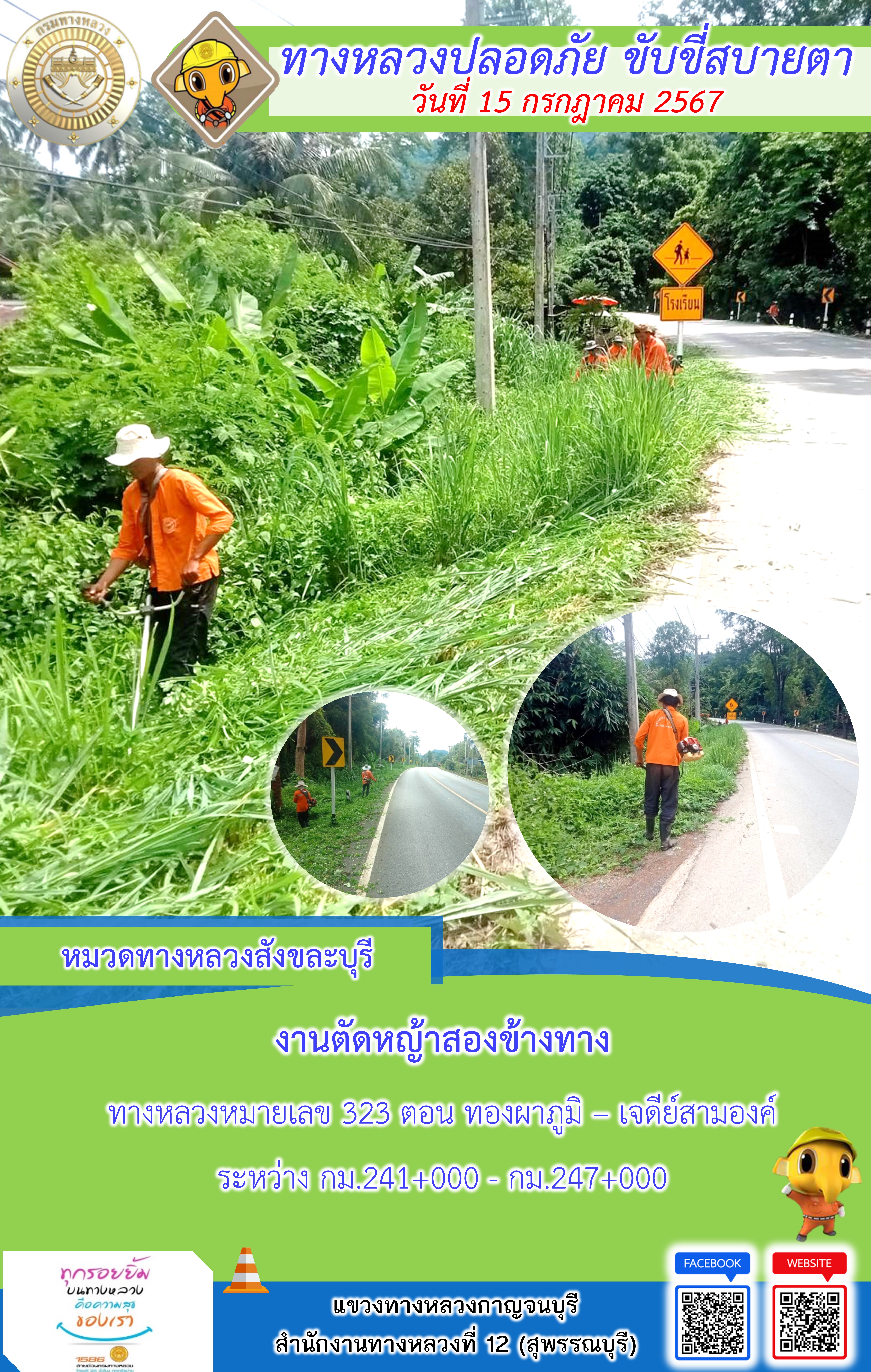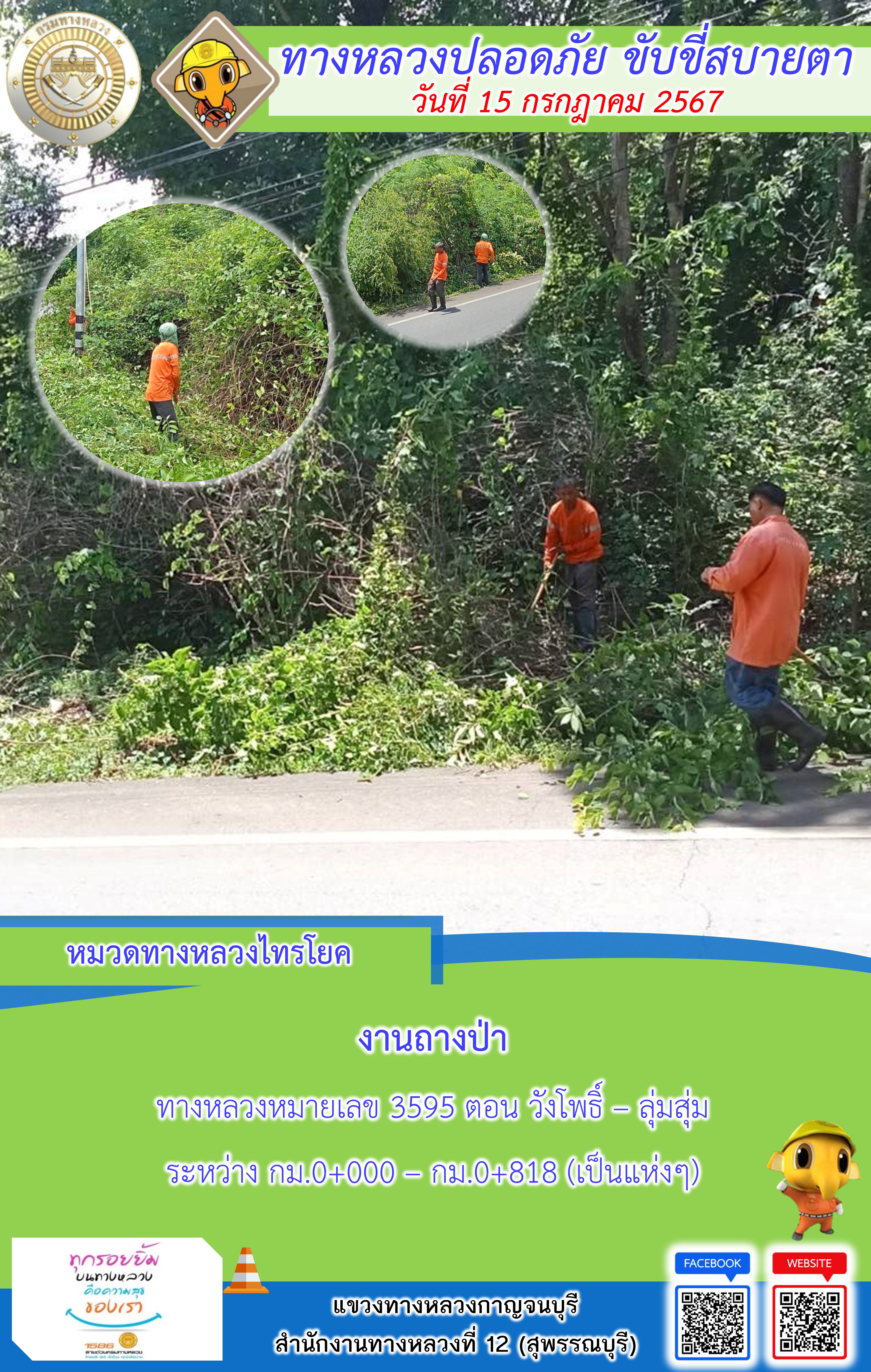แขวงทางหลวงกาญจนบุรี โดยหมวดทางหลวงในสังกัด และงานอำนวยความปลอดภัยปฏิบัติงาน ประจำวันที่ 15 ก.ค. 67