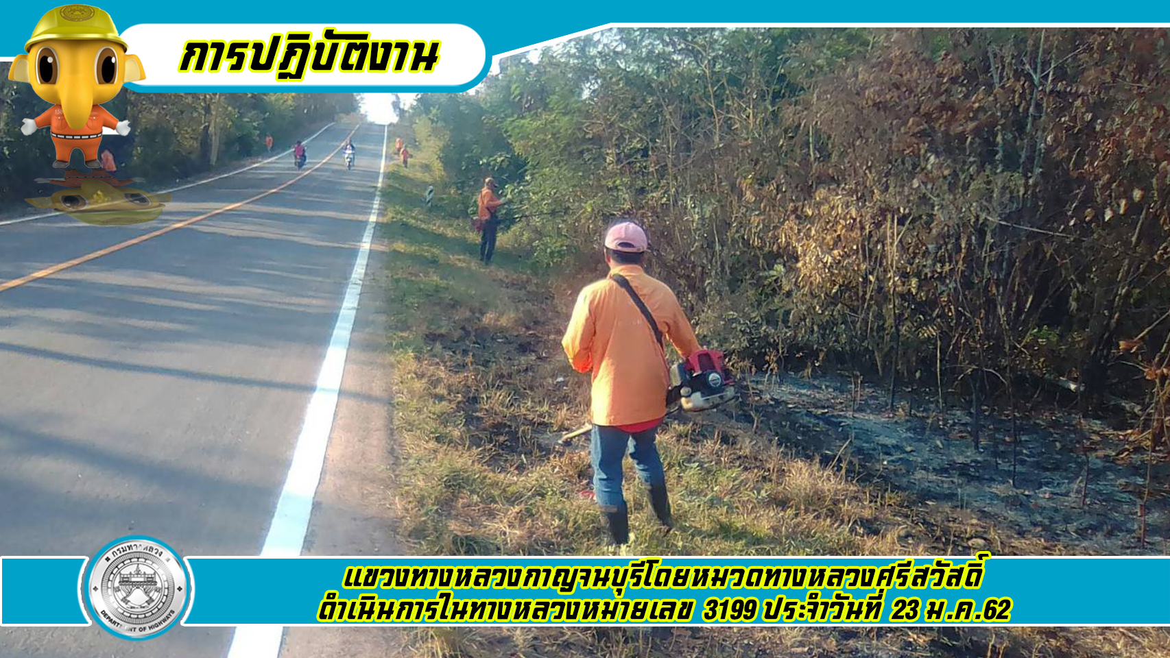 ข้อมูลภาพกิจกรรม : แขวงทางหลวงกาญจนบุรีโดยหมวดทางหลวงศรีสวัสดิ์ ดำเนินการในทางหลวงหมายเลข 3199 23/01/62