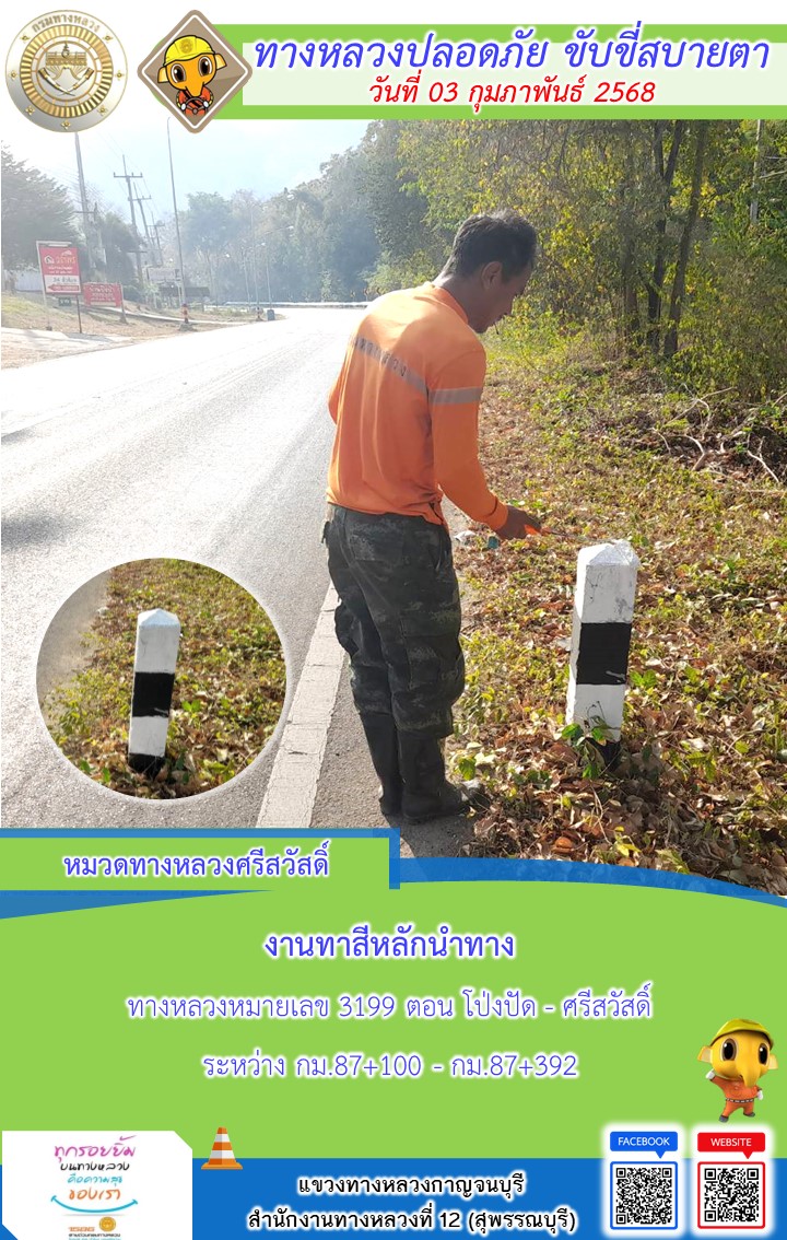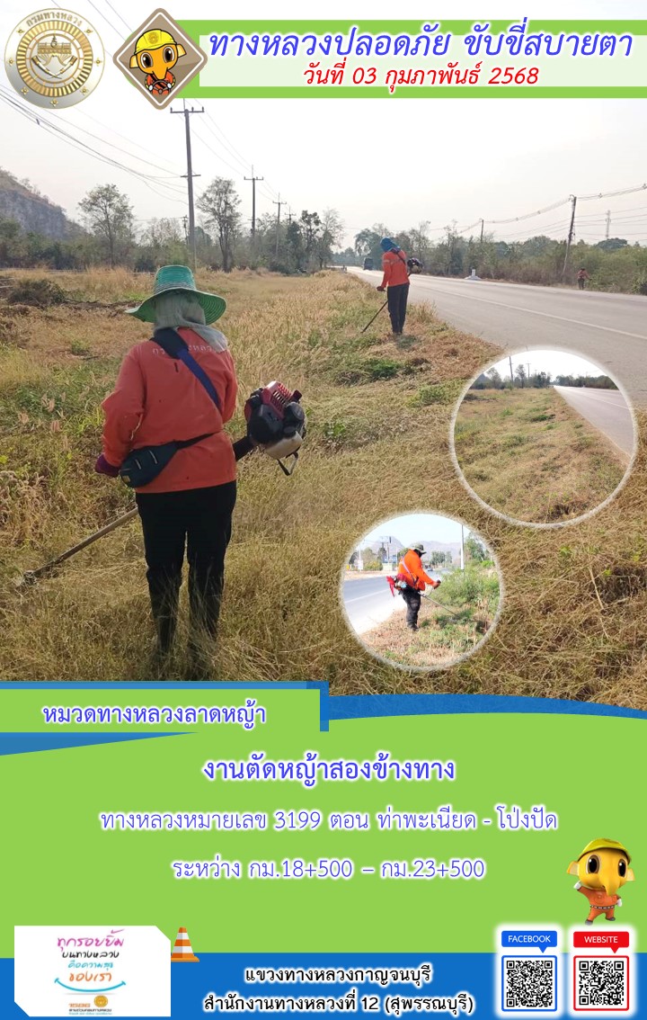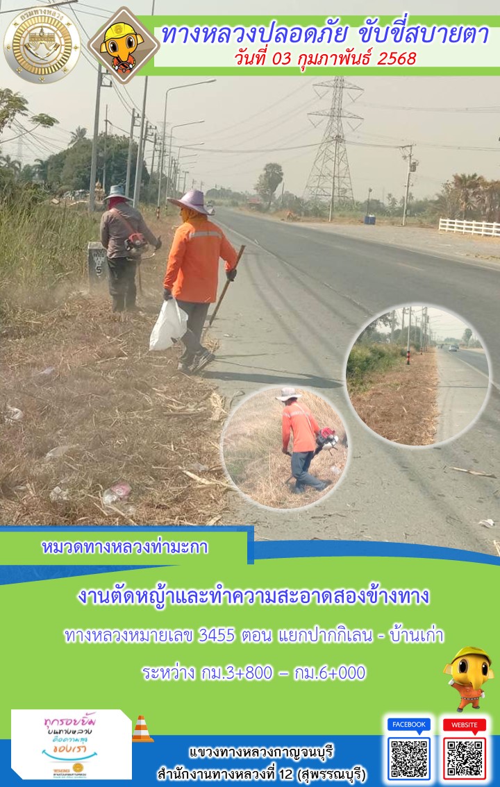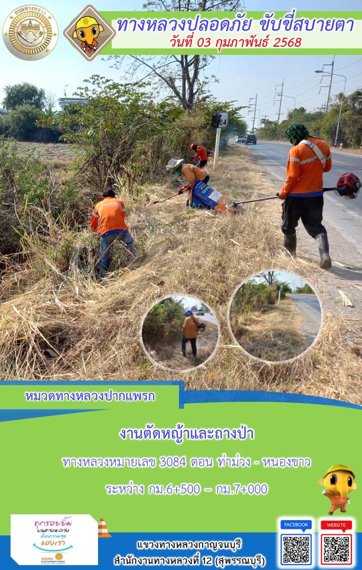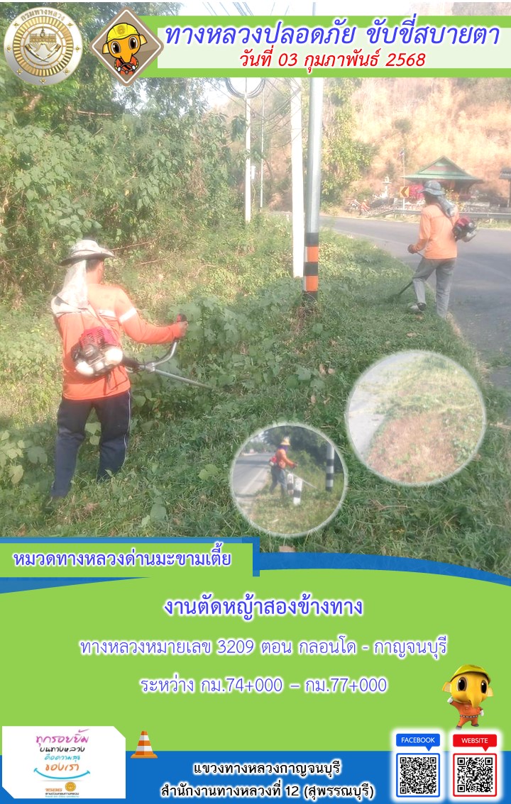 แขวงทางหลวงกาญจนบุรี โดยหมวดทางหลวงในสังกัด และงานอำนวยความปลอดภัยปฏิบัติงาน ประจำวันที่ 03 ก.พ. 68