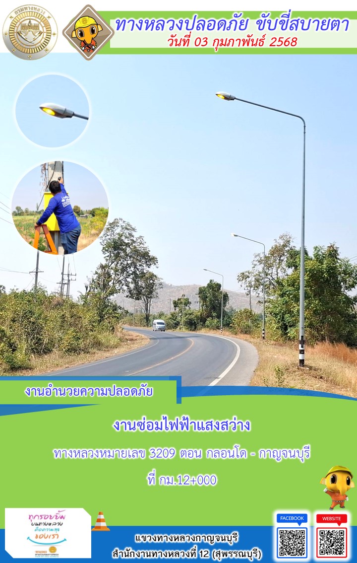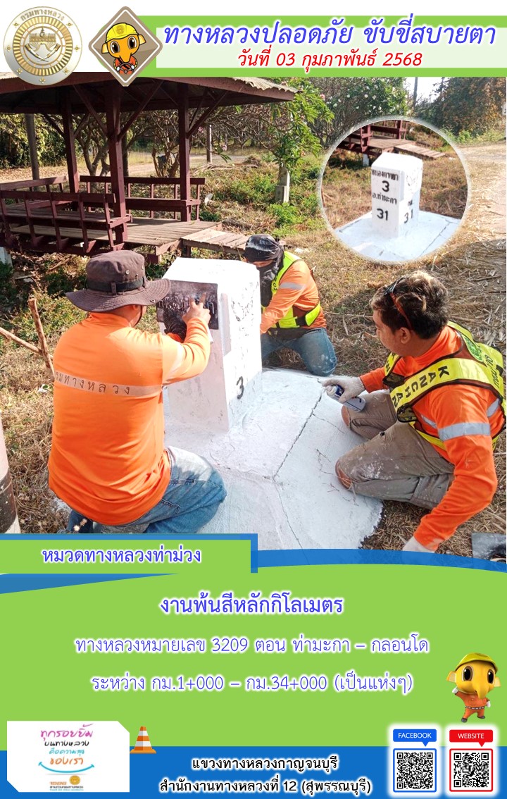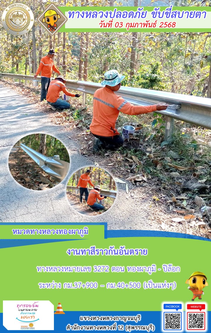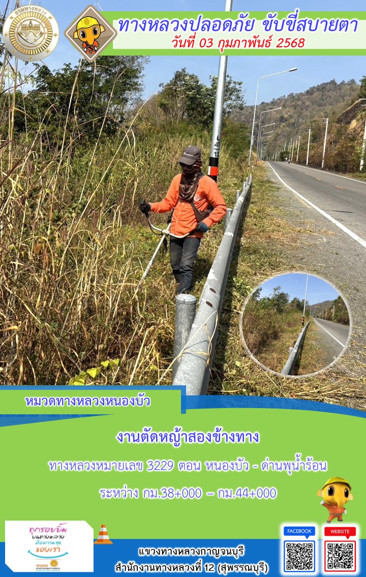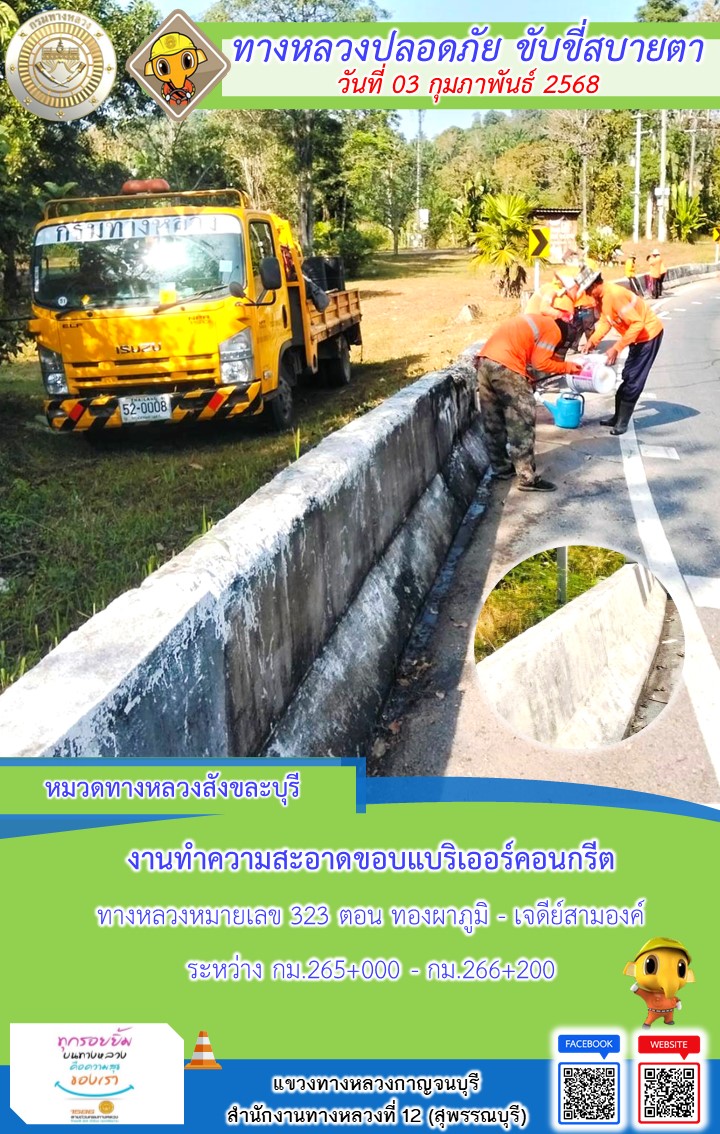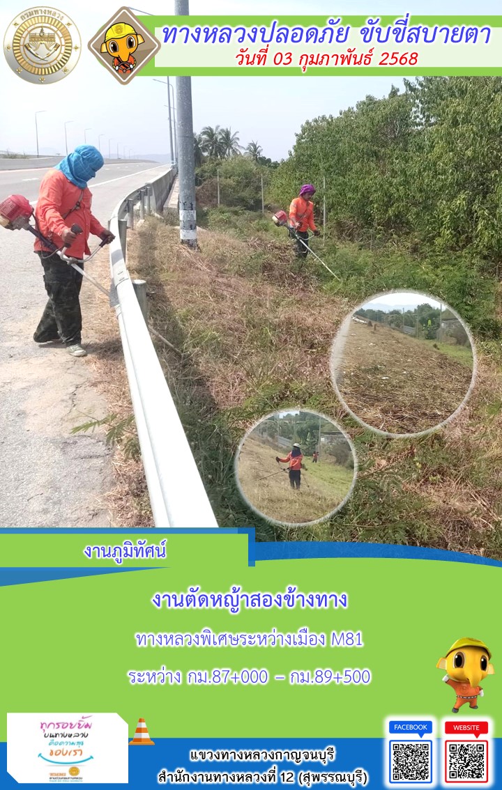 แขวงทางหลวงกาญจนบุรี โดยหมวดทางหลวงในสังกัด และงานอำนวยความปลอดภัยปฏิบัติงาน ประจำวันที่ 03 ก.พ. 68