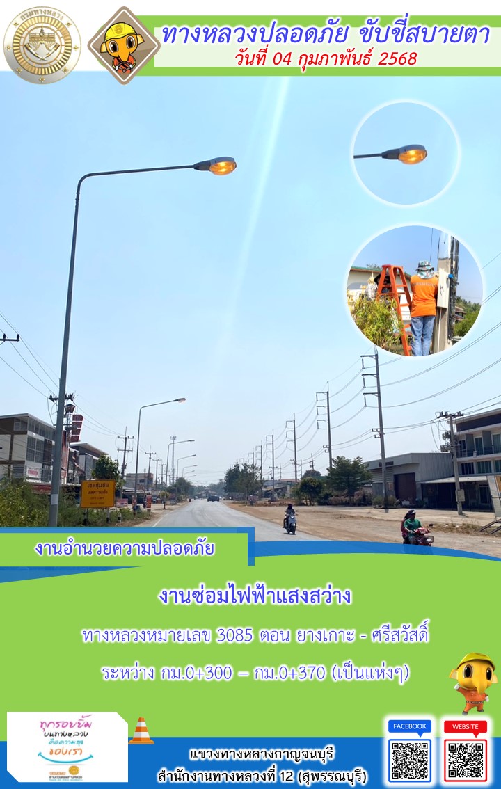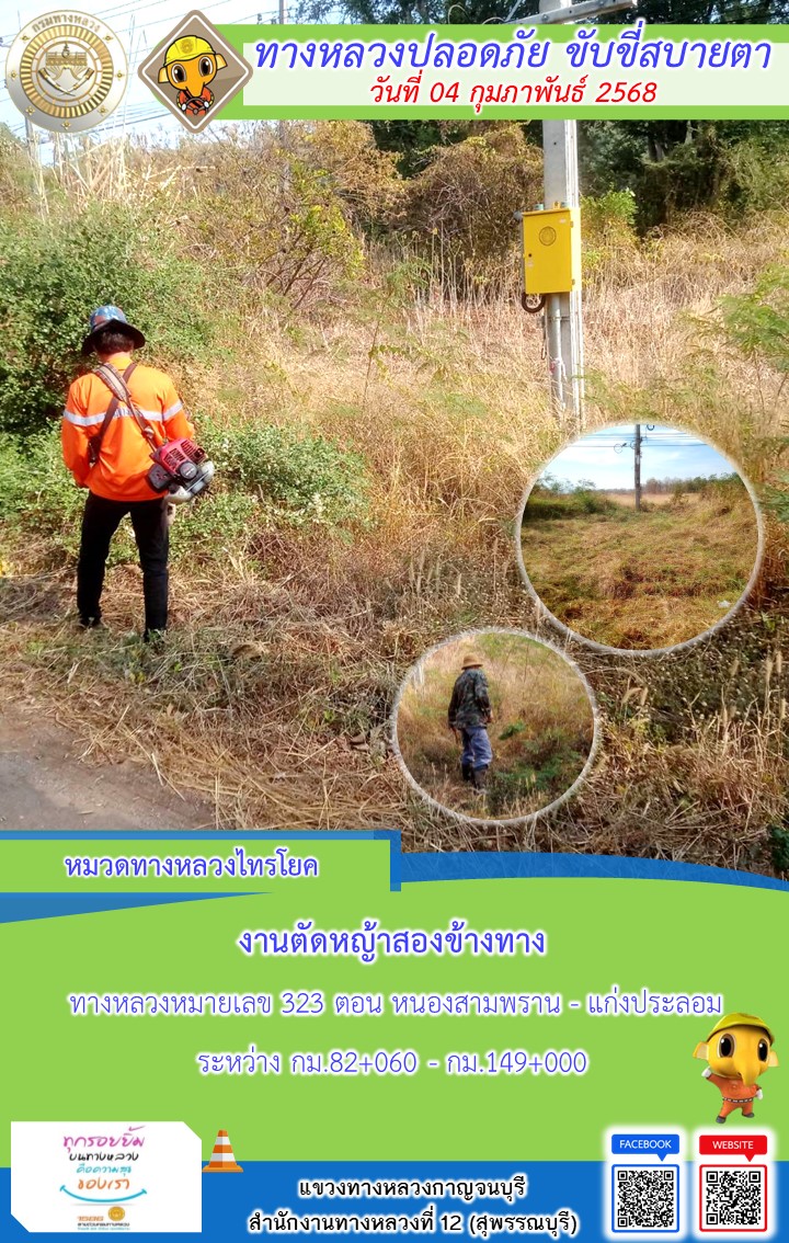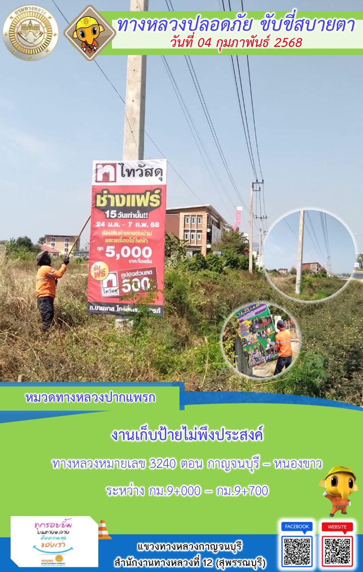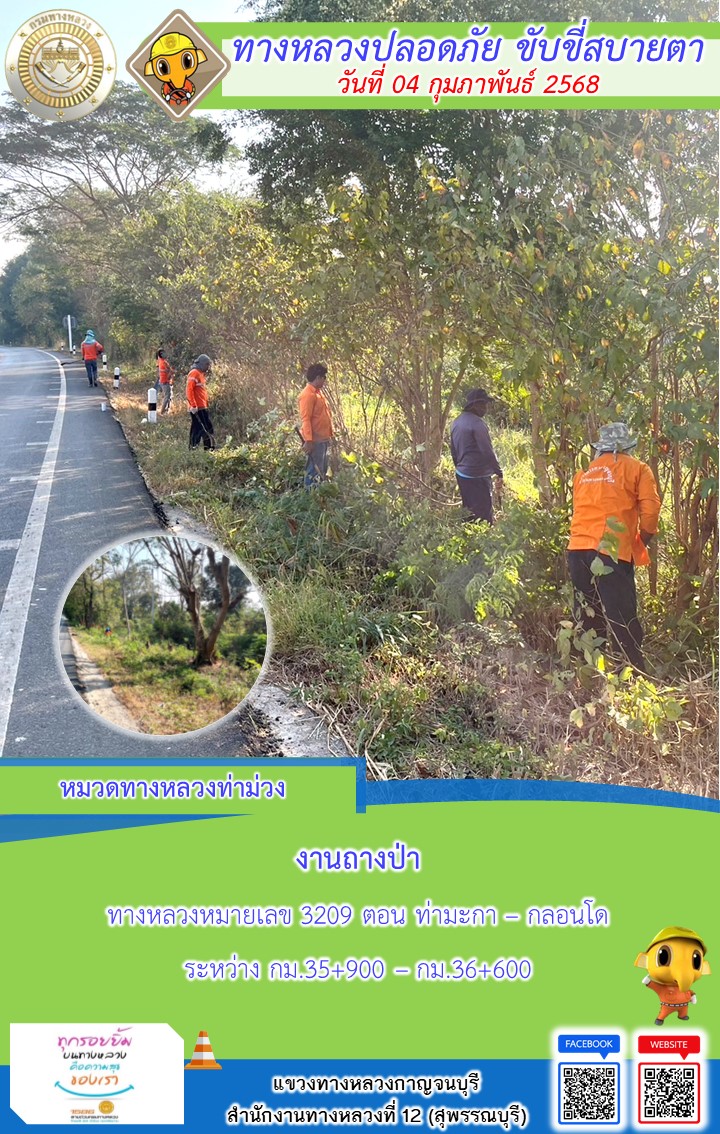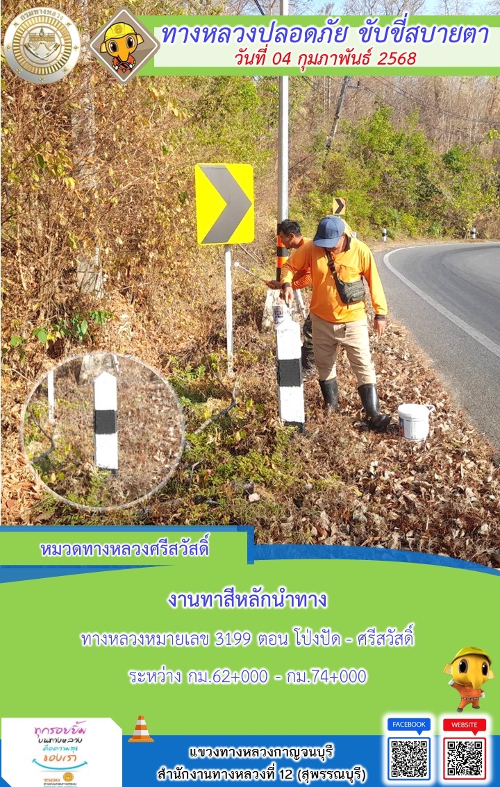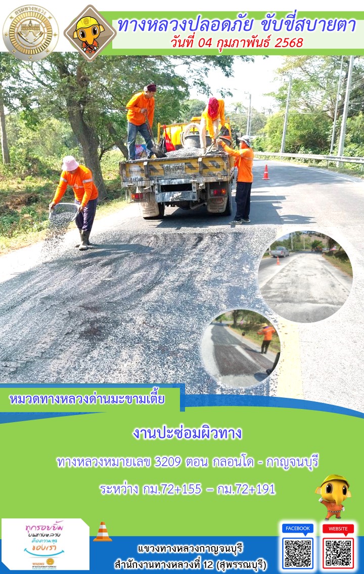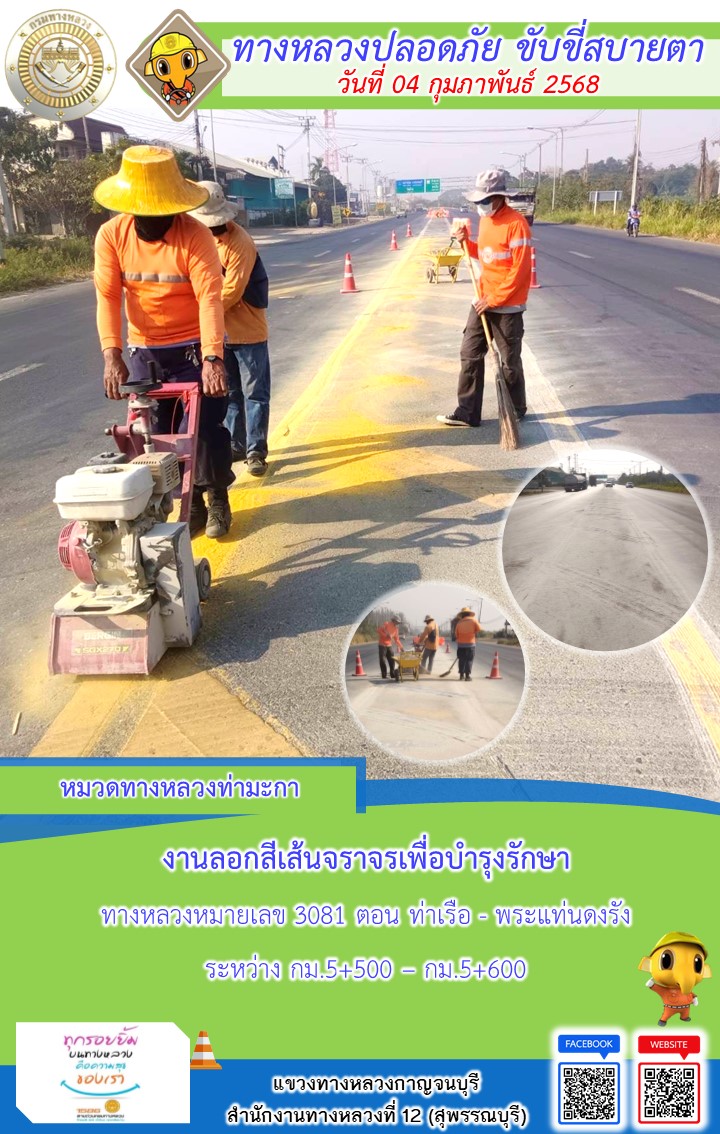 แขวงทางหลวงกาญจนบุรี โดยหมวดทางหลวงในสังกัด และงานอำนวยความปลอดภัยปฏิบัติงาน ประจำวันที่ 04 ก.พ. 68