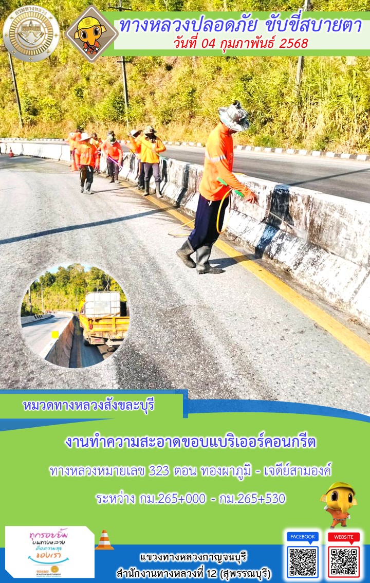 ข้อมูลภาพกิจกรรม : แขวงทางหลวงกาญจนบุรี โดยหมวดทางหลวงในสังกัด และงานอำนวยความปลอดภัยปฏิบัติงาน ประจำวันที่ 04 ก.พ. 68