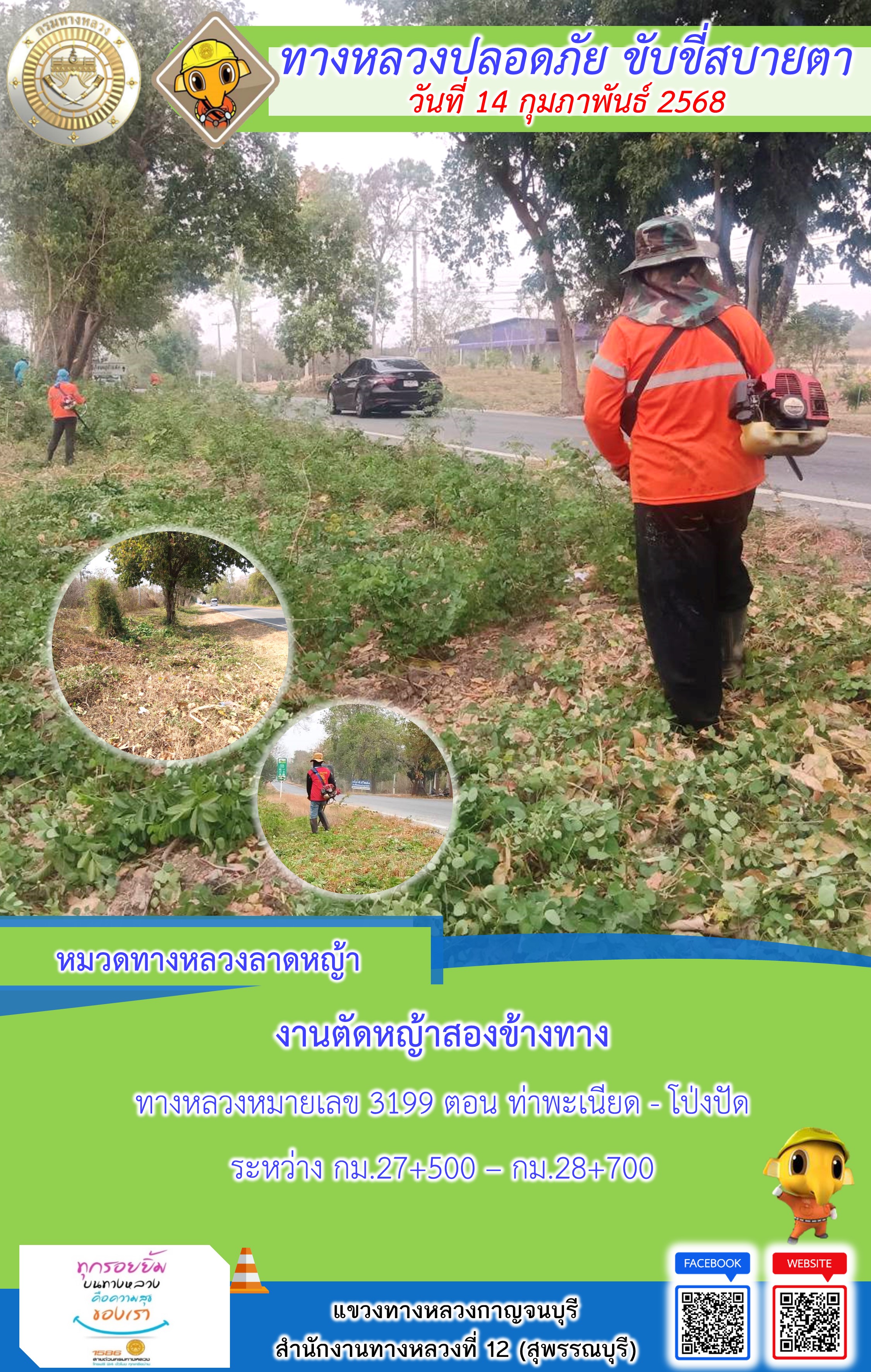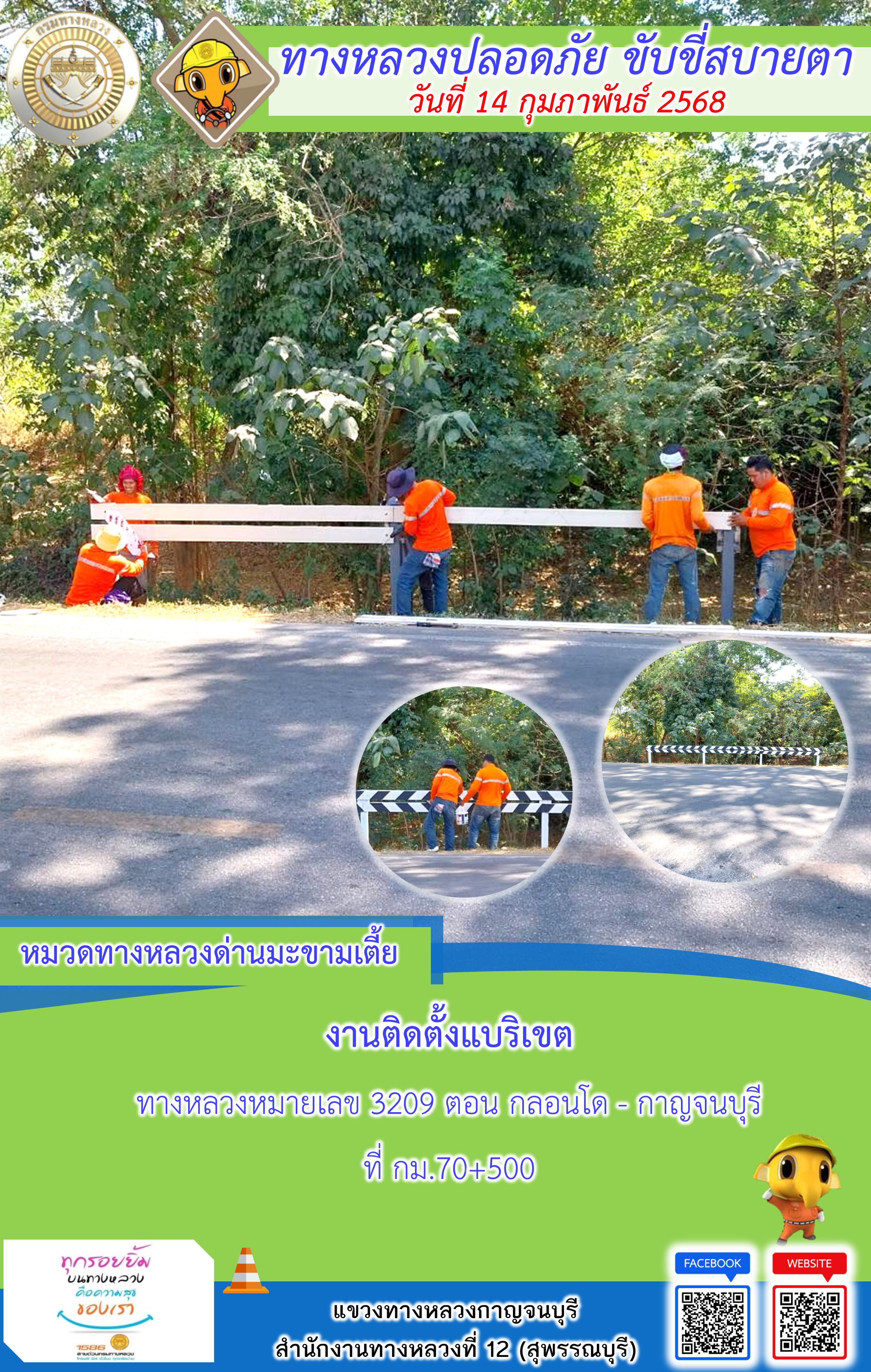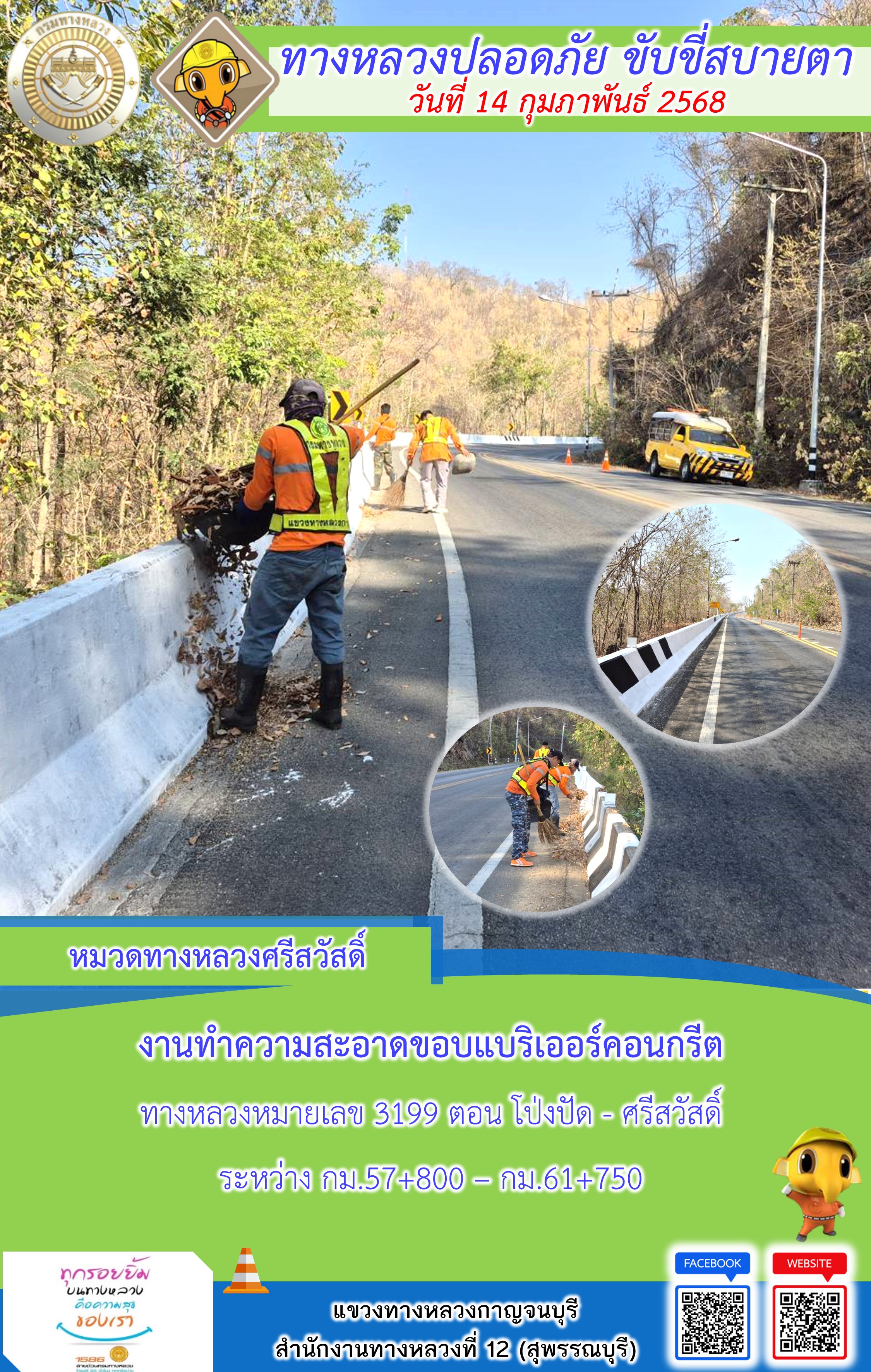 แขวงทางหลวงกาญจนบุรี โดยหมวดทางหลวงในสังกัด และงานอำนวยความปลอดภัยปฏิบัติงาน ประจำวันที่ 14 ก.พ. 68