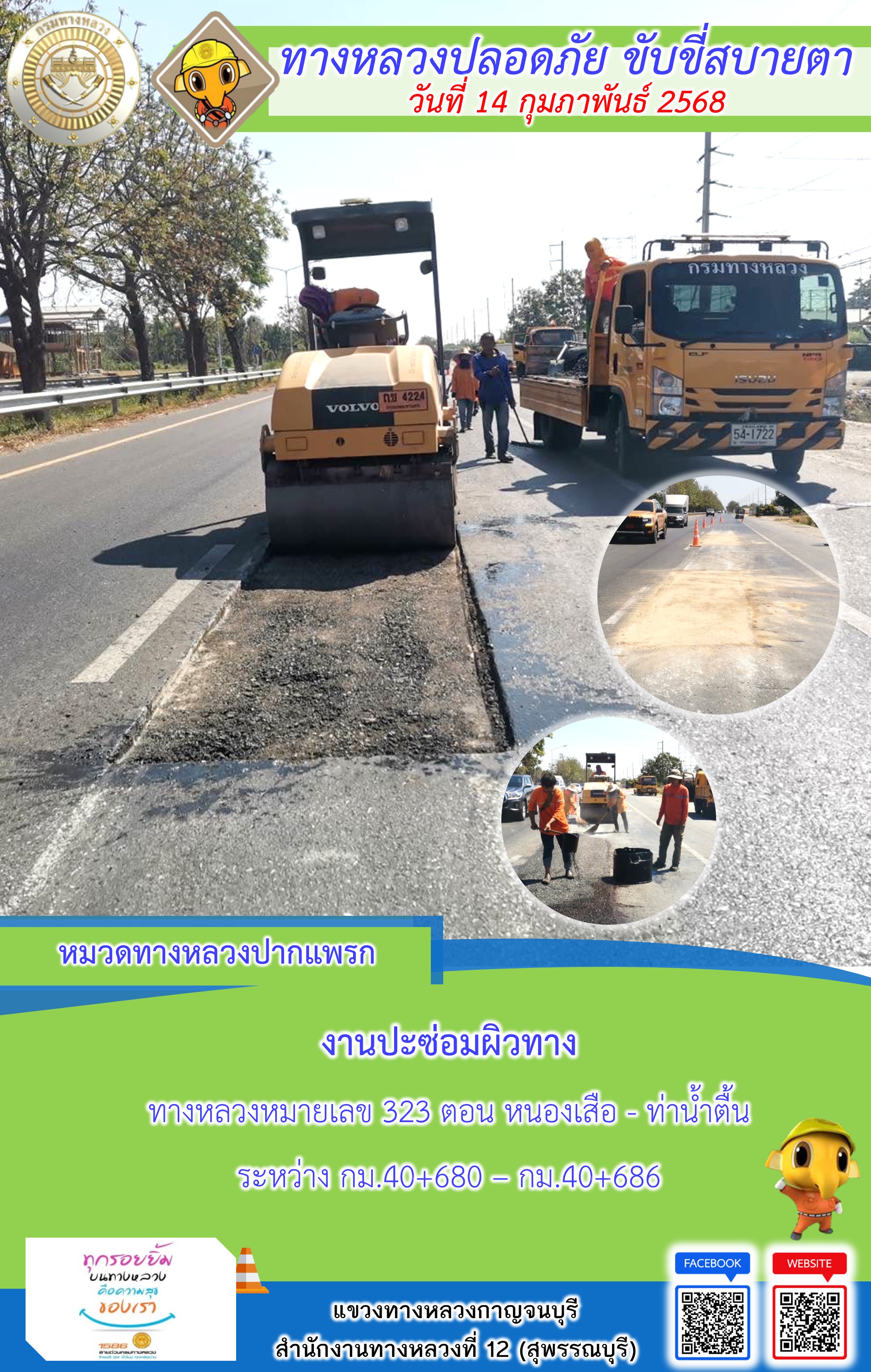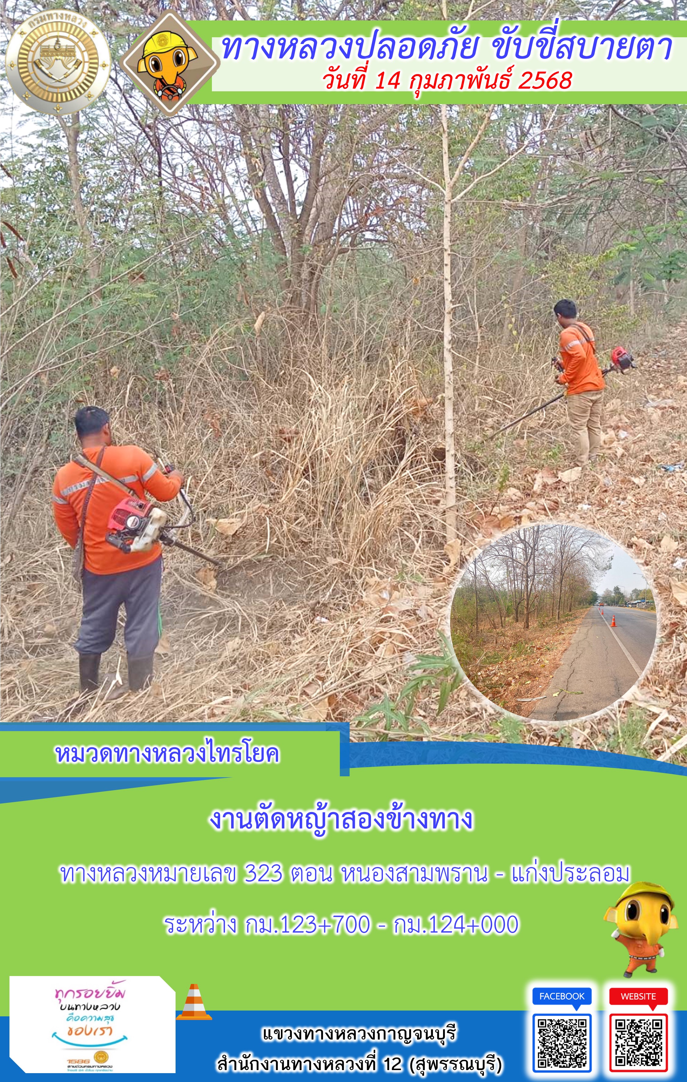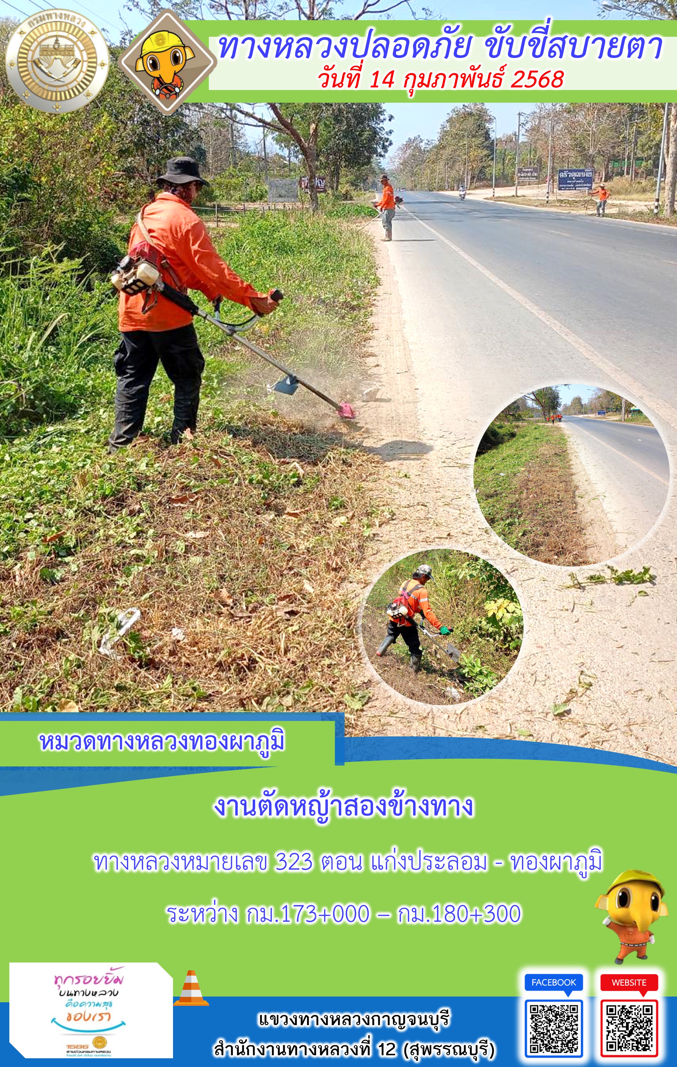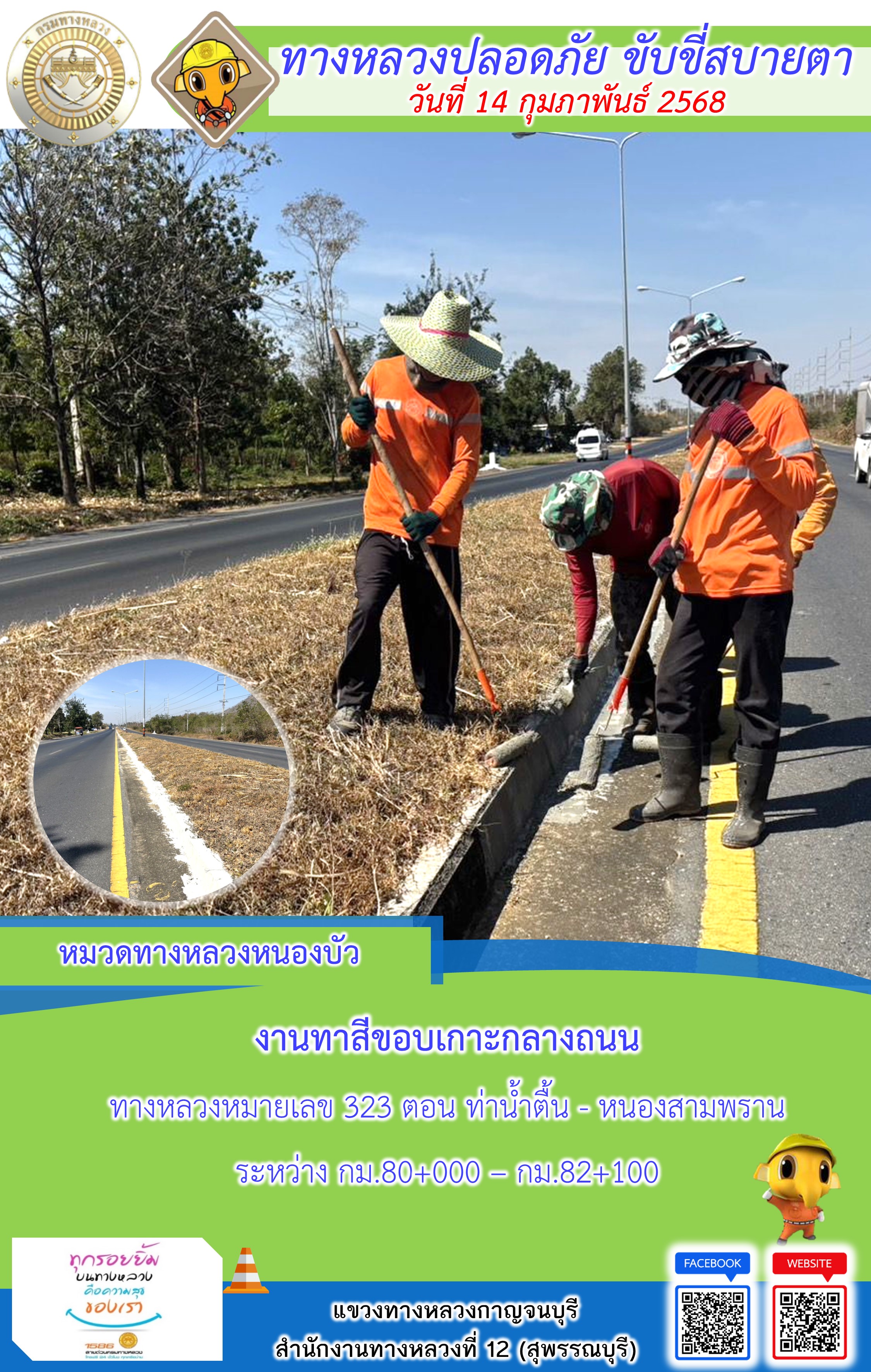 ข้อมูลภาพกิจกรรม : แขวงทางหลวงกาญจนบุรี โดยหมวดทางหลวงในสังกัด และงานอำนวยความปลอดภัยปฏิบัติงาน ประจำวันที่ 14 ก.พ. 68