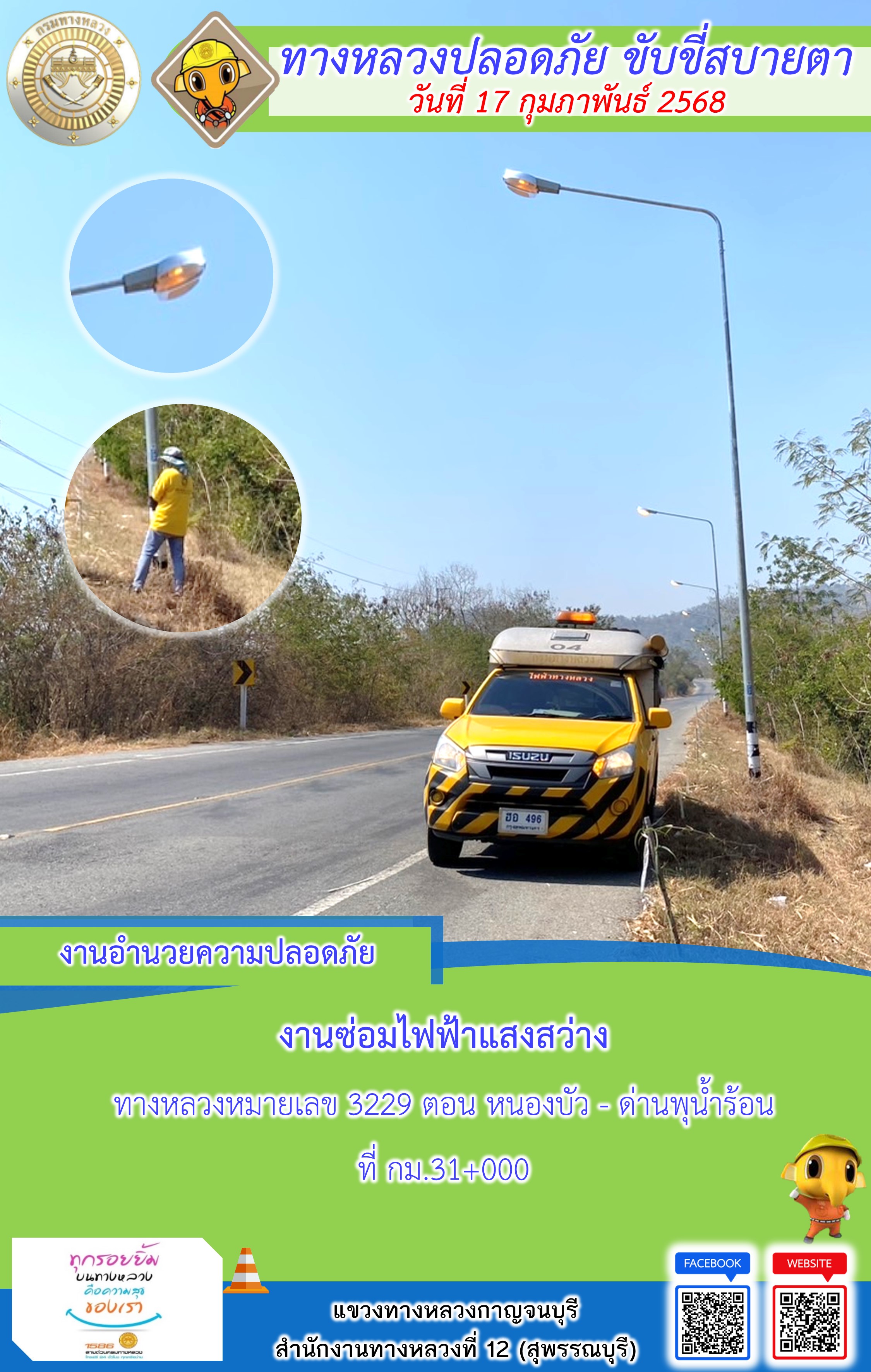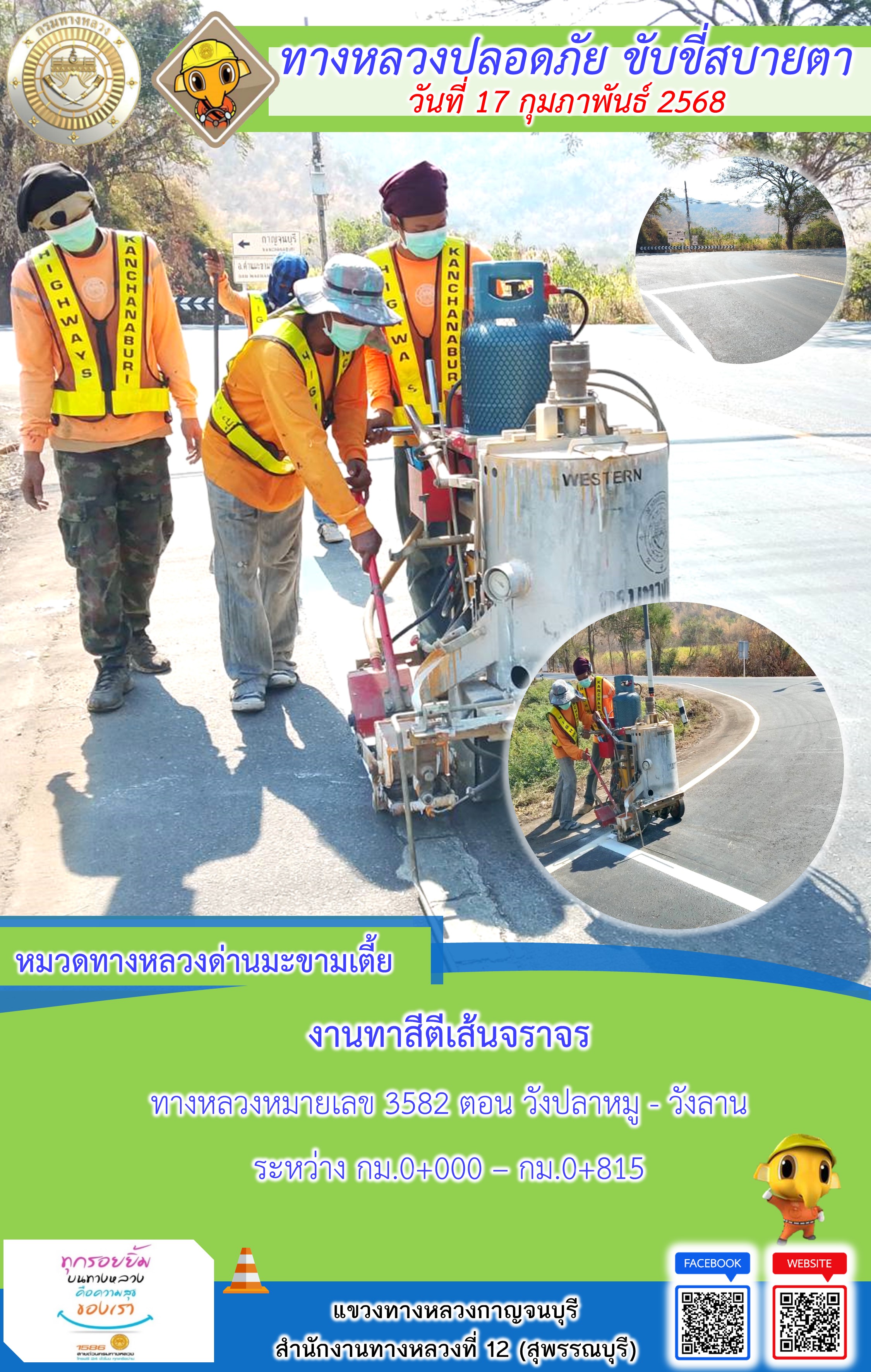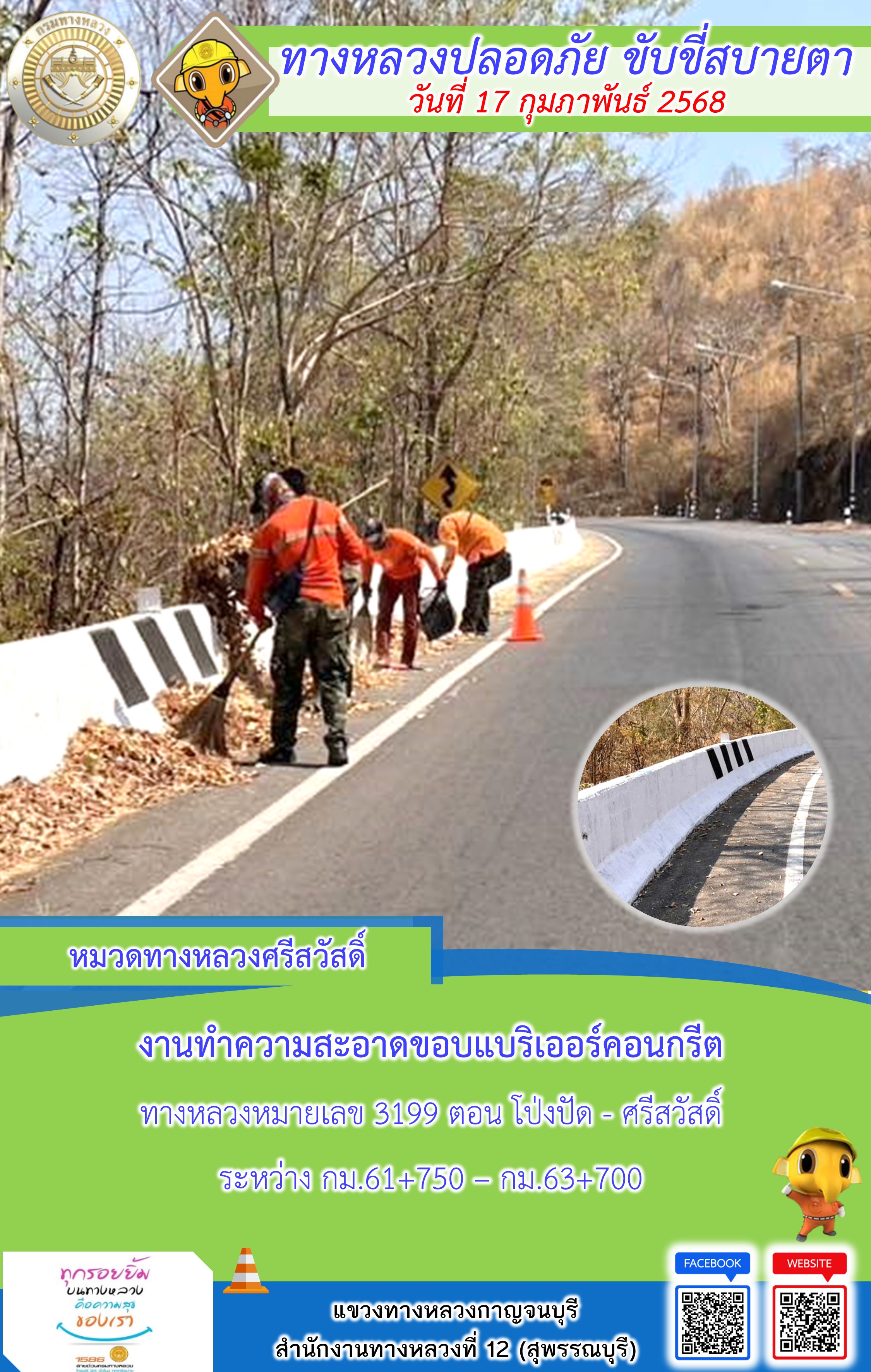 แขวงทางหลวงกาญจนบุรี โดยหมวดทางหลวงในสังกัด และงานอำนวยความปลอดภัยปฏิบัติงาน ประจำวันที่ 17 ก.พ. 68