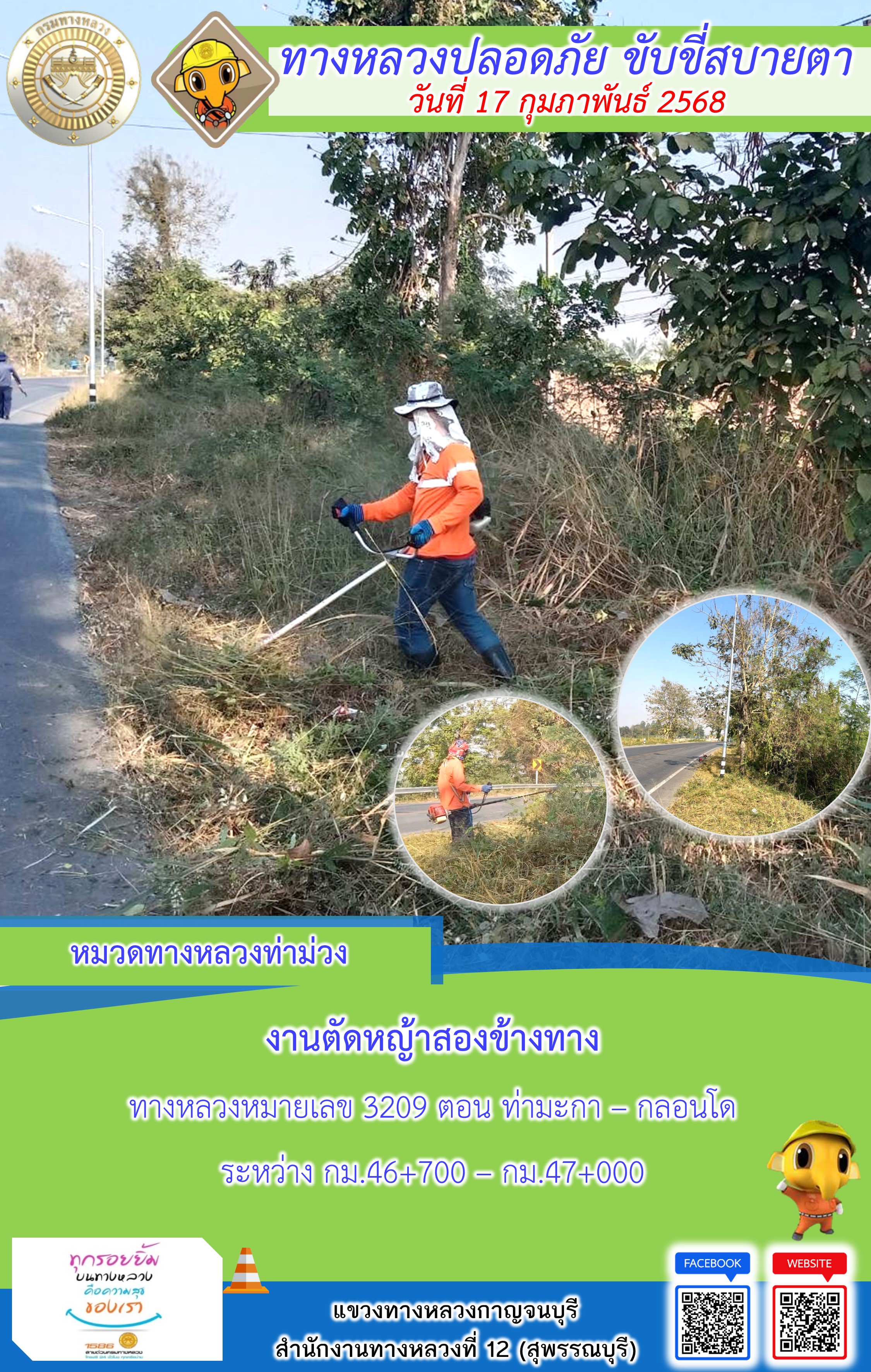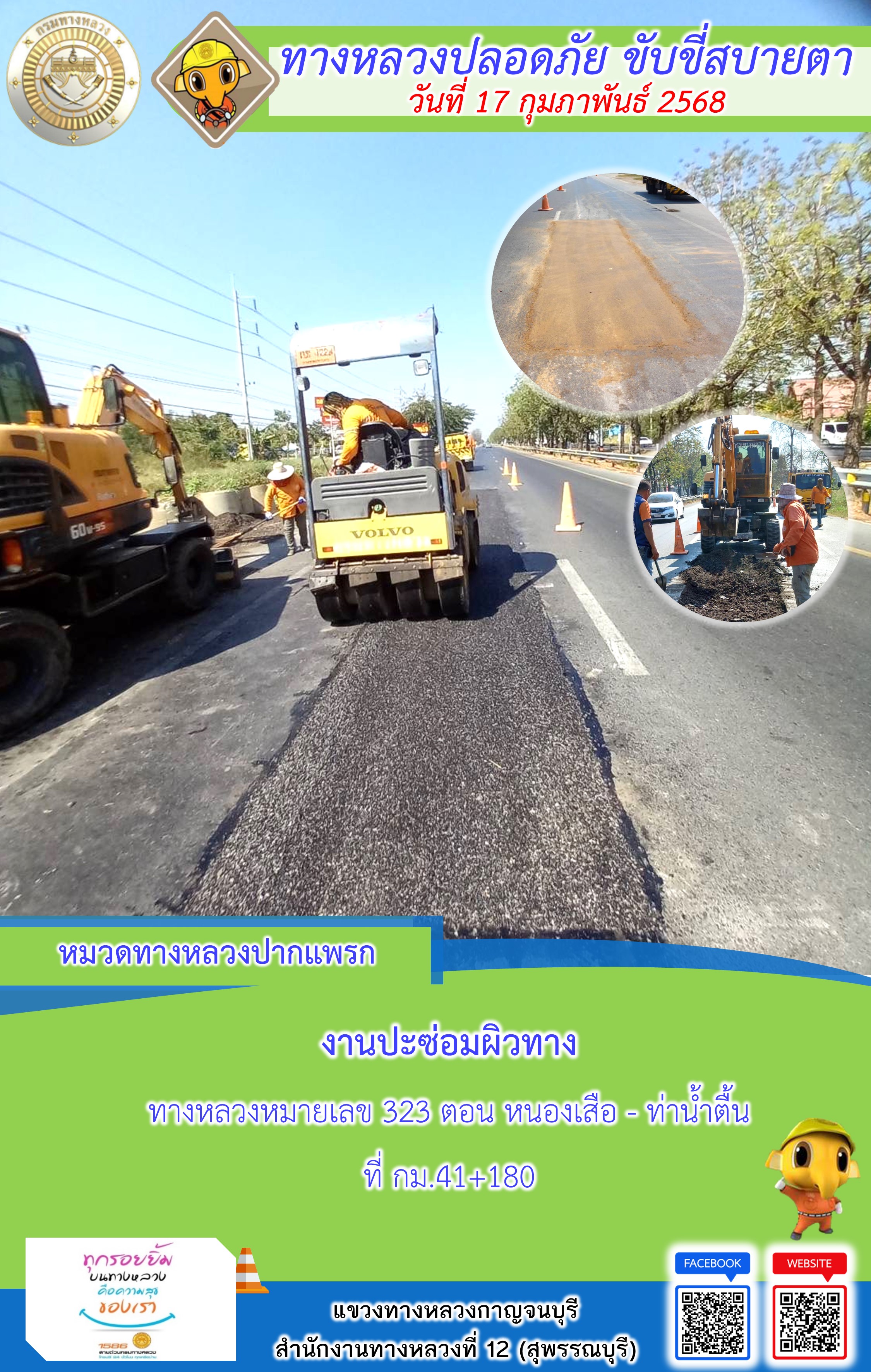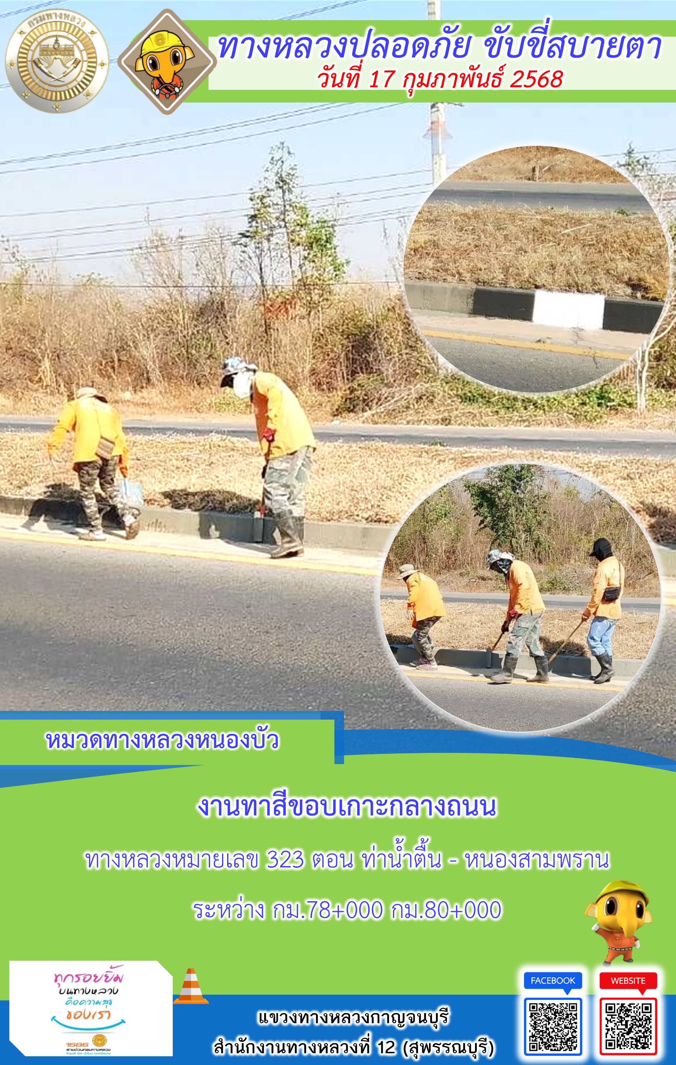 ข้อมูลภาพกิจกรรม : แขวงทางหลวงกาญจนบุรี โดยหมวดทางหลวงในสังกัด และงานอำนวยความปลอดภัยปฏิบัติงาน ประจำวันที่ 17 ก.พ. 68