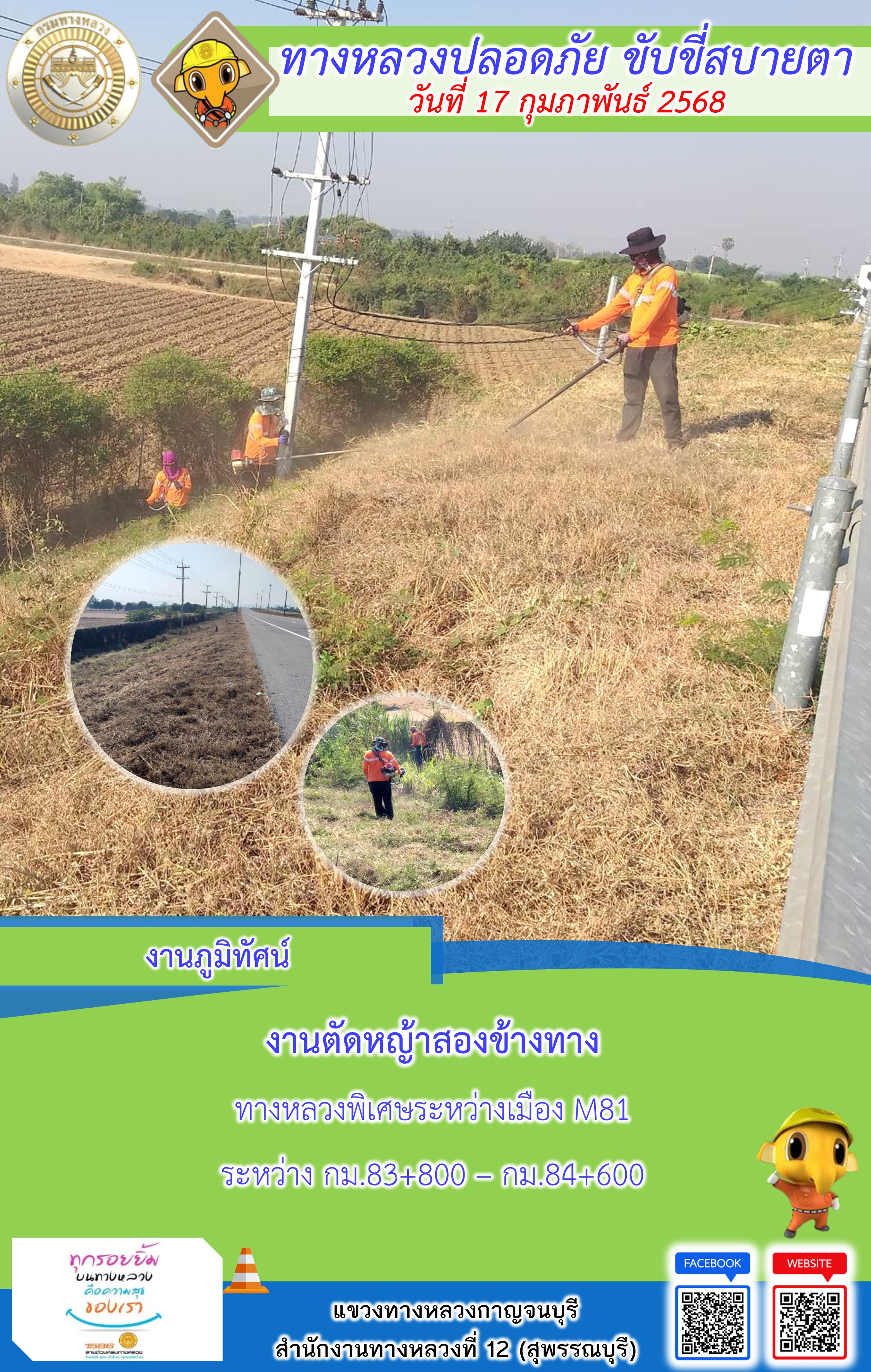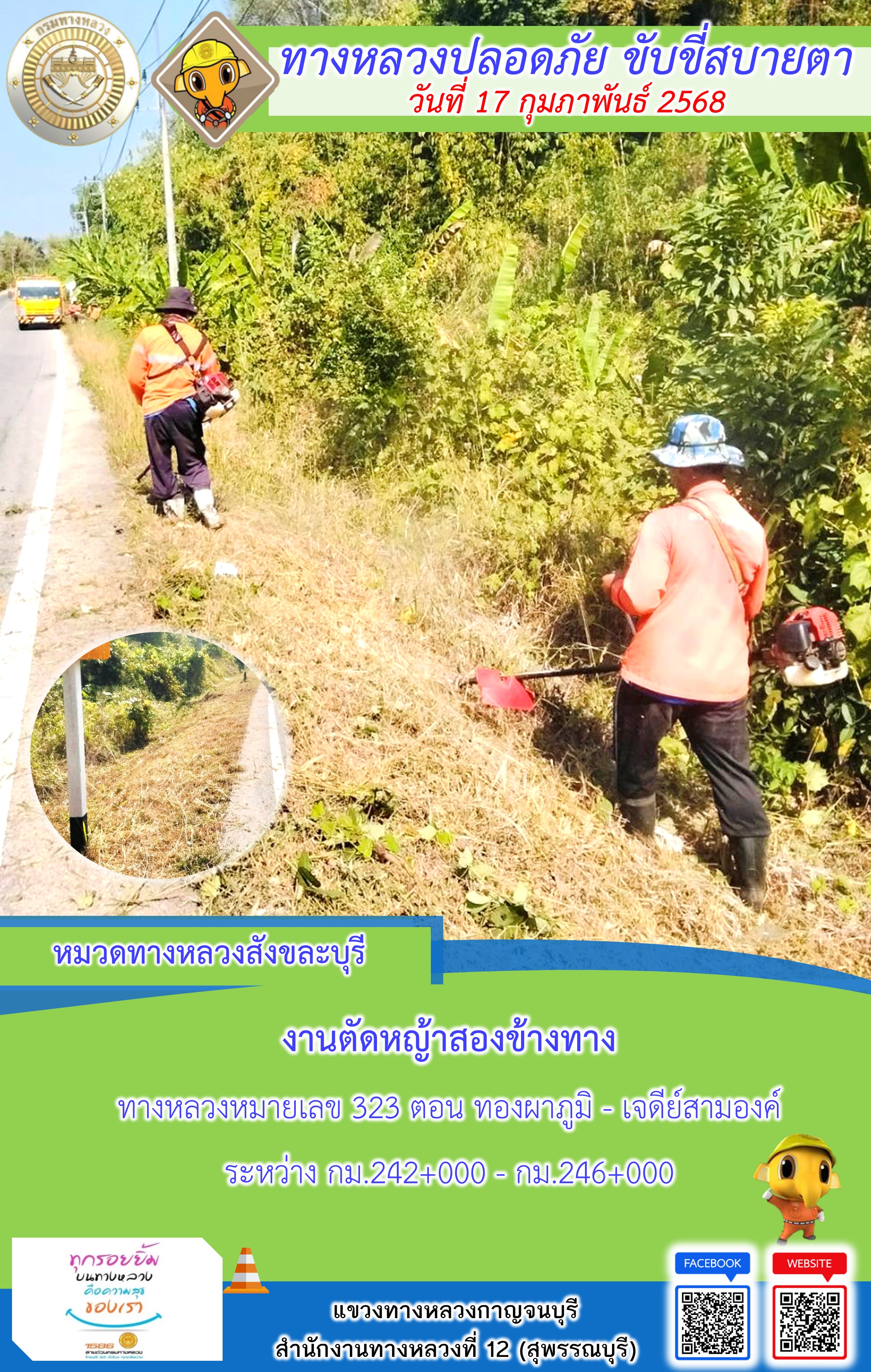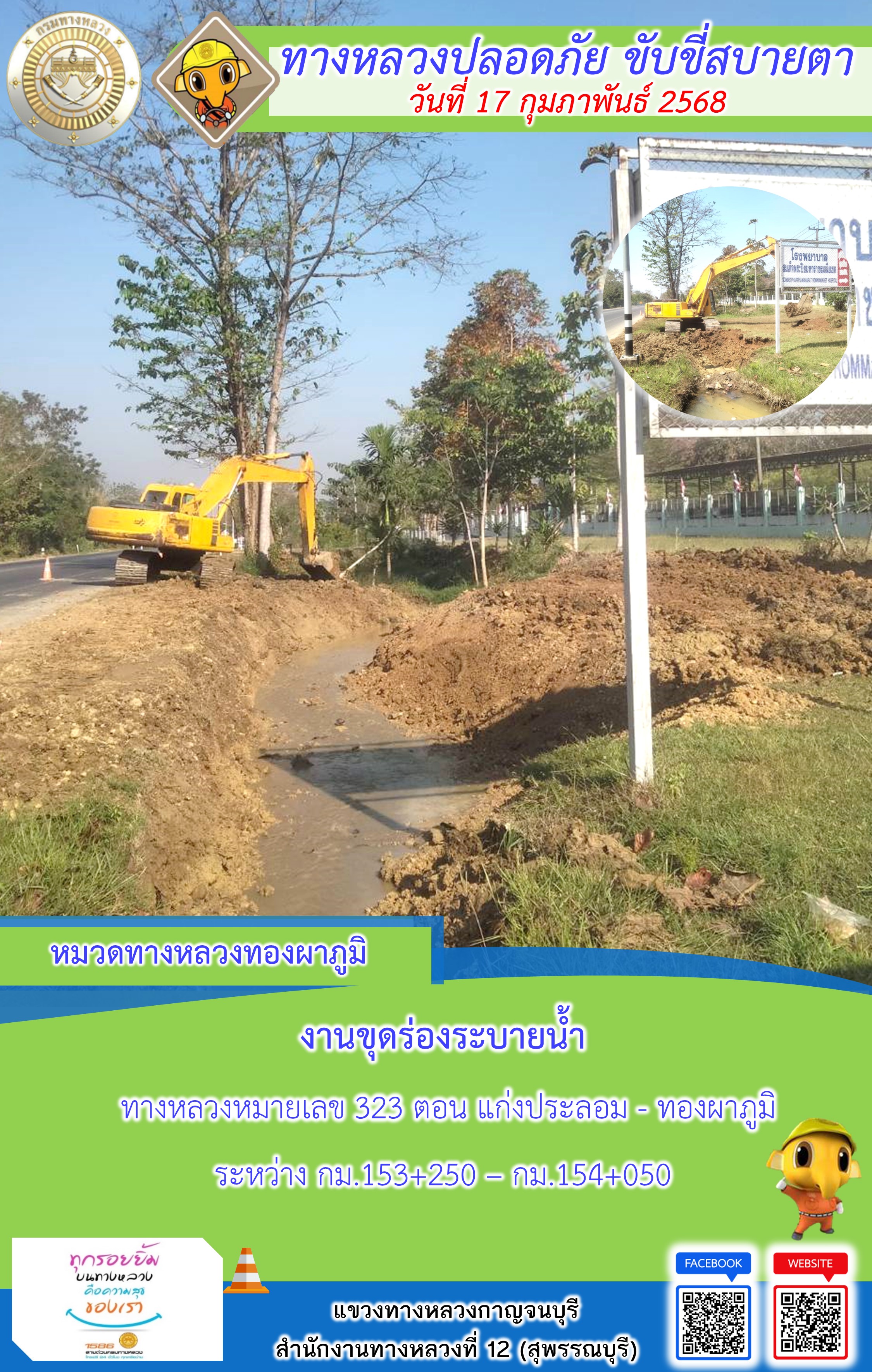 ข้อมูลภาพกิจกรรม : แขวงทางหลวงกาญจนบุรี โดยหมวดทางหลวงในสังกัด และงานอำนวยความปลอดภัยปฏิบัติงาน ประจำวันที่ 17 ก.พ. 68