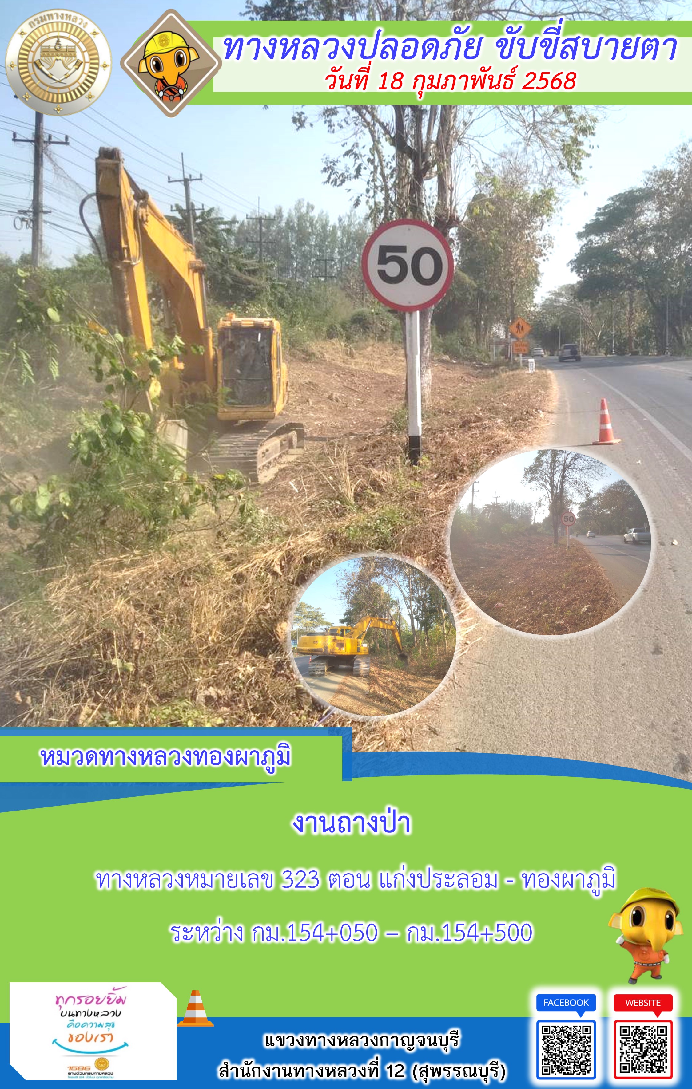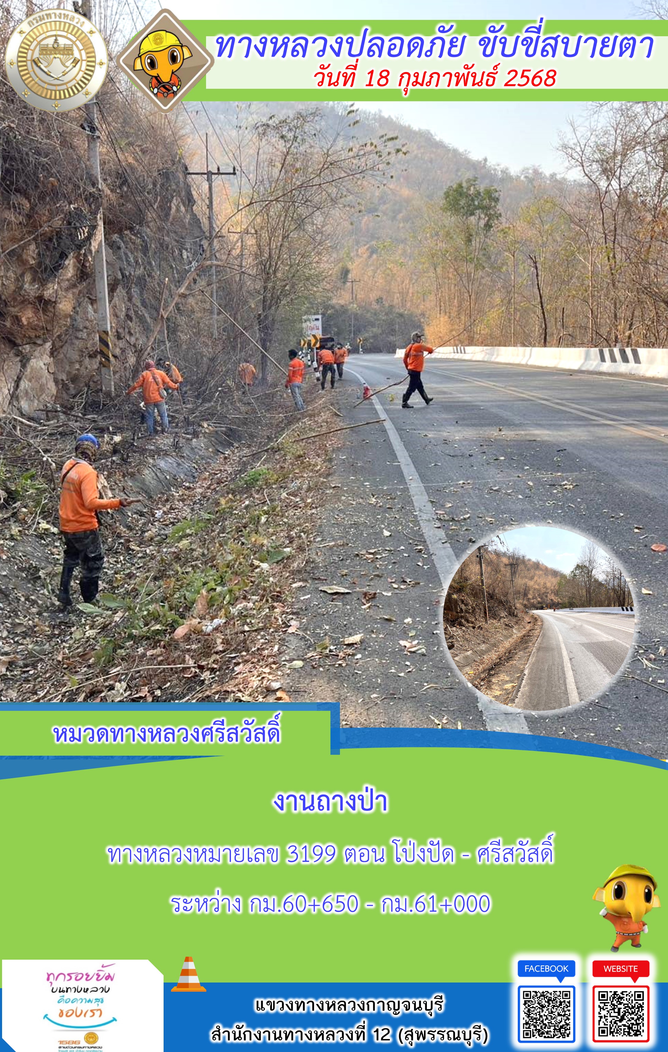 แขวงทางหลวงกาญจนบุรี โดยหมวดทางหลวงในสังกัด และงานอำนวยความปลอดภัยปฏิบัติงาน ประจำวันที่ 18 ก.พ. 68