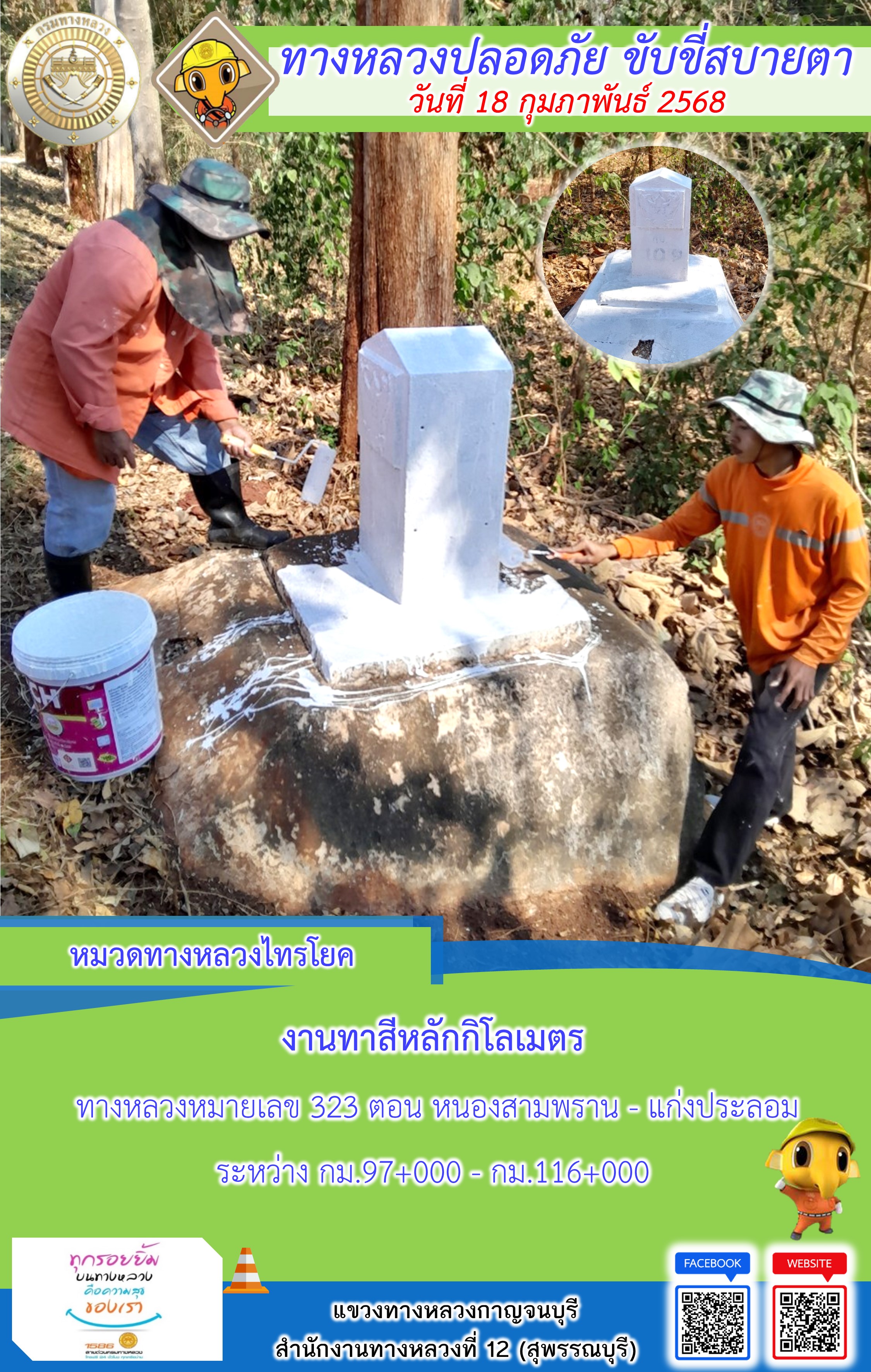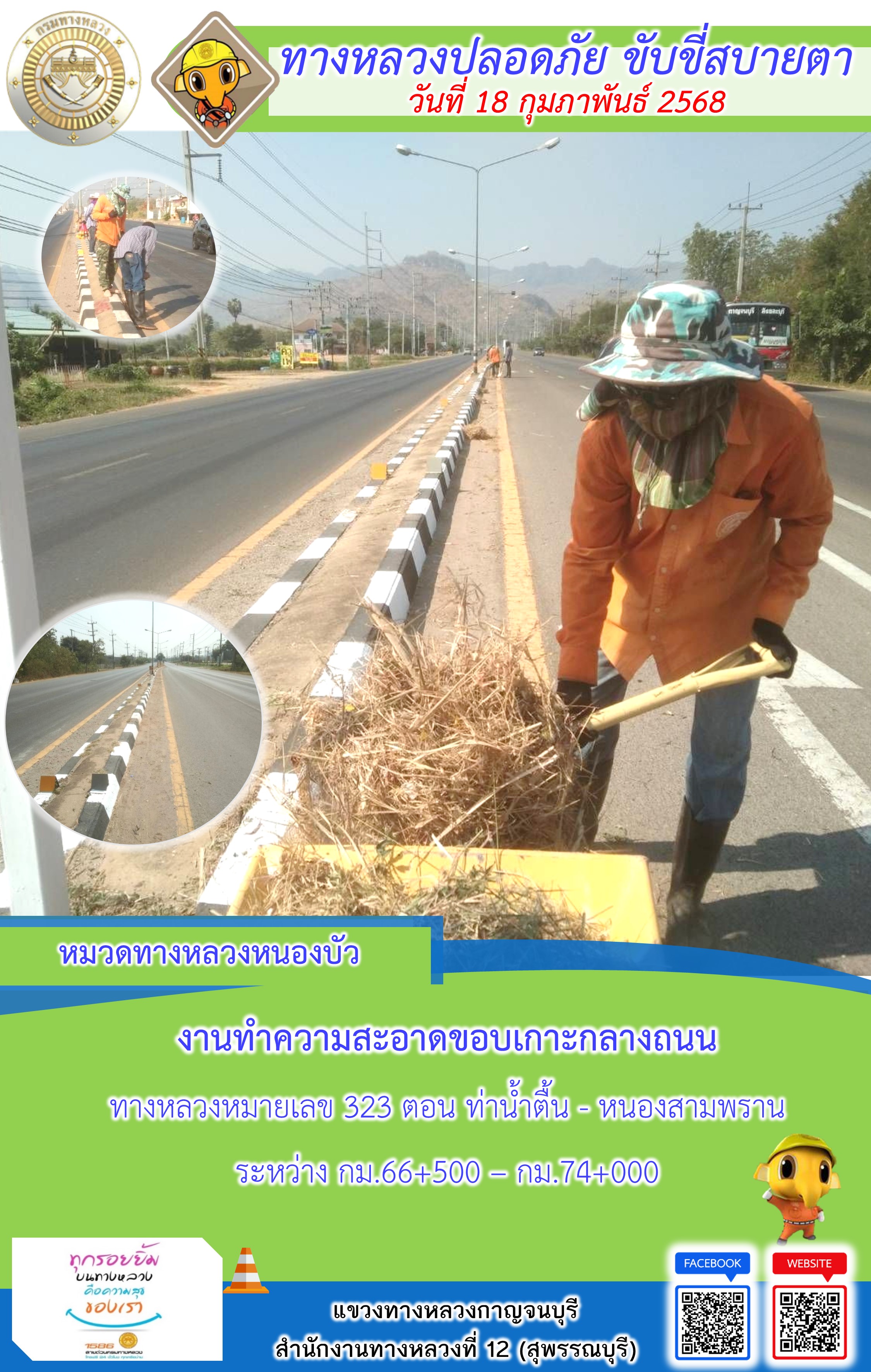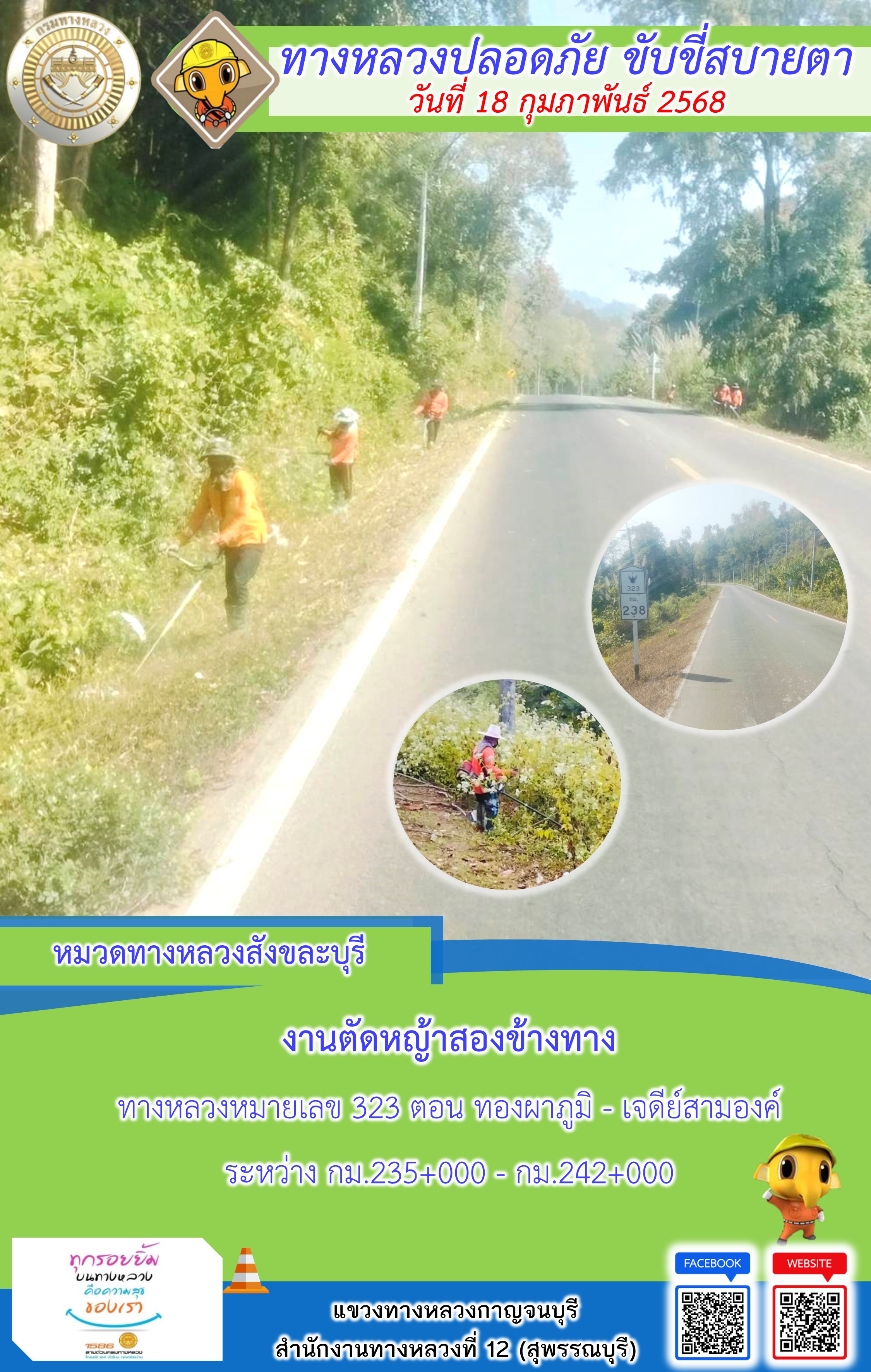 ข้อมูลภาพกิจกรรม : แขวงทางหลวงกาญจนบุรี โดยหมวดทางหลวงในสังกัด และงานอำนวยความปลอดภัยปฏิบัติงาน ประจำวันที่ 18 ก.พ. 68