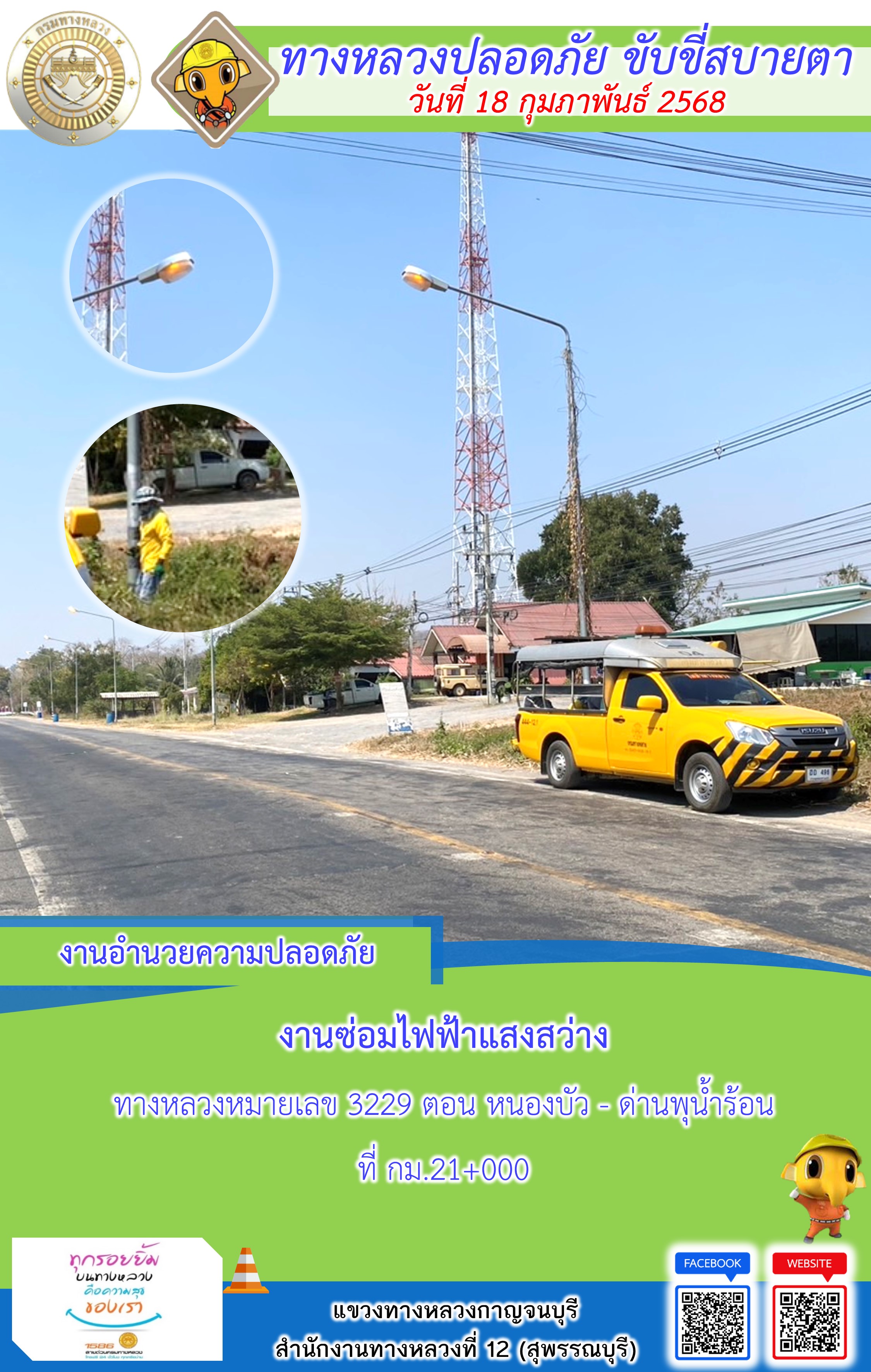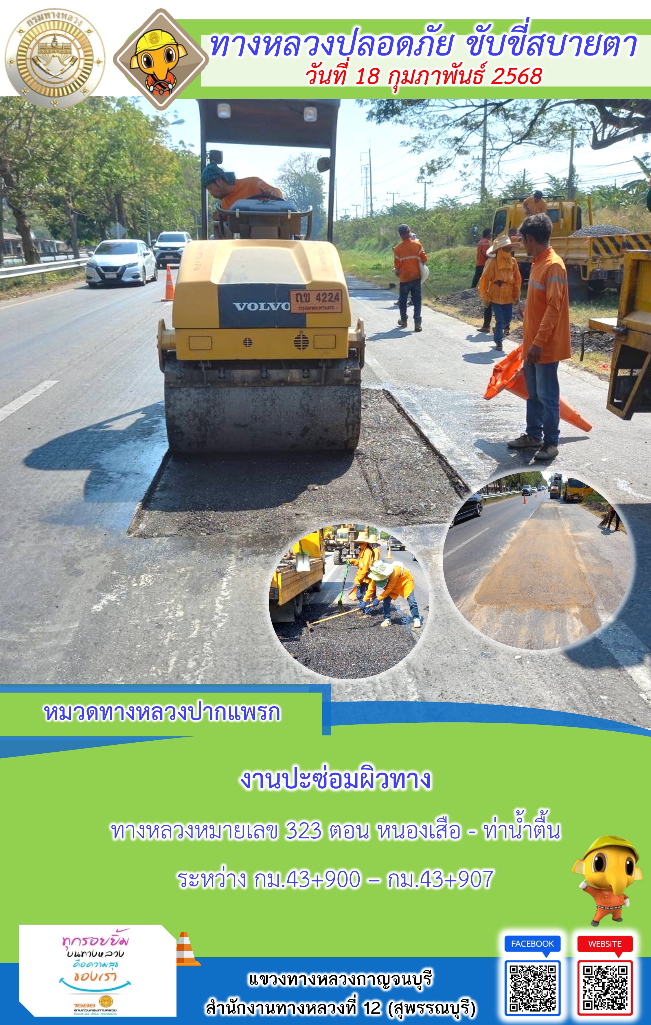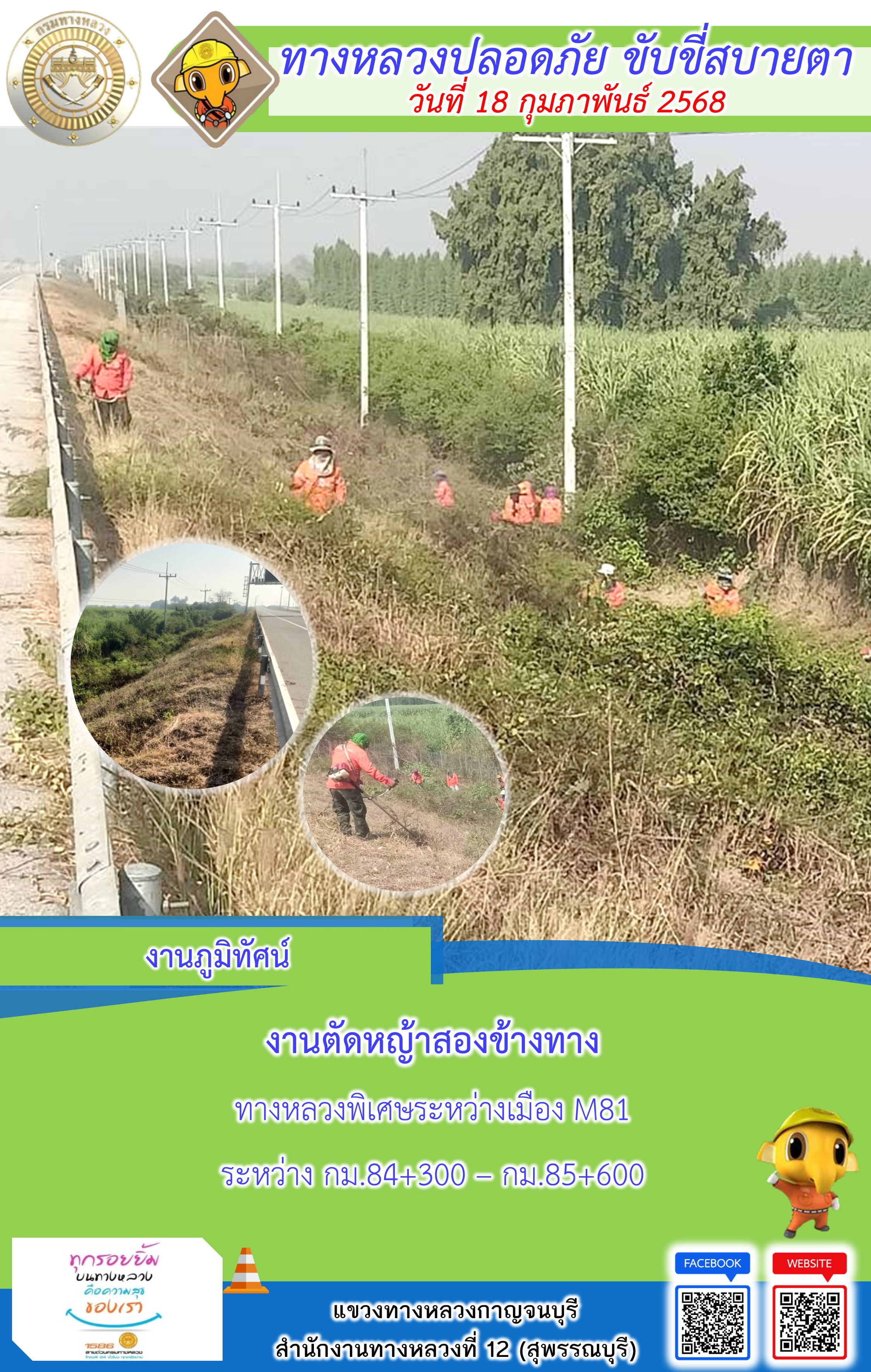 ข้อมูลภาพกิจกรรม : แขวงทางหลวงกาญจนบุรี โดยหมวดทางหลวงในสังกัด และงานอำนวยความปลอดภัยปฏิบัติงาน ประจำวันที่ 18 ก.พ. 68